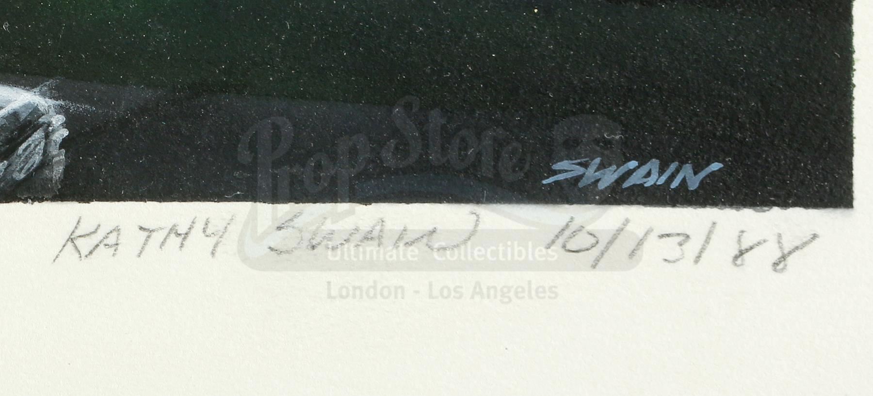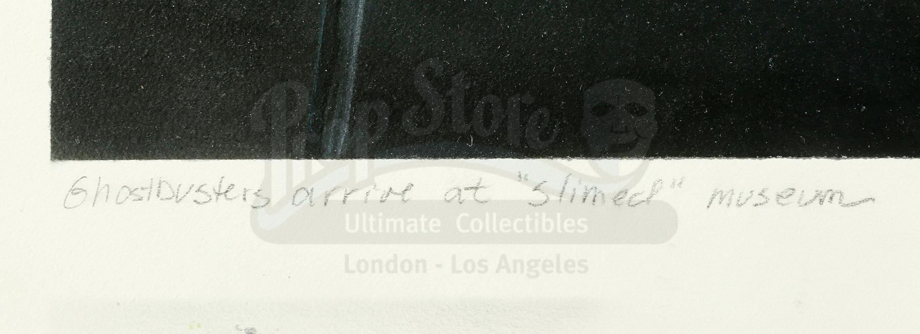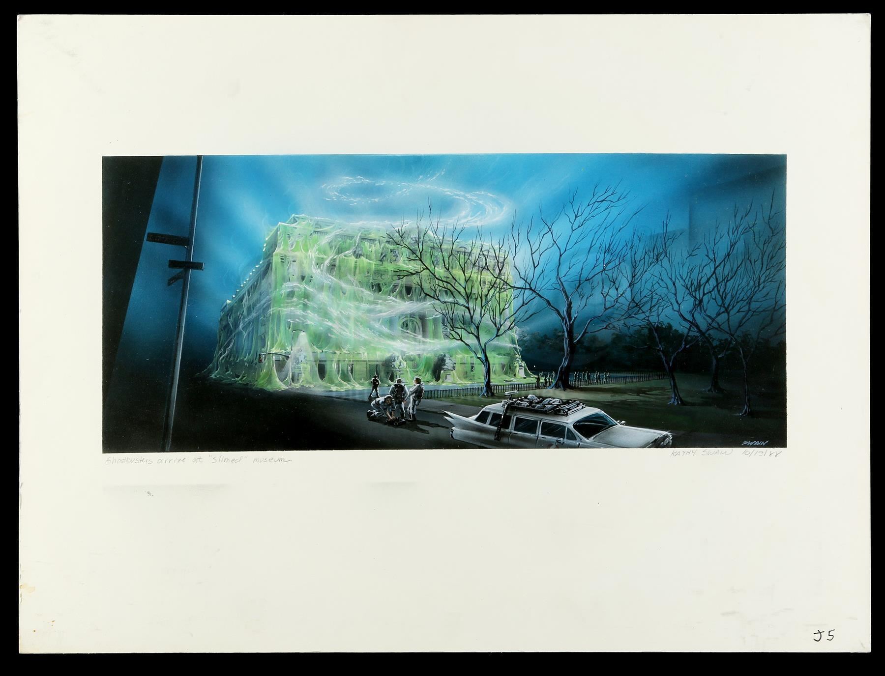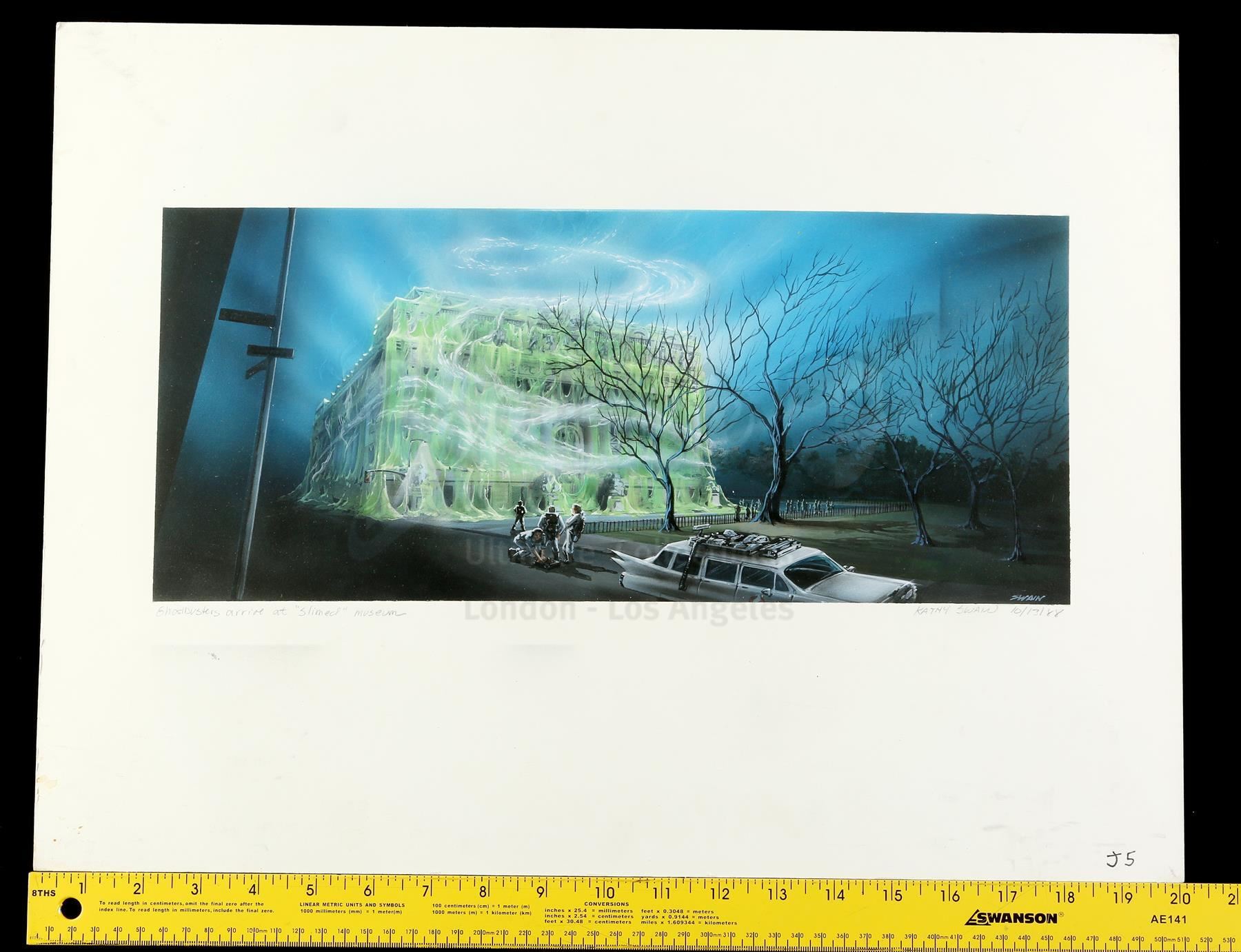This visual effects concept illustration of the Ghostbusters and the Ecto-1 in front of a slime-covered museum is rendered in mixed media on board signed and dated "10/13/88" by Industrial Light & Magic (ILM) concept artist Kathleen Swain and labeled "Ghostbusters arrive at 'Slimed' museum" and "J5". It is in good overall condition with some wear and discoloration from age and use.