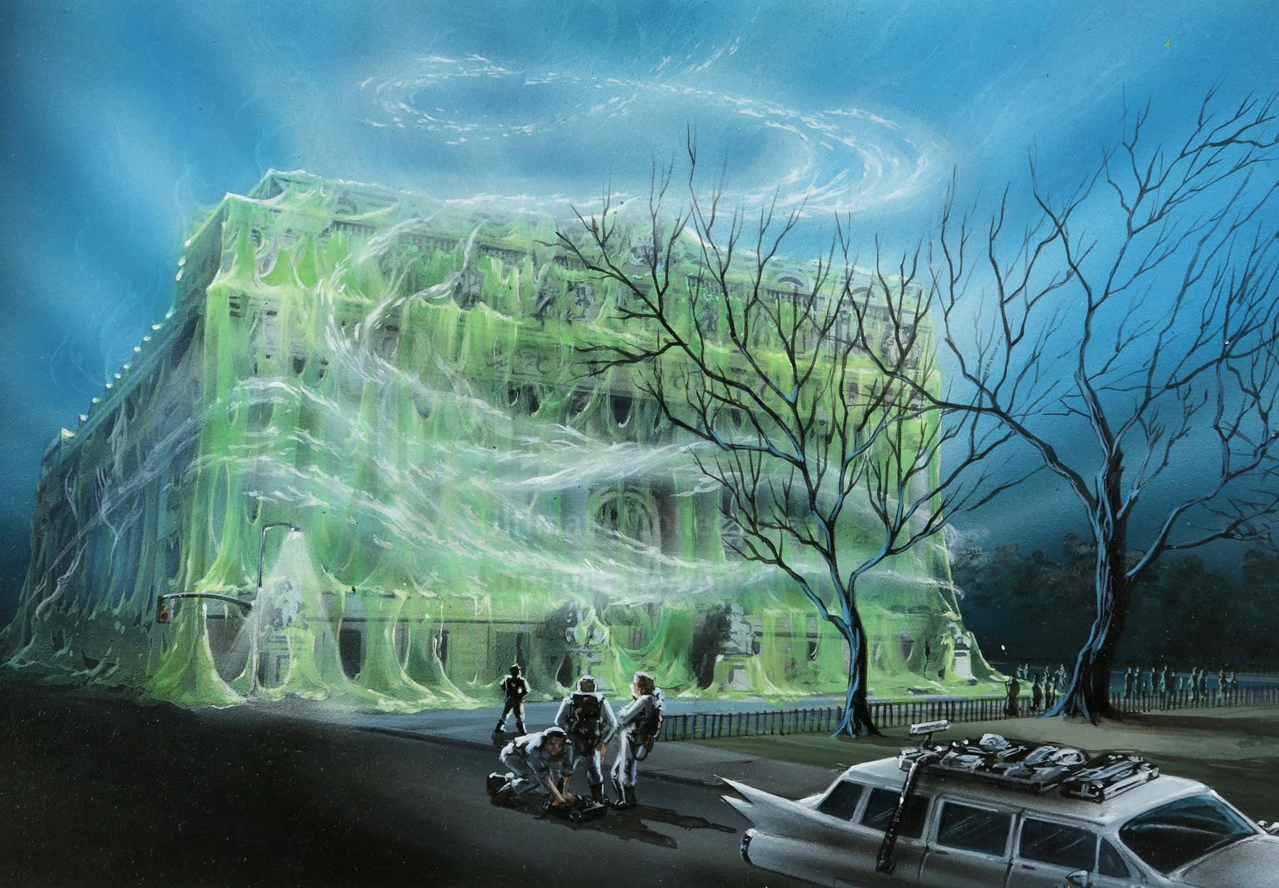 A hand-painted museum in slime illustration from Ivan Reitman's action-comedy sequel Ghostbusters 2. Tyrant sorcerer Vigo coated the museum where his spirit hung in a painting in an evil supernatural slime.