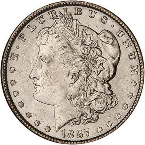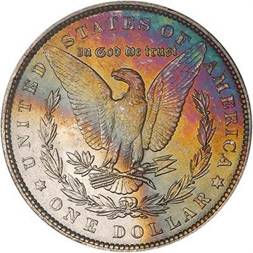 1887 Morgan Dollar. The mint luster rolls around the obverse with a pleasing cartwheel sheen if somewhat bagmarked, while the reverse attracted all the marvelous shades of the rainbow like a color-magnet on this handsome offering from the Battle Creek consignment. (#7172)<p><i>from The Battle Creek Collection, Part III</i>