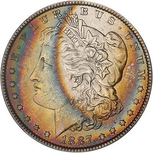 1887 Morgan Dollar. The surface of the obverse is filled with the clamor of competing shades of toning: gold, deep blue, sky blue, and thin bands of magenta. (#7172)<p><i>from The Battle Creek Collection, Part III</i>