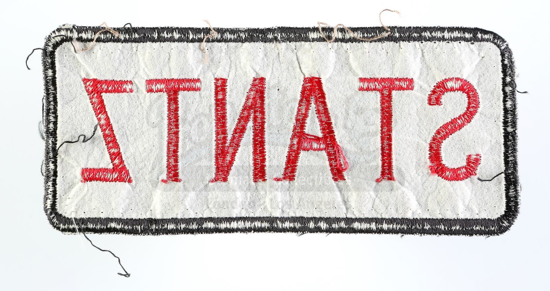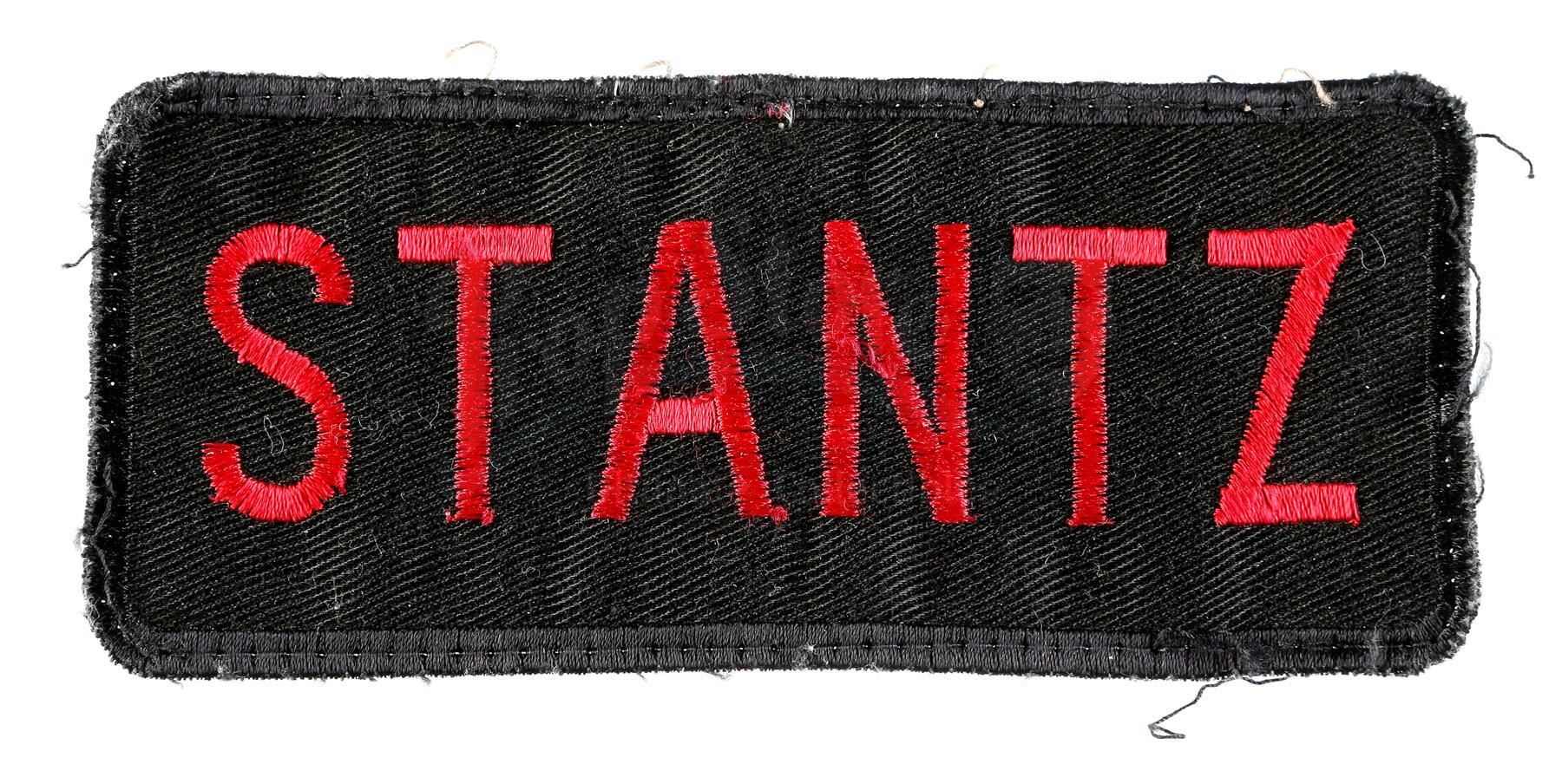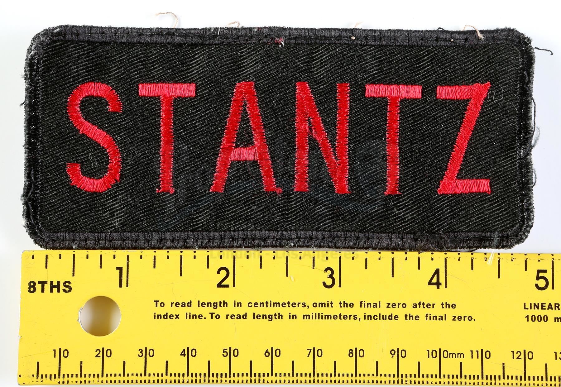 This custom-made fabric embroidered patch features a stitching of the name "STANTZ" in dark red against a black, rectangular border. This patch was removed from a uniform and retains the black threads that originally held it in place. It is in good overall condition with minor wear.