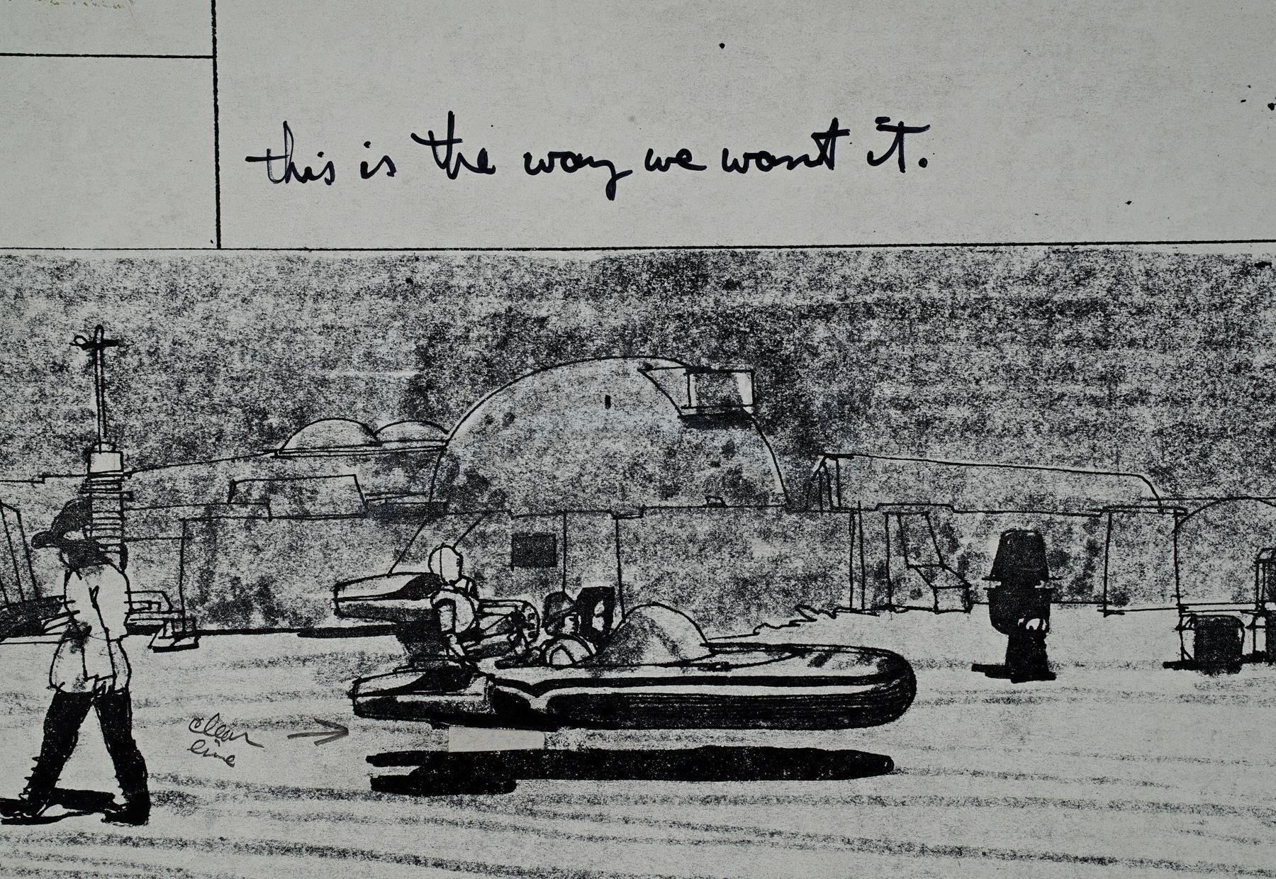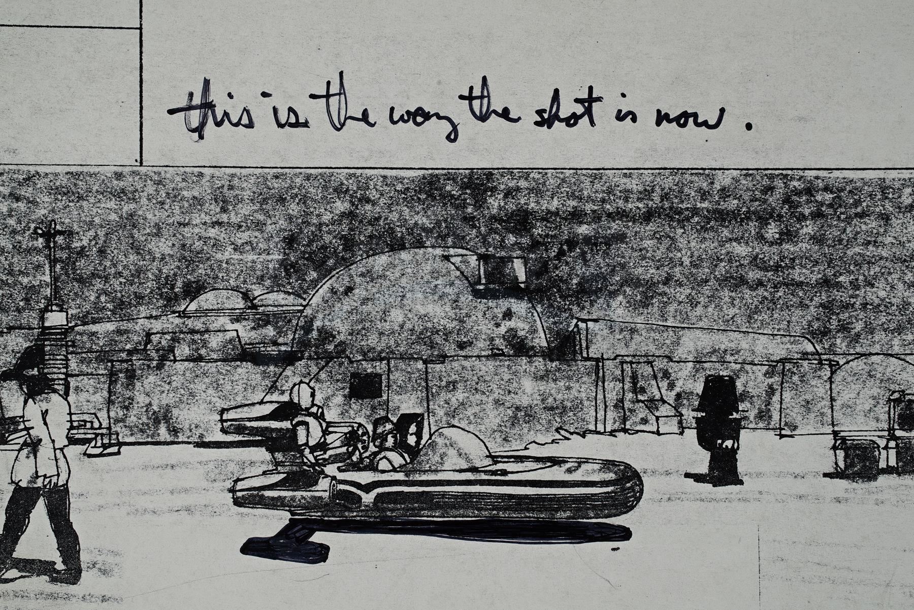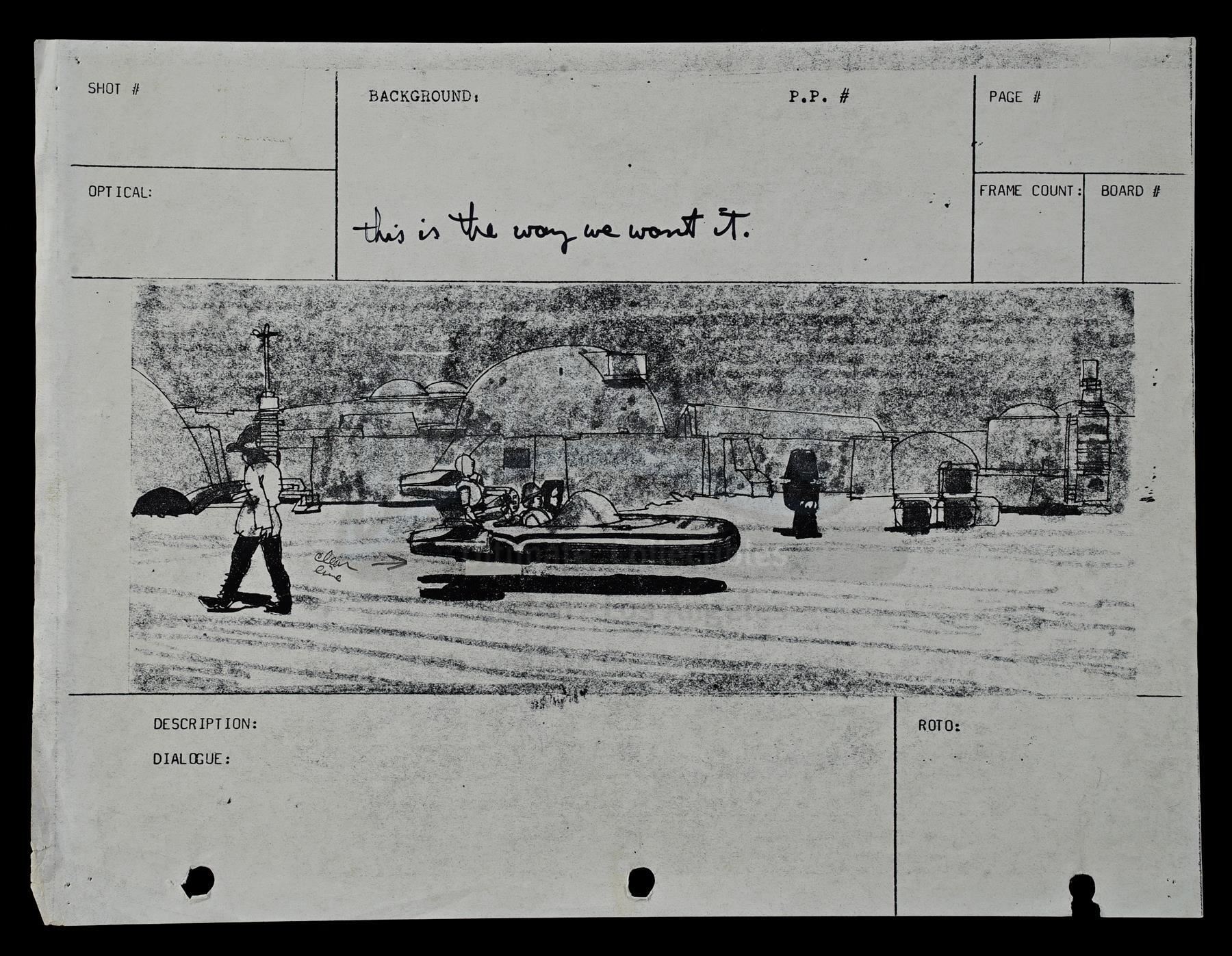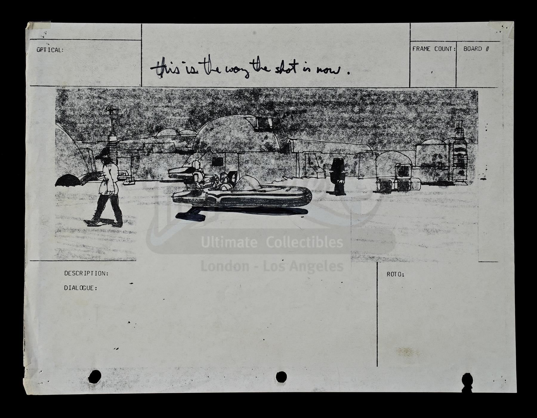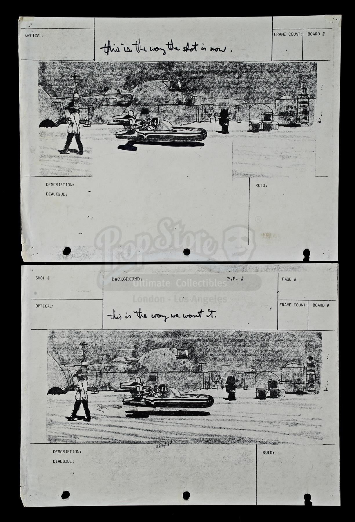 This lot will be auctioned on Tuesday, June 29th. The auction will begin at 9:00am PDT and lots are sold sequentially via live auctioneer; tune in to the live streaming broadcast on auction day to follow the pace. Note other lots in the auction may close on June 30th or July 1st. A pair of production-used storyboards with George Lucas' handwritten inscriptions from the production of Lucas' Star Wars: A New Hope. These printed copy storyboards were made at Industrial Light & Magic (ILM) during postproduction on the original film. The matched pair of boards are notably marked up by Lucas himself, who used them as a tool to illustrate changes needed to a shot of the landspeeder cruising into Mos Eisley. One of the boards is inscribed "This is the way the shot is now," and features a hand-drawn shadow of a landspeeder that rests just underneath the craft. The other board is inscribed "This is the way we want it," and features a space between the landspeeder's underside and the shadow below. Lucas has added in pencil "clear line" with an arrow showing the separation he was seeking for the shadow. Each storyboard is in a standard piece of letter paper with pinholes in the corners where it was previously mounted, and 3-holes punched for fitting into a binder. The pages are in overall good condition with folding and wear to the edges from handling. Dimensions: 8.5" x 11" (22 cm x 28 cm) Estimate: $1,500 - 2,500