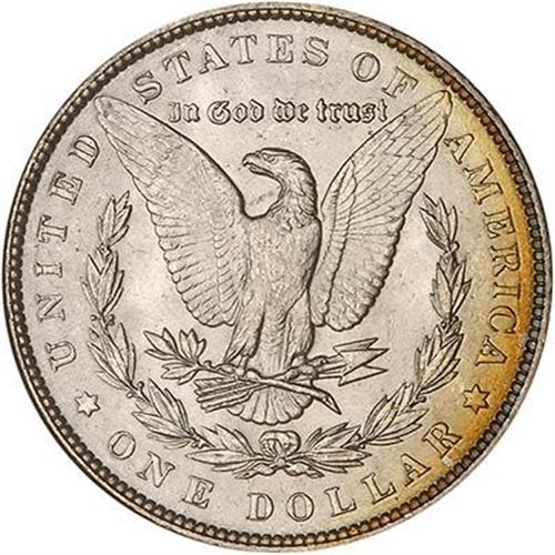 1887 Morgan Dollar. Here, as well, the caucophany of colors plays tricks with your eyes, wherein all the subtle shades of blue, gold, and purple dance around in a shimmering, iridescent display across the obverse, leaving the reverse for the most part silvery white. (#7172)<p><i>from The Battle Creek Collection, Part III</i>