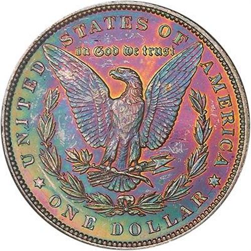 1887 Morgan Dollar. A few light marks on the face. However, it is the reverse where this coin really comes to life in the mottled shades of purple and blue. Take out a color chart if you dare, and try to count the thousands of nuances and shadings the make up the toning of this piece. (#7172)<p><i>from The Battle Creek Collection, Part III</i>