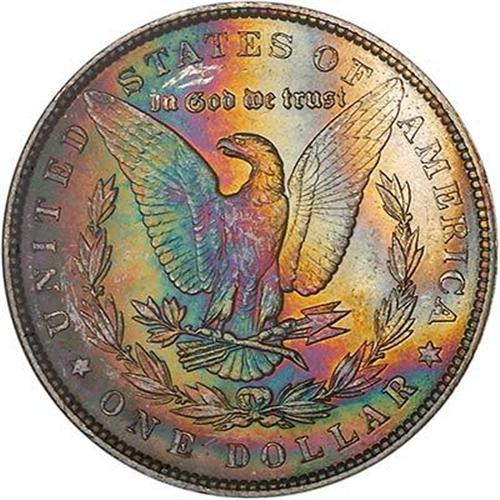 1887 Morgan Dollar. Rainbow shades throught the reverse with some additional toning on the obverse too. The sudden flinging up of these magnificent colors is what causes the heart to pound faster and the prospective bidder to hold on tighter to his bidder card -- the only thing assuring him a chance at ownership. (#7172)<p><i>from The Battle Creek Collection, Part III</i>