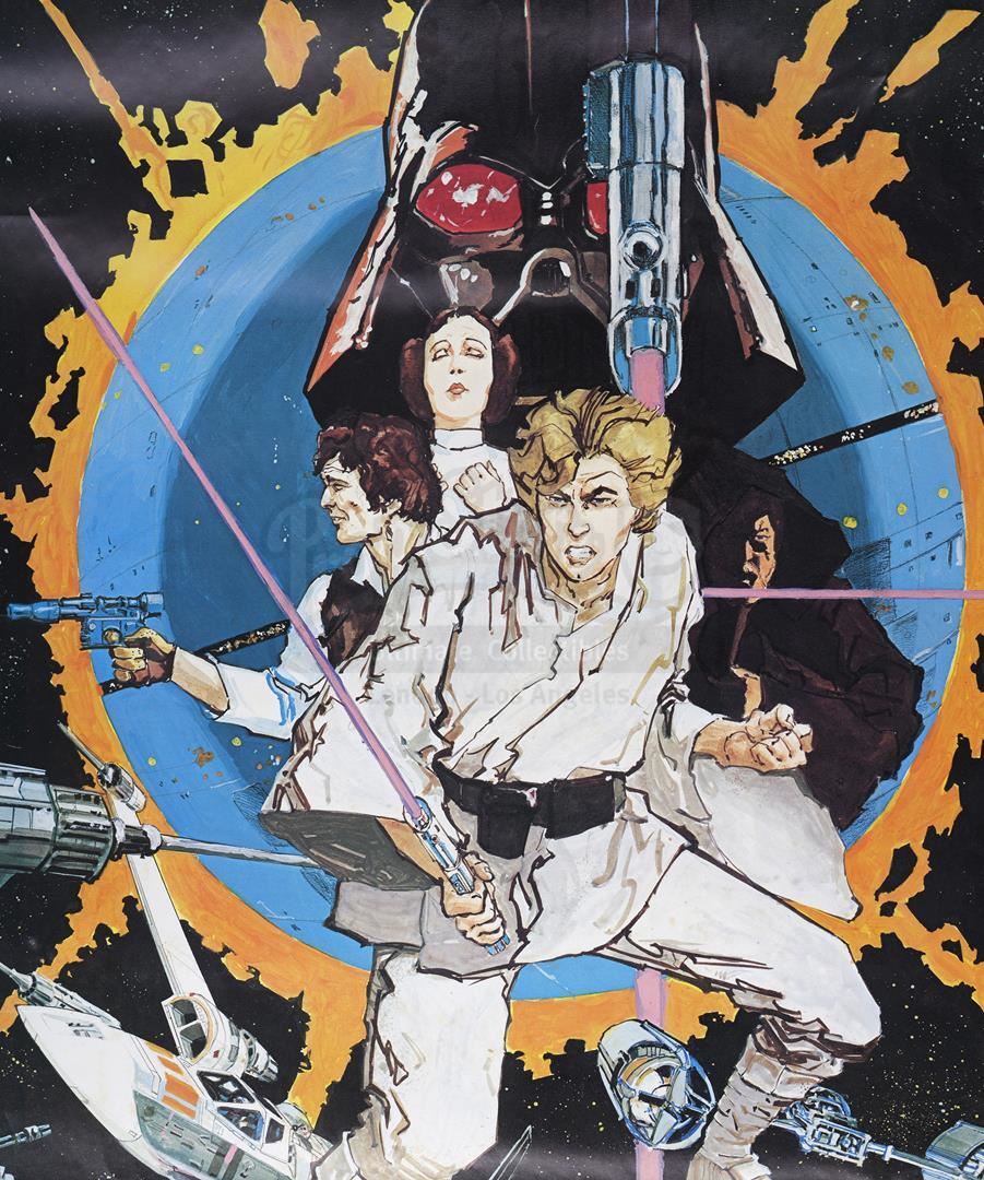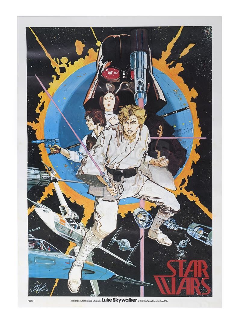 This lot will be auctioned on Tuesday, June 29th. The auction will begin at 9:00am PDT and lots are sold sequentially via live auctioneer; tune in to the live streaming broadcast on auction day to follow the pace. Note other lots in the auction may close on June 30th or July 1st. A special "Chaykin" Comic-Con one-sheet made for the promotion of George Lucas' Star Wars: A New Hope. Howard Chaykin was commissioned by 20th Century Fox to illustrate a Star Wars-centric comic book series, which led to his designing this colorful vintage poster. Though not the official theatrical poster, this style of poster-now known as the "Chaykin"- is considered the first-ever Star Wars poster, with copies sold for around a dollar at San Diego Comic-Con in 1976. This full-color one-sheet comes from the collection of Return of the Jedi producer Howard Kazanjian. It is in excellent overall condition with only light creasing and edge wear from being rolled for storage. Dimensions: 29" x 20" (73.75 cm x 51 cm) Estimate: $3,000 - 5,000