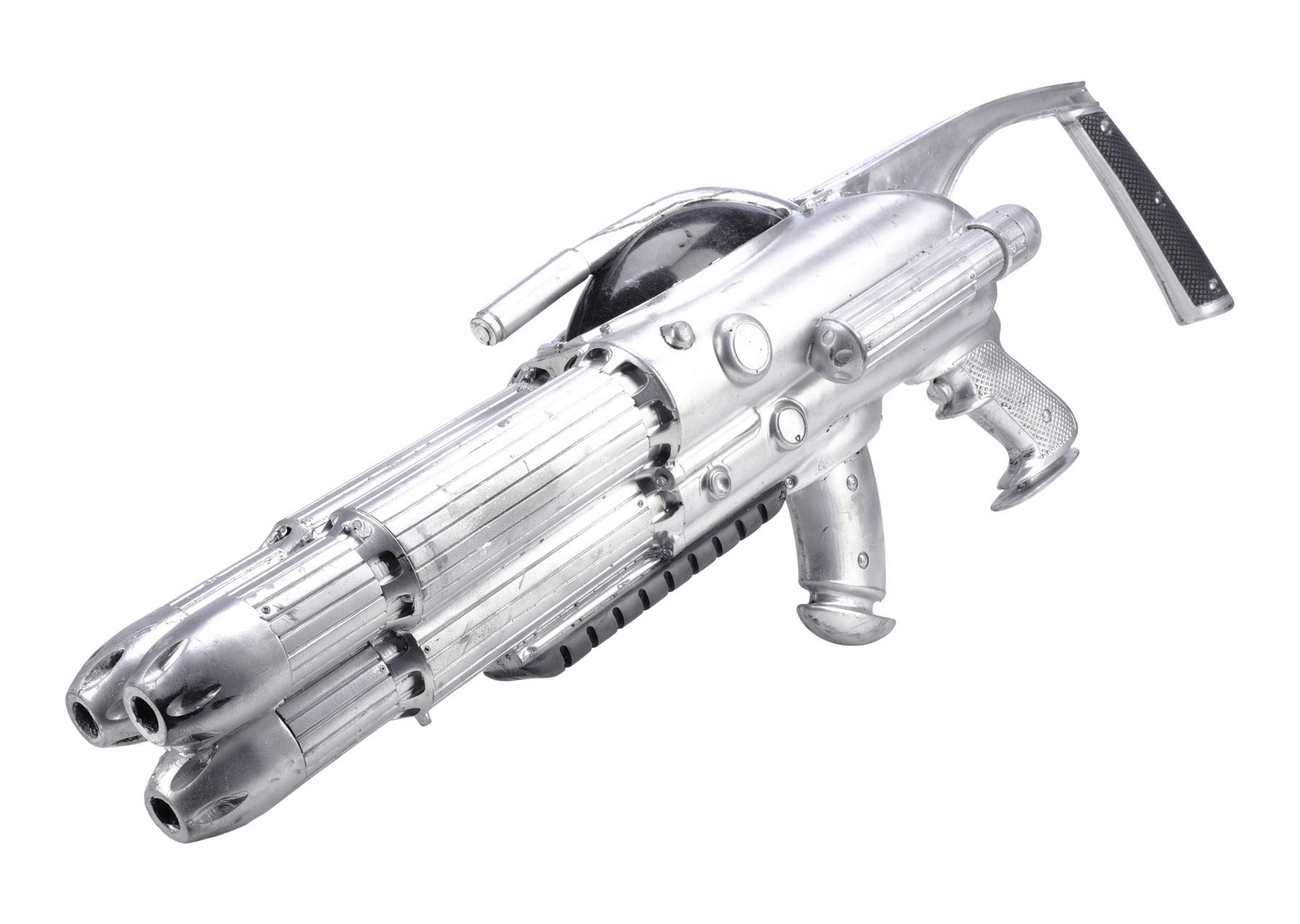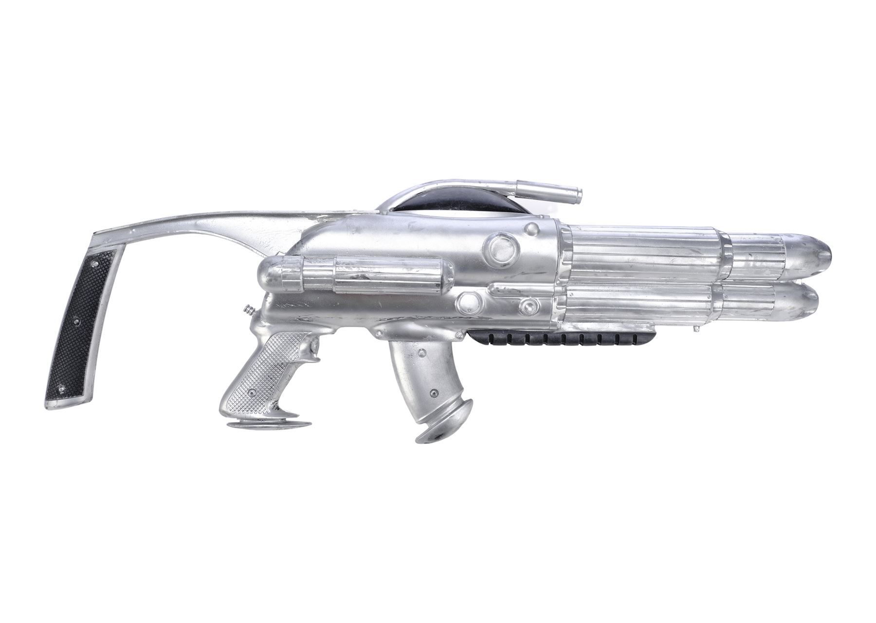 MEN IN BLACK II (2002) - Agent Jay's Stunt Three-Barrel Blaster - Agent Jay's stunt three-barrel blaster from Barry Sonnenfeld's action comedy Men in Black II. Agent Kay and Agent Jay went to Agent Kay's former apartment to acquire weapons to rescue Laura from Serleena.