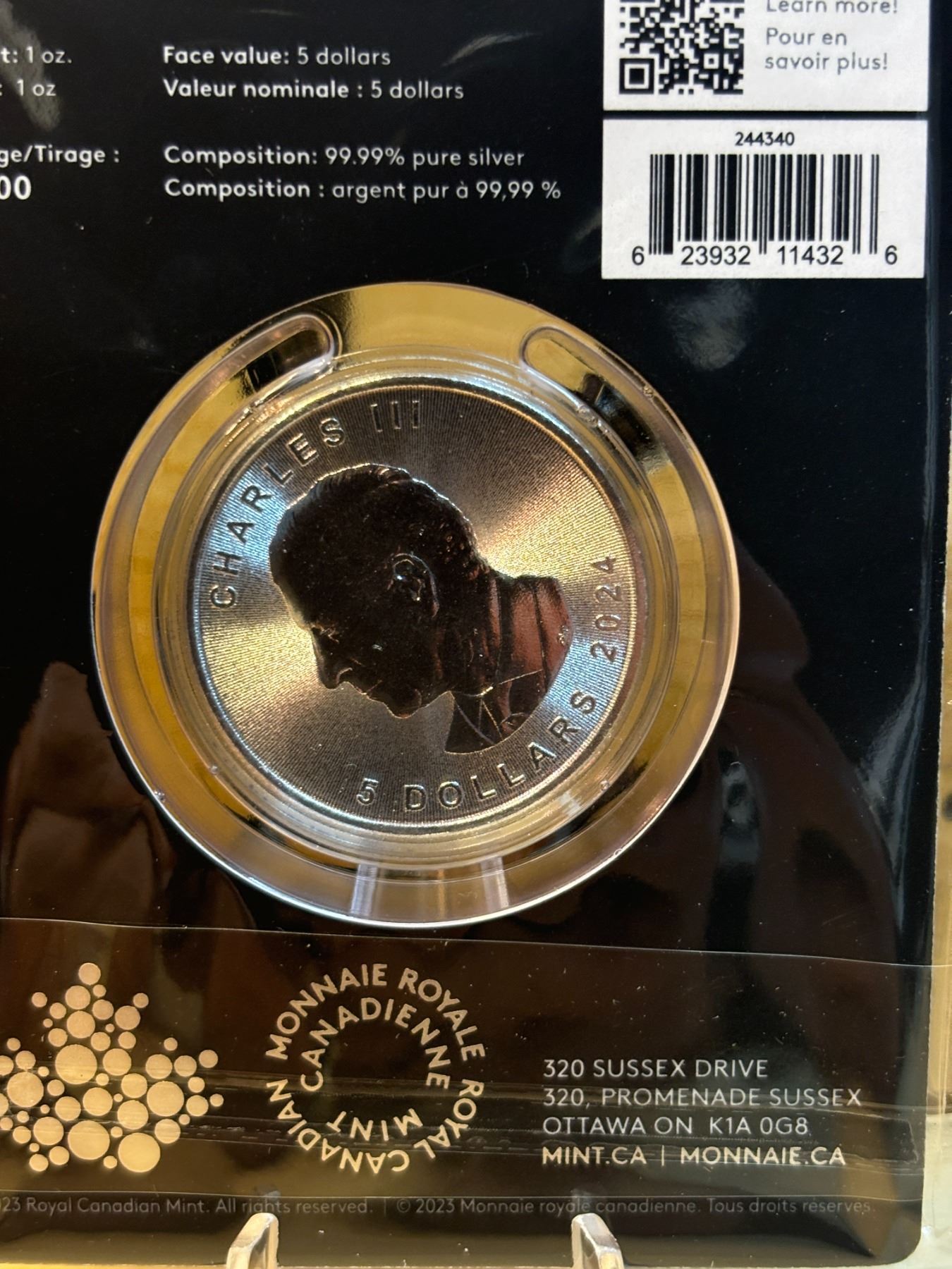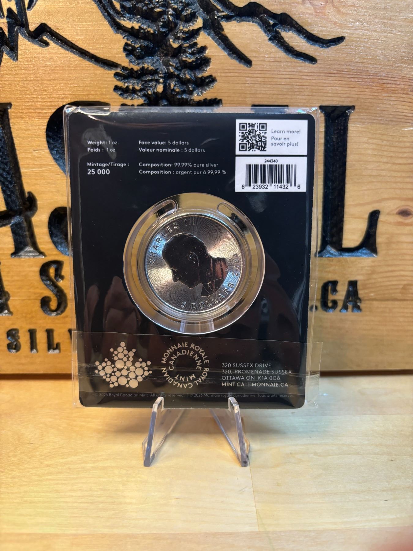 The 2025 1 oz Canadian Silver Maple Leaf is a .9999 fine silver coin featuring King Charles III on the obverse and the iconic maple leaf on the reverse. With advanced security features and MINTSHIELD™ protection, it’s perfect for collectors and investors.