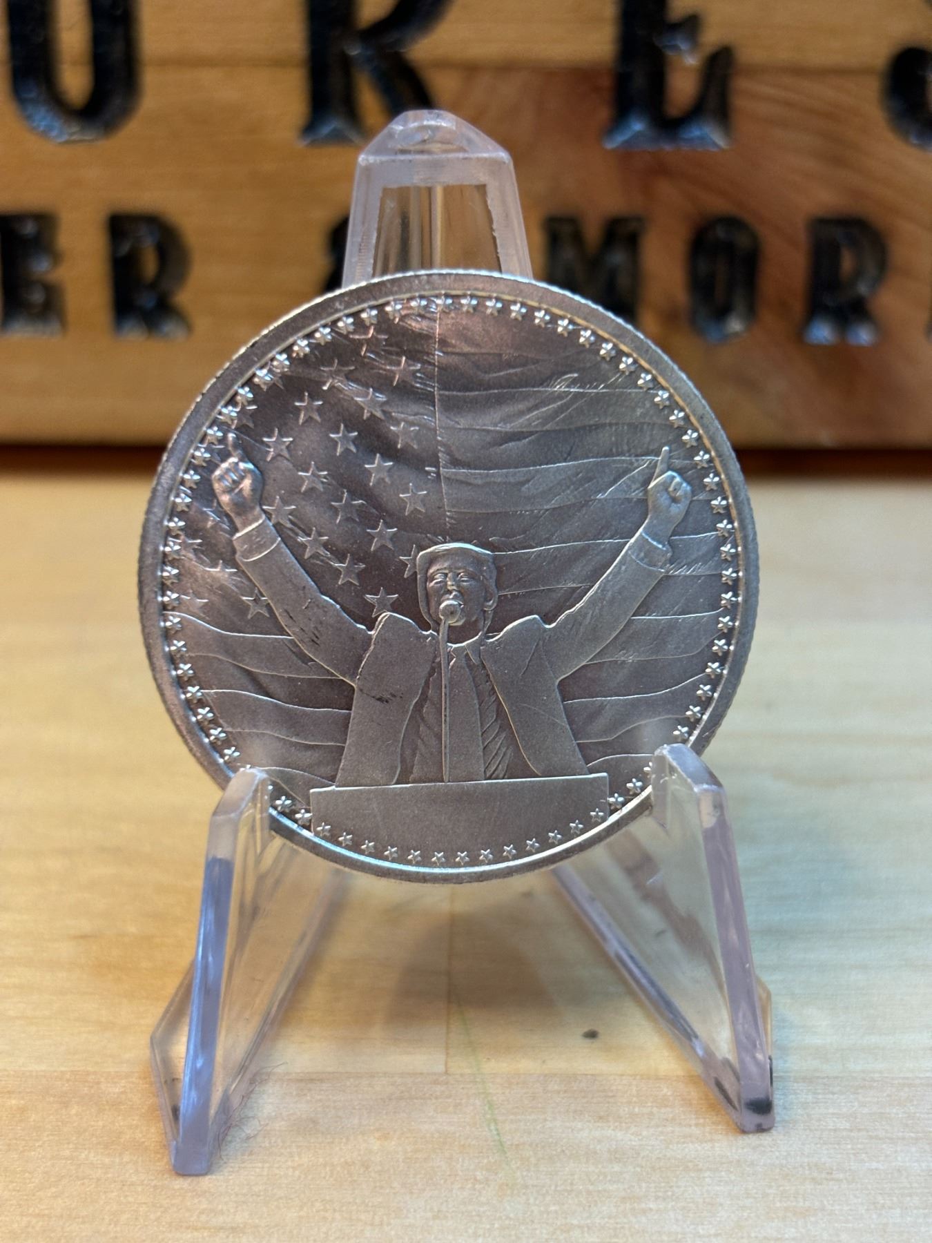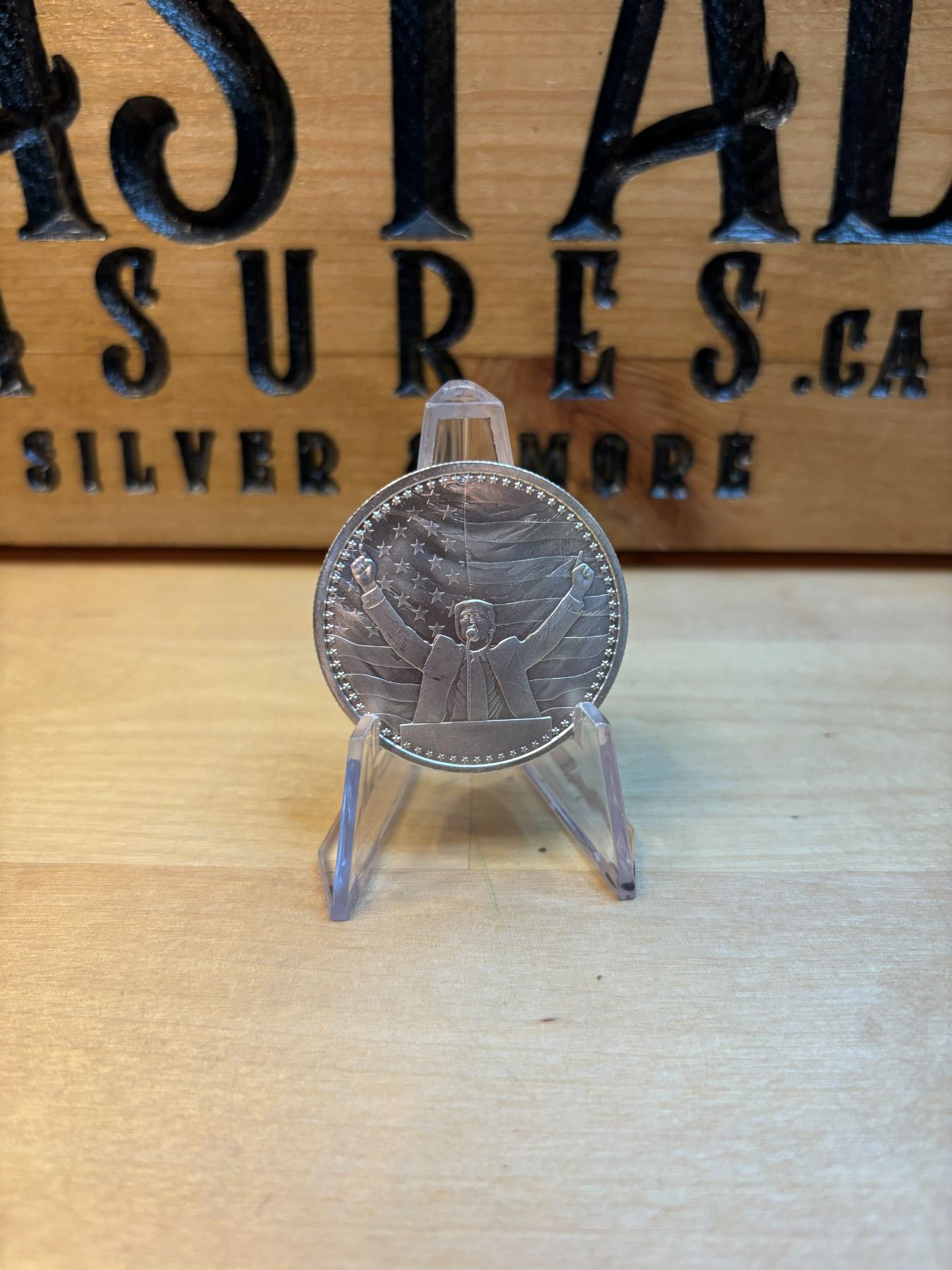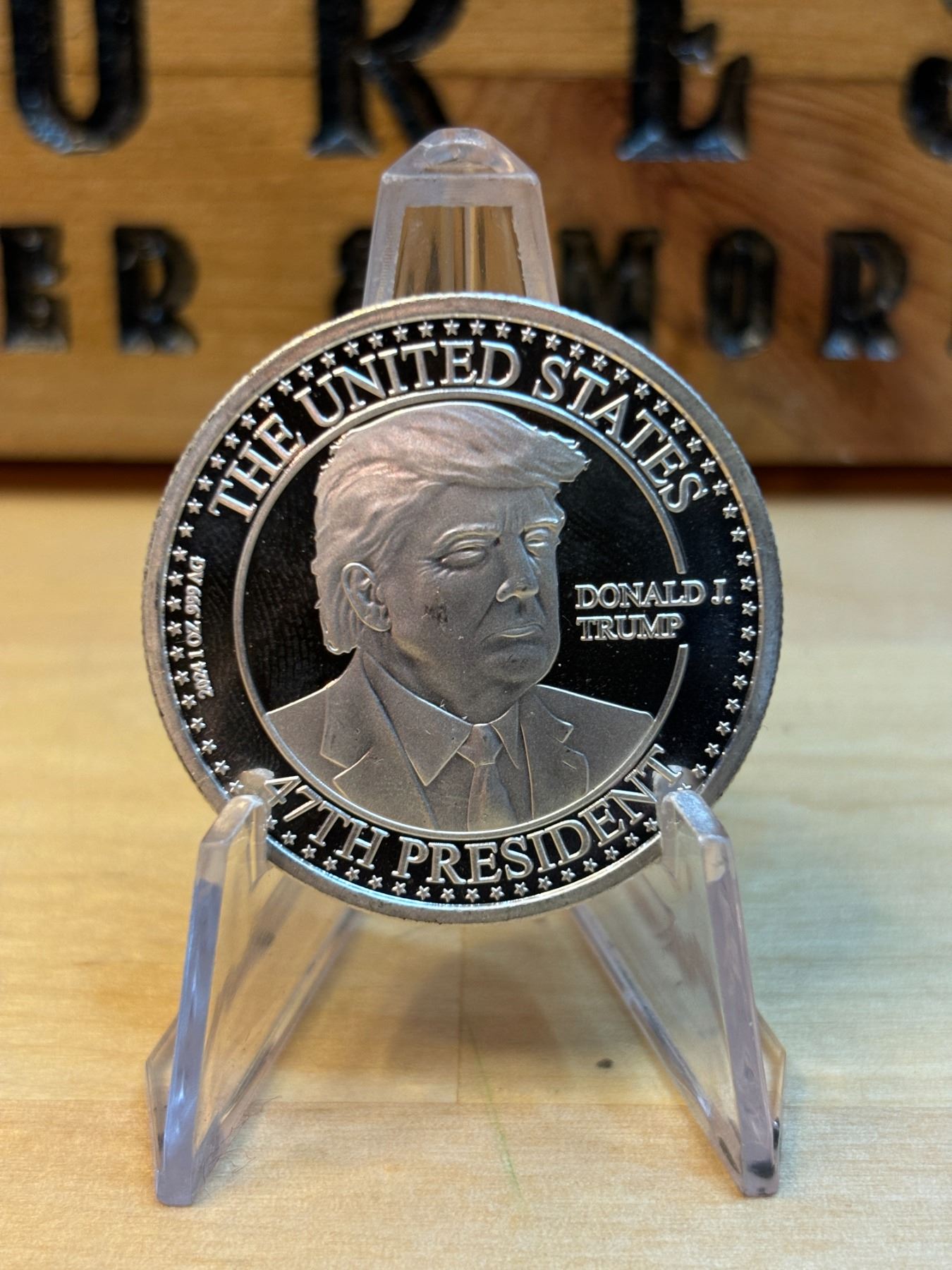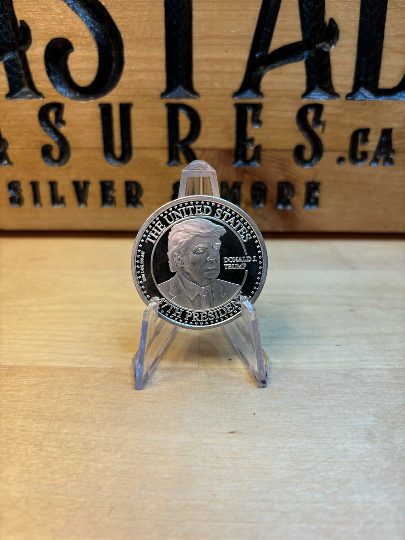 The 1 oz Donald Trump 47th President Silver Round is a commemorative collectible made from 1 ounce of .999 fine silver. It marks the inauguration of Donald Trump as the 47th President of the United States, with the obverse typically featuring his portrait and relevant inscriptions. The reverse design can vary but often includes symbolic elements of his presidency. These silver rounds are popular among collectors and investors, offering both political significance and precious metal value.