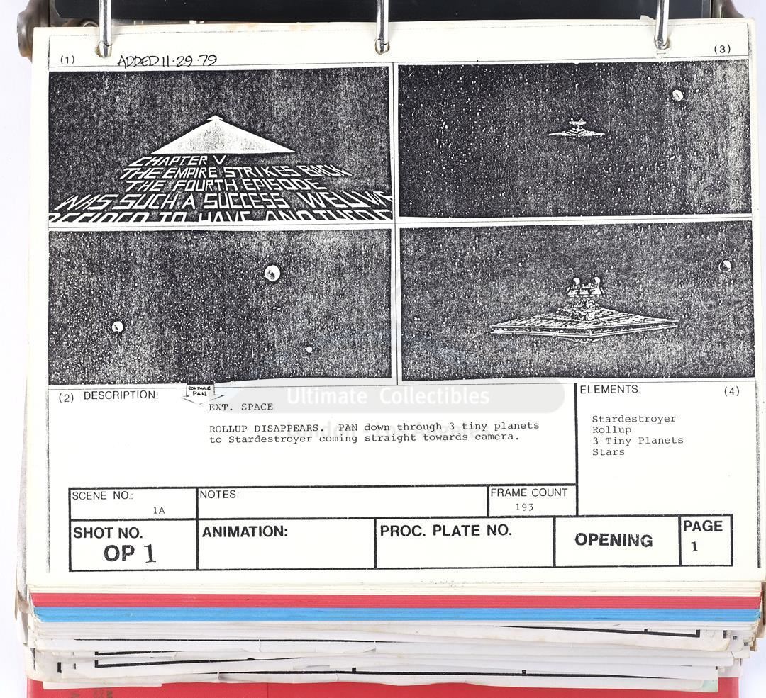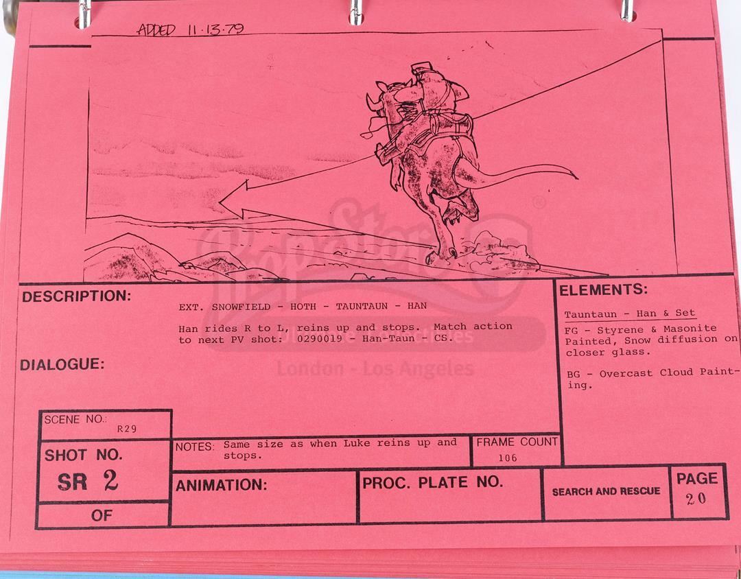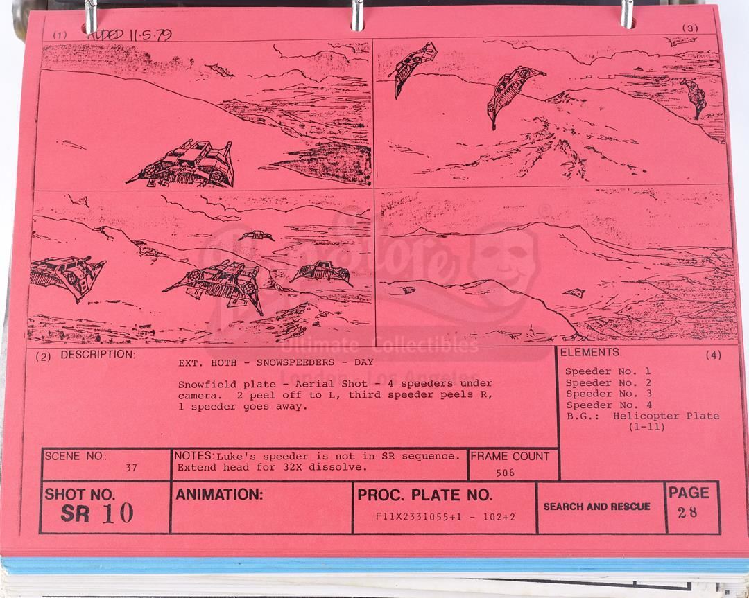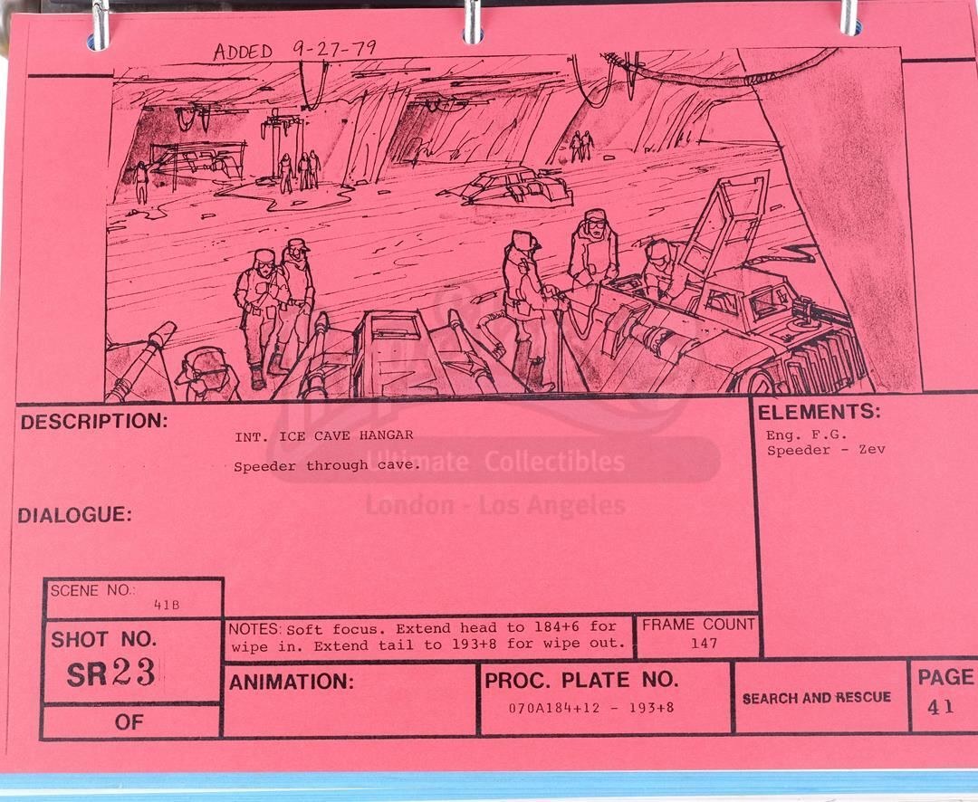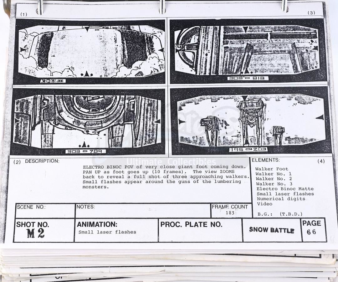 This lot will be auctioned on Tuesday, June 29th. The auction will begin at 9:00am PDT and lots are sold sequentially via live auctioneer; tune in to the live streaming broadcast on auction day to follow the pace. Note other lots in the auction may close on June 30th or July 1st. A production-used Industrial Light & Magic (ILM) visual effects storyboard set from Irvin Kershner's Star Wars: The Empire Strikes Back. This storyboard binder was used by a crew member at ILM and features printed copy storyboards for the majority of the film's effects shots, including the Walker and Tauntaun sequences on Hoth, ship sequences throughout the film, and bluescreen and matte painting shots. Each printed copy storyboard features a sketch of the shot, key information such as the description and shot number, and is printed onto a color paper that corresponds to the sequence it belongs to. A storyboard index is included at the front of the binder. In total, there are approximately 200 pages of storyboards housed in a red binder from production, some with small handwritten notations. The set remains in excellent condition. Dimensions: 12.5" x 12.5" x 3" (32 cm x 32 cm x 8 cm) Estimate: $6,000 - 8,000