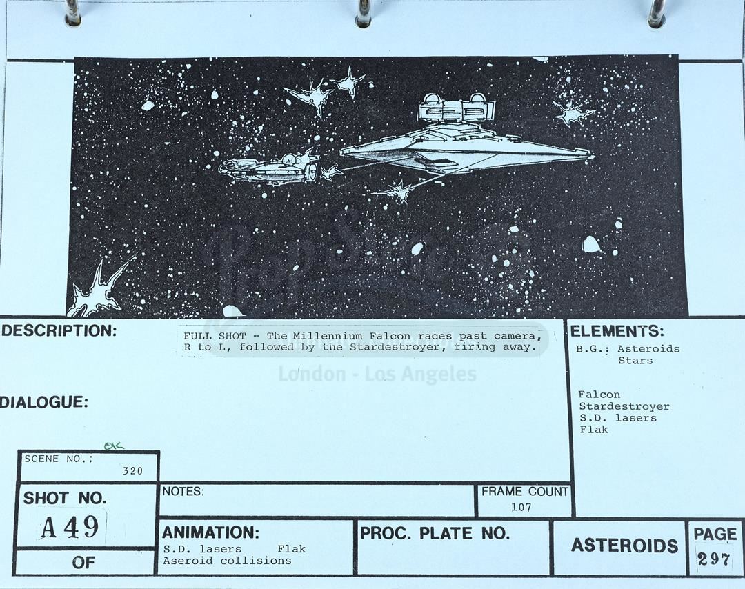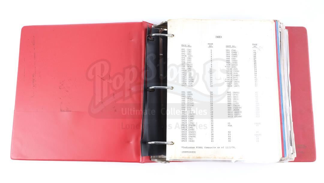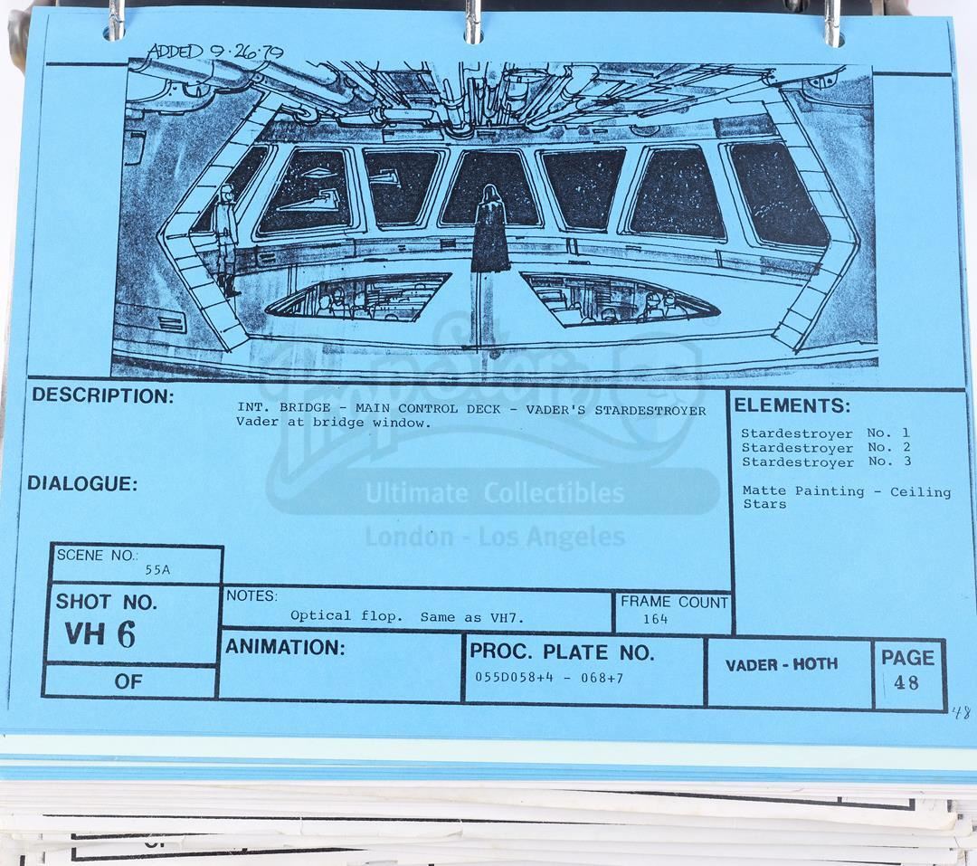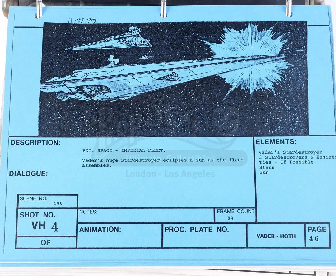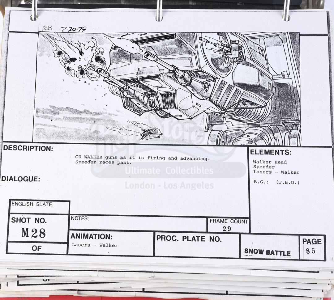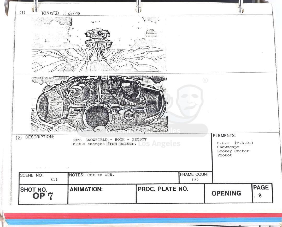 This lot will be auctioned on Tuesday, June 29th. The auction will begin at 9:00am PDT and lots are sold sequentially via live auctioneer; tune in to the live streaming broadcast on auction day to follow the pace. Note other lots in the auction may close on June 30th or July 1st. A production-used Industrial Light & Magic (ILM) visual effects storyboard set from Irvin Kershner's Star Wars: The Empire Strikes Back. This storyboard binder was used by a crew member at ILM and features printed copy storyboards for the majority of the film's effects shots, including the Walker and Tauntaun sequences on Hoth, ship sequences throughout the film, and bluescreen and matte painting shots. Each printed copy storyboard features a sketch of the shot, key information such as the description and shot number, and is printed onto a color paper that corresponds to the sequence it belongs to. A storyboard index is included at the front of the binder. In total, there are approximately 200 pages of storyboards housed in a red binder from production, some with small handwritten notations. The set remains in excellent condition. Dimensions: 12.5" x 12.5" x 3" (32 cm x 32 cm x 8 cm) Estimate: $6,000 - 8,000