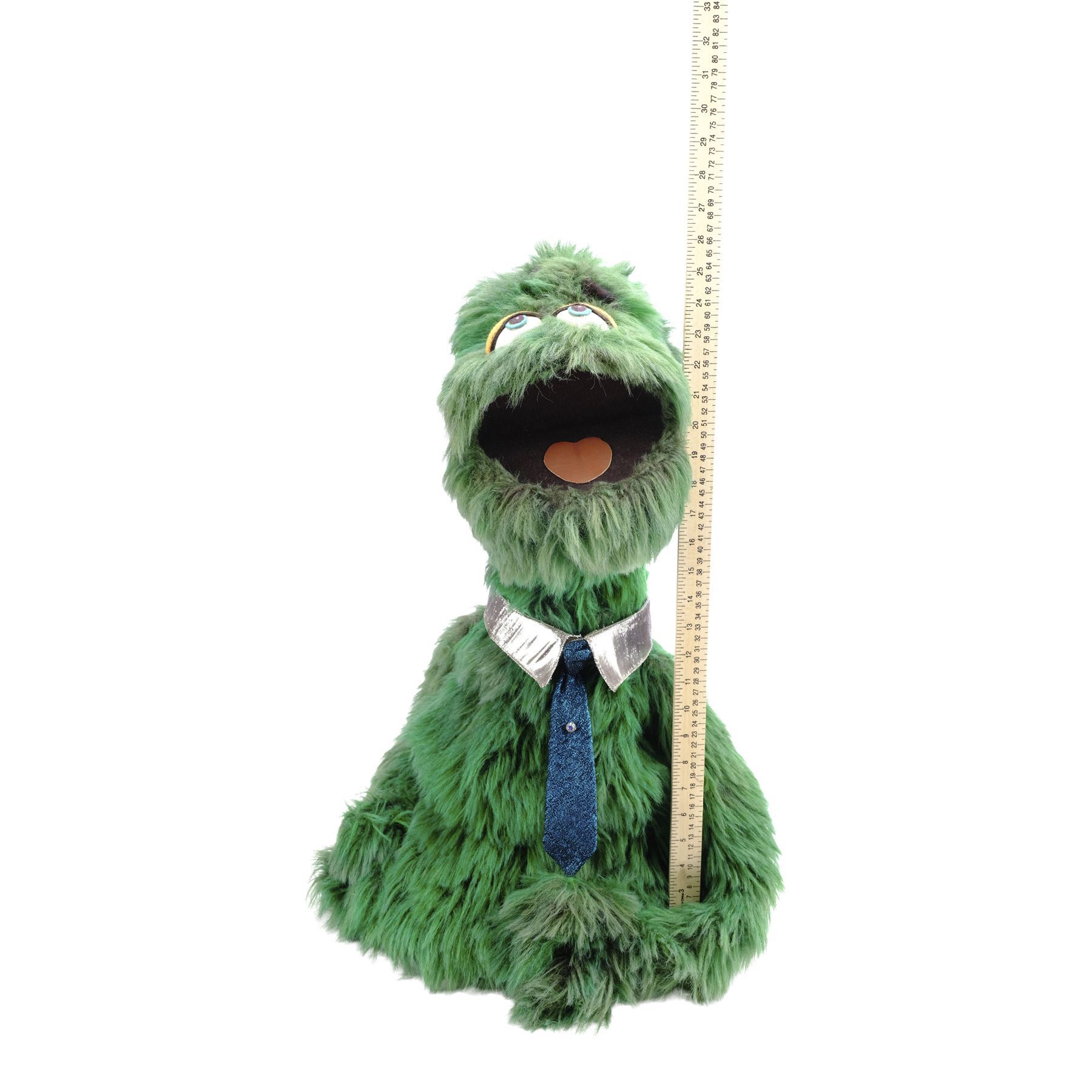 Originally part of a larger display sold at the charity benefit, this lot consists of an official Henson muppet displayed on a black wooden base with a black felt-covered pole. Tree-shaped and wearing a silver-color and sparkly blue necktie, this muppet is made of green faux fur lined with green polyblend fabric. It features foam and felt eyes, a felt mouth, and an interior hand-sewn hand-marked tag "Henson Assoc, Inc 1988 - All Rights Reserved" in black ink. A white ribbon tag signed by Jim Henson is attached to the back of the muppet. This lot exhibits a build up of grime, and mild matted fur. Dimensions: 16" x 12" x 25" (40.75 cm x 30.5 cm x 63.5 cm)