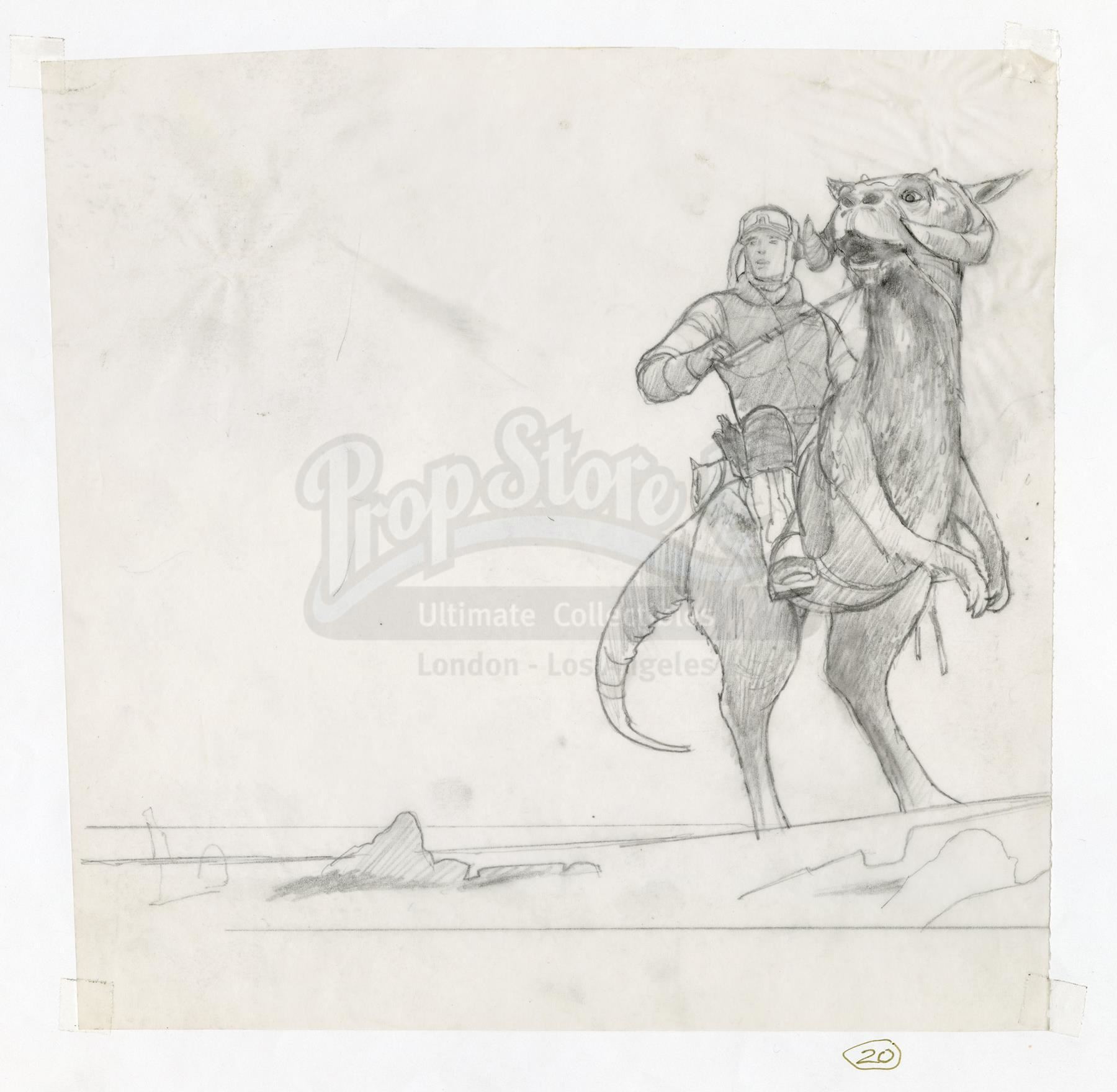 This lot will be auctioned on Tuesday, June 29th. The auction will begin at 9:00am PDT and lots are sold sequentially via live auctioneer; tune in to the live streaming broadcast on auction day to follow the pace. Note other lots in the auction may close on June 30th or July 1st. A Luke on Tauntaun drawing for a production illustration by Ralph McQuarrie from Irvin Kershner's Star Wars: The Empire Strikes Back. While patrolling Hoth for signs of the Empire, Luke Skywalker (Mark Hamill) was knocked off his tauntaun by a vicious wampa. McQuarrie was a key designer on the original Star Wars film as well as the sequel, and created concepts for many characters in the film including tauntauns. He also created production illustrations as concept works and as marketing works, following the success of the Ralph McQuarrie Star Wars Portfolio as a commercial product. McQuarrie's production illustrations created for marketing purposes were frequently done based on photographs of already-completed live-action photography, and this drawing is likely one of those. The Luke on tauntaun production illustration is one of the artist's most memorable paintings for The Empire Strikes Back, and appeared in the Ralph McQuarrie ESB Portfolio, released shortly after the film itself. This preparatory drawing for the production illustration is rendered in graphite on tissue paper taped to a sheet of plain paper marked "20." McQuarrie's process frequently involved beginning with a drawing on vellum, that he could later re-trace onto an illustration board to begin a painting. This is believed to be the final drawing for the Luke on tauntaun painting. The tissue paper is creased with visible edge wear and loosening tape, but the sketch remains in good overall condition. Dimensions: 17.25" x 11.25" (44 cm x 28.75 cm) Sold without copyright; see notice in Buyer's Guide. Estimate: $15,000 - 20,000