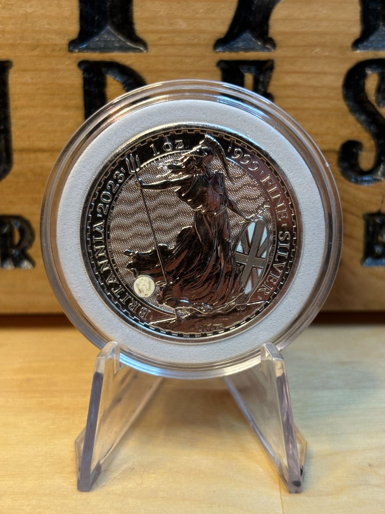 The 1 oz Britannia 2023 Silver Coin is part of the popular Britannia series, produced by the Royal Mint. It contains 1 ounce of .999 fine silver and features the iconic image of Britannia, symbolizing strength and resilience. The 2023 edition features an updated design with enhanced security features, such as a new background wave pattern and a holographic foil that changes in the light, making it more difficult to counterfeit. The coin is widely sought after by collectors and investors alike.