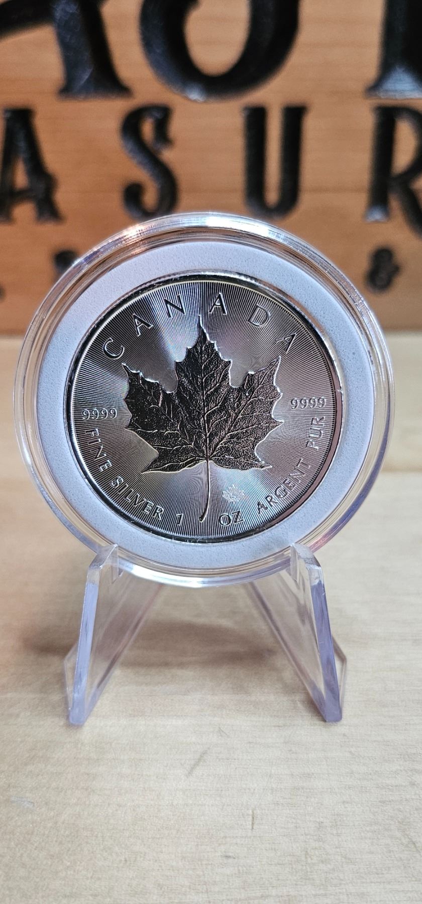 The 2023 1 Oz Silver Maple Leaf Coin features .9999 fine silver and showcases the iconic maple leaf design. This coin is housed in a protective capsule, making it an ideal collectible for investors and enthusiasts.
