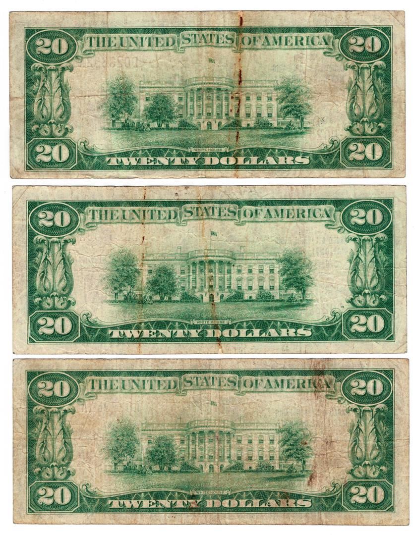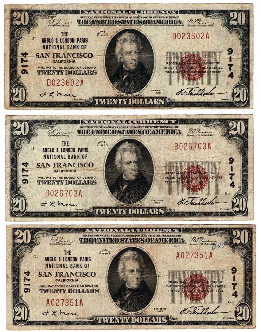 One Lot (3) 1929 $20 San Francisco CA National Currency Notes - Charter 9174