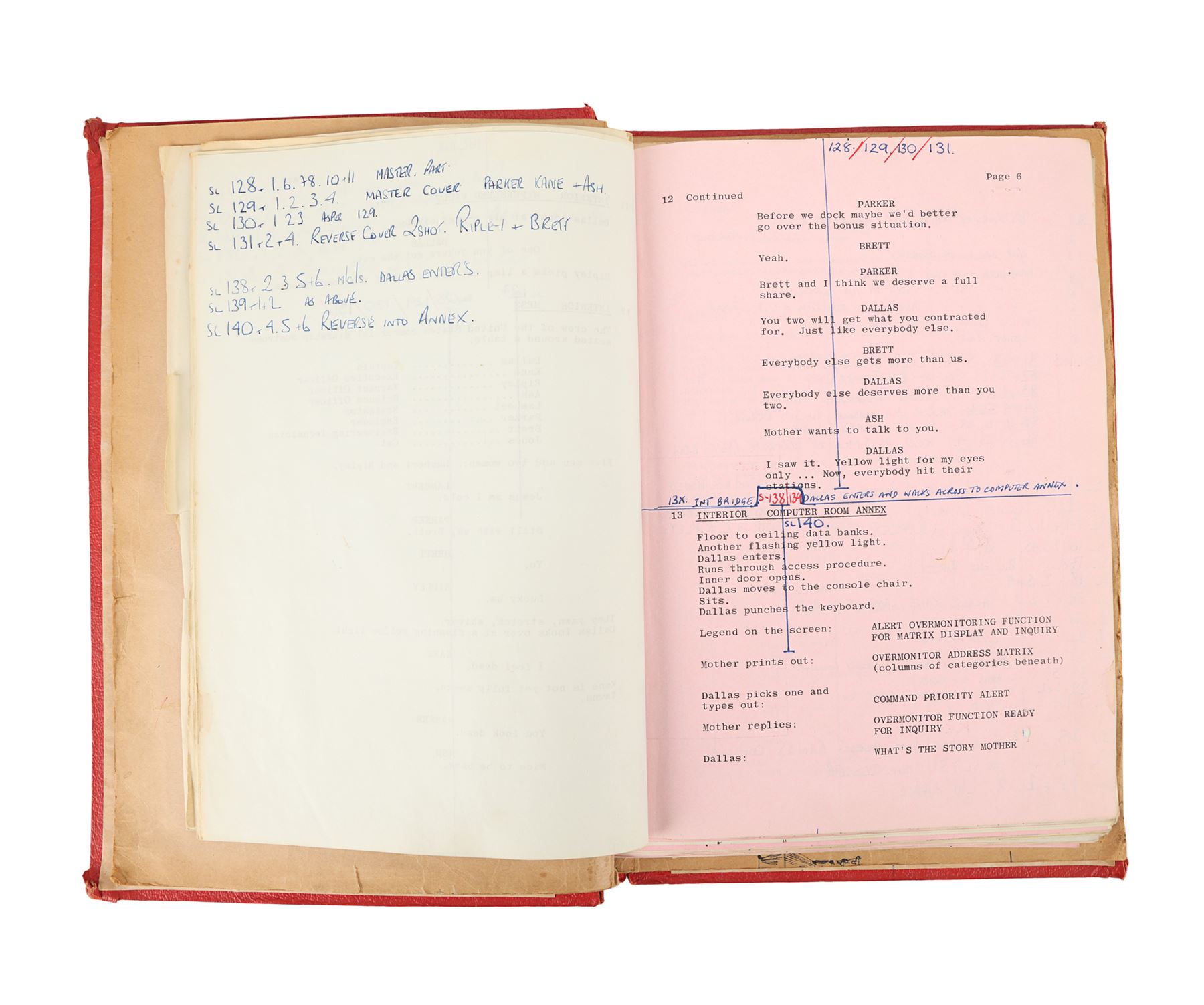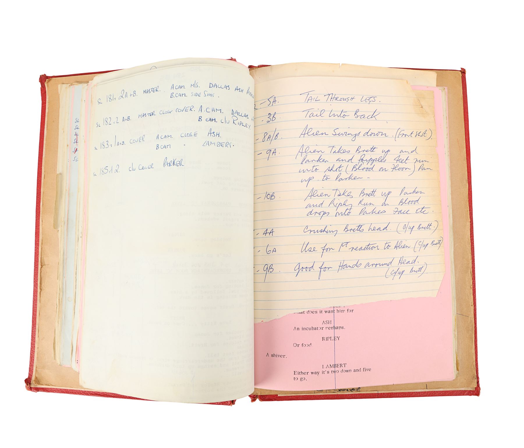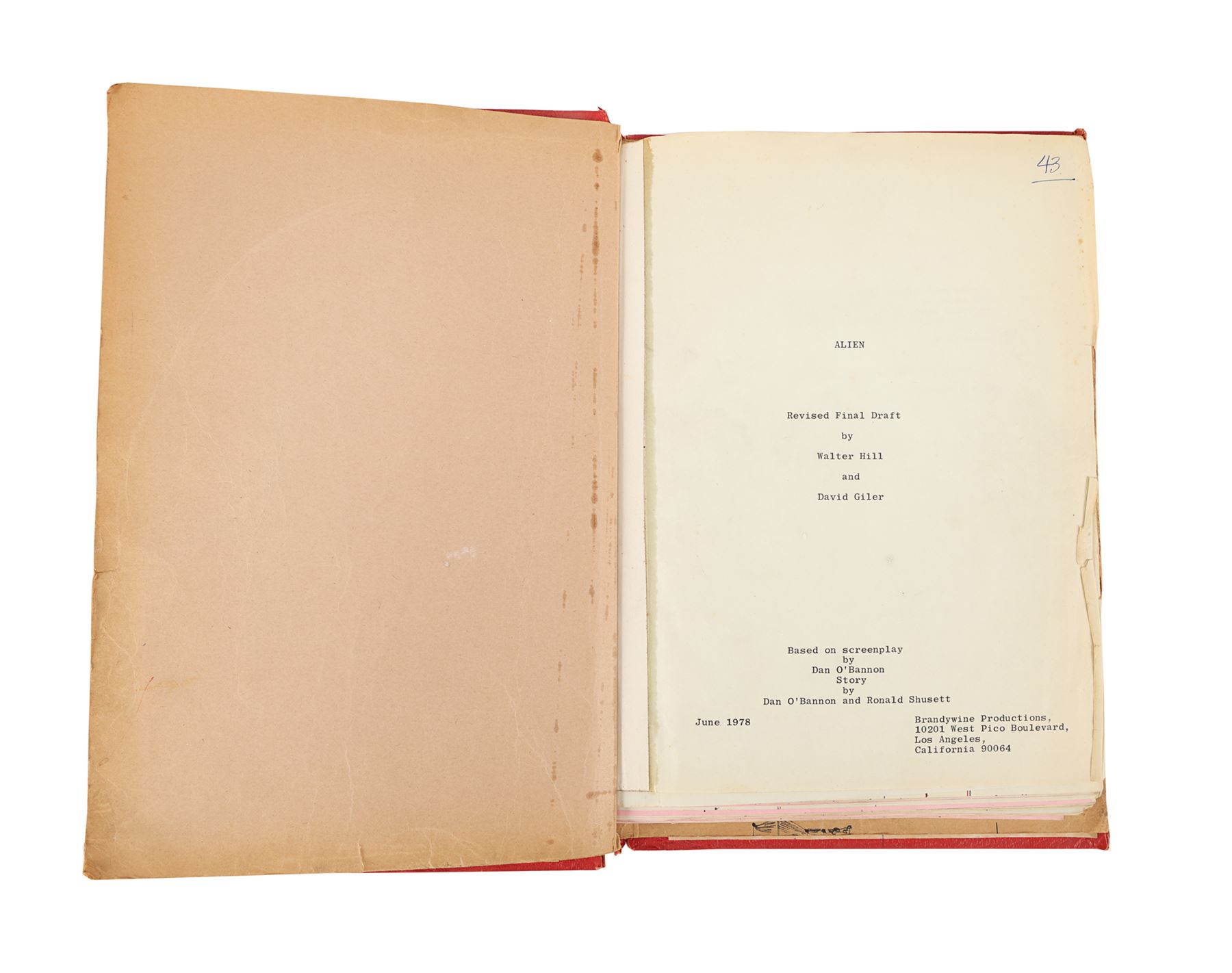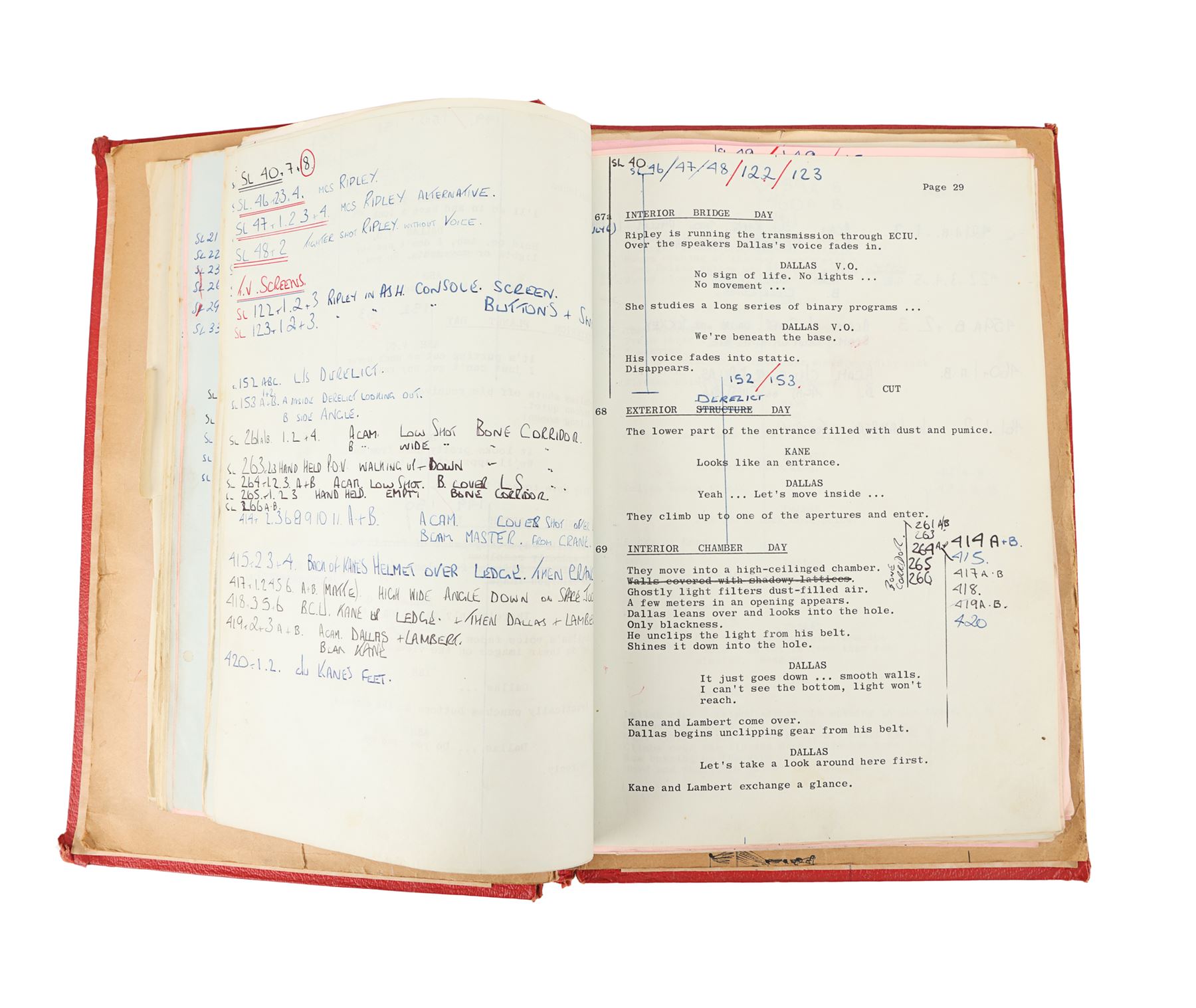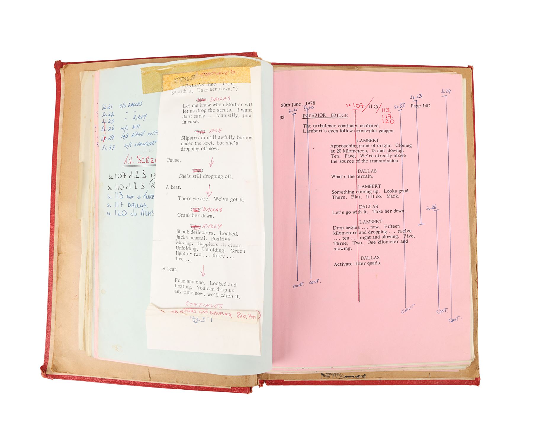This revised final draft script is credited to Walter Hill and David Giler, and is dated "June 1978". 128 pages in length with every page featuring some form of handwritten annotation or highlighting, detailing which shots and camera angles were to be used for each scene.The impact of this document on the shoot of the film cannot be overstated. Additional pages have been placed inside, and changes to the script have been taped over the original lines. Some pages have the word "Out" repeatedly written over the text in pencil, indicating which sections were ultimately discarded. The script is bound in hardback and features the film's title and "Terry Rawlings Script" handwritten on the front cover, as well as a Nostromo logo sticker. "Script Terry Rawlings" is handwritten on tape along the spine. The script has wear from being well-used during production, including scuffing, markings and staining on the cover, with minor tears and discolouration on the pages. Dimensions: 32 cm x 23.5 cm x 2.5 cm (12 1/2" x 9 1/4" x 1")