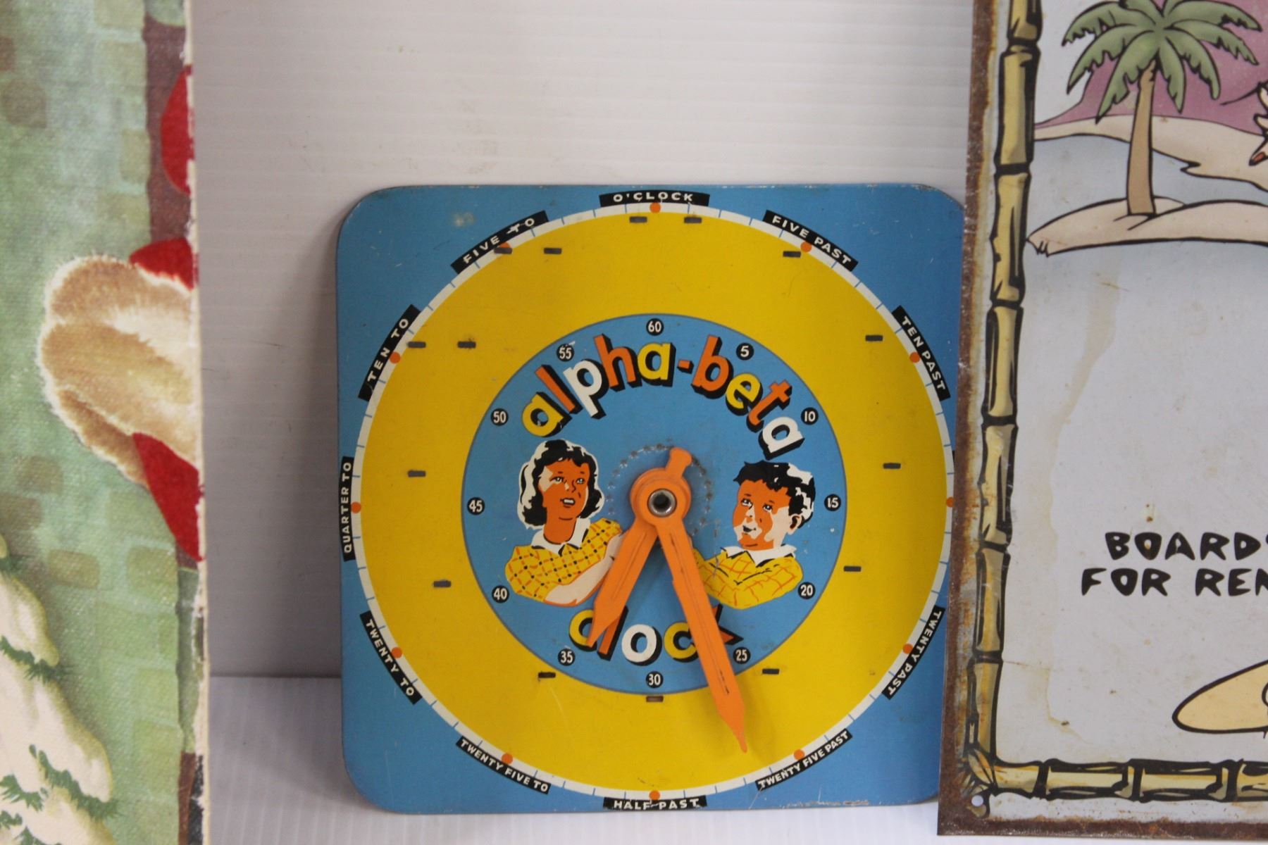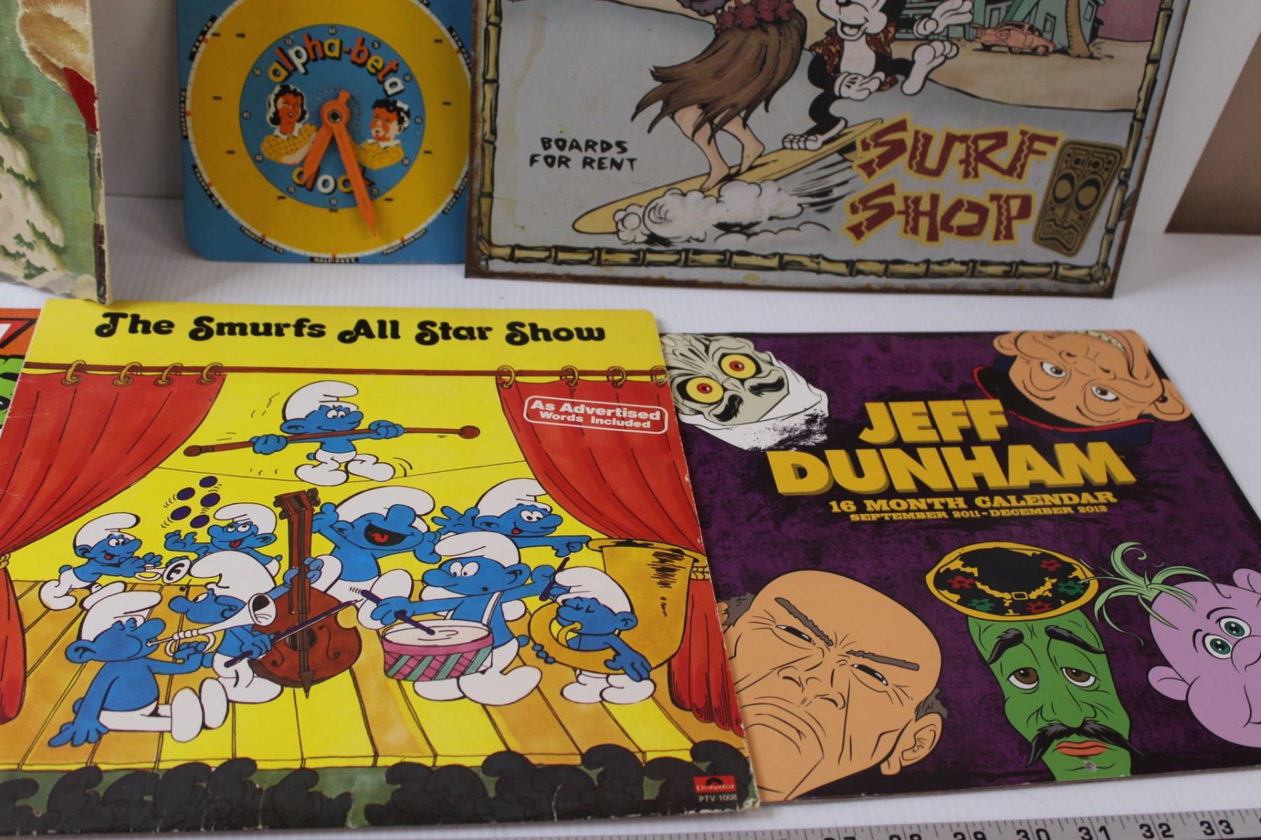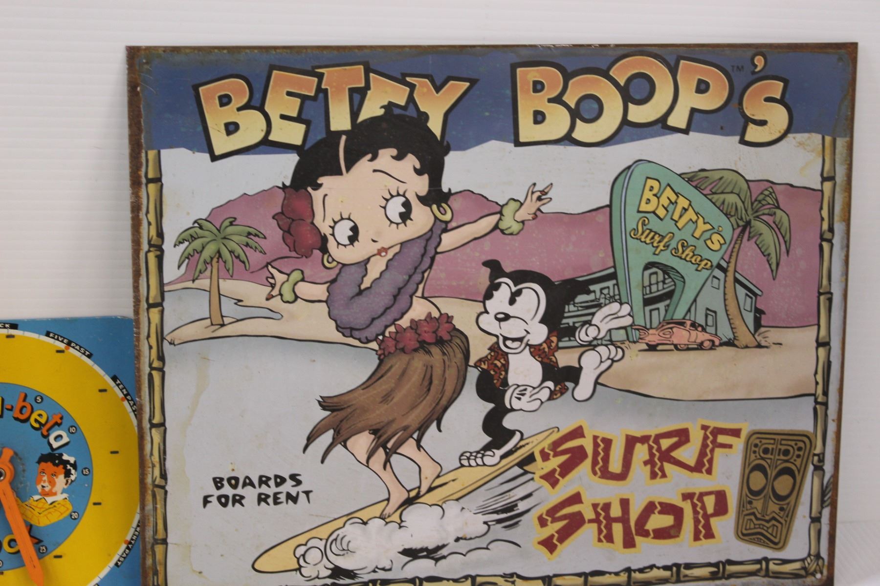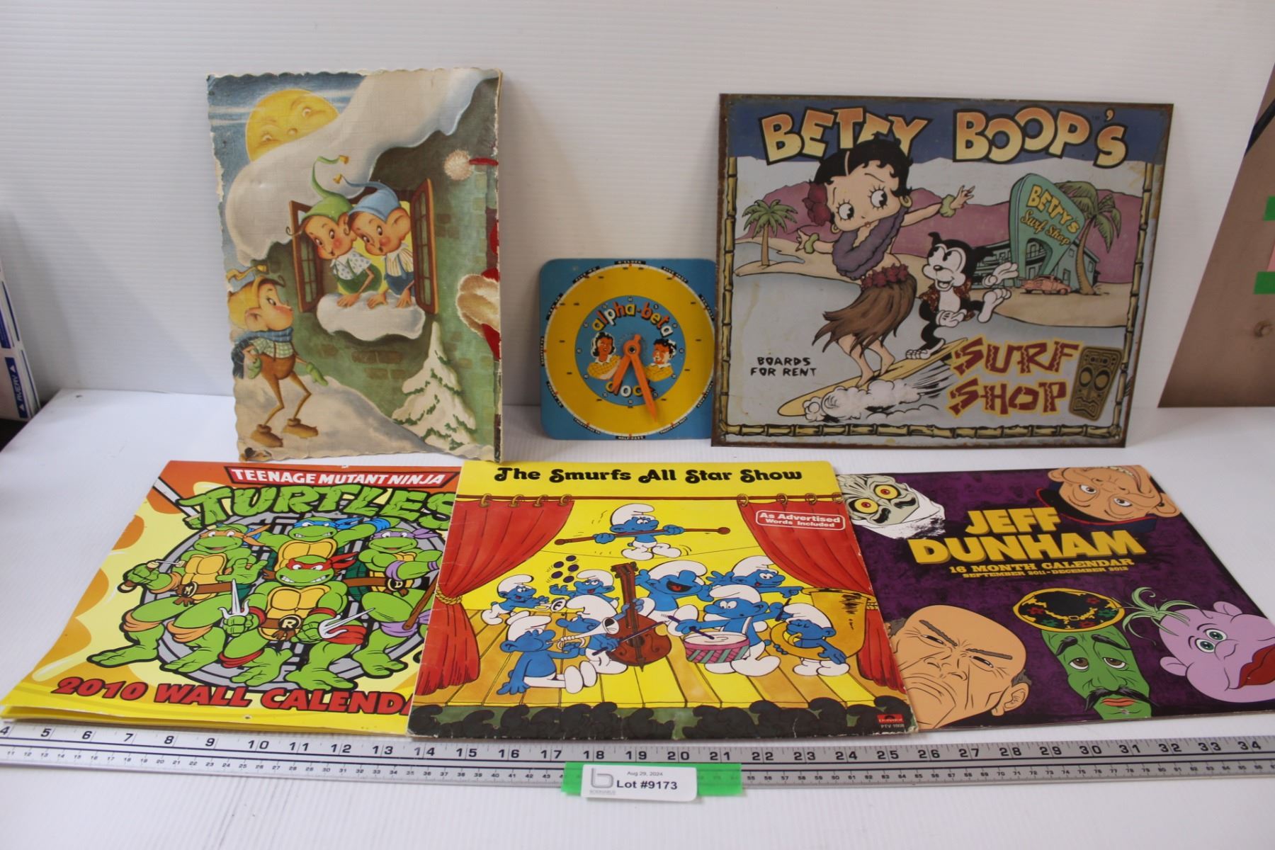 Lot: (3) Calendars, Alpha Bet Clock, Betty Boop Metal Sign, Elf Poster