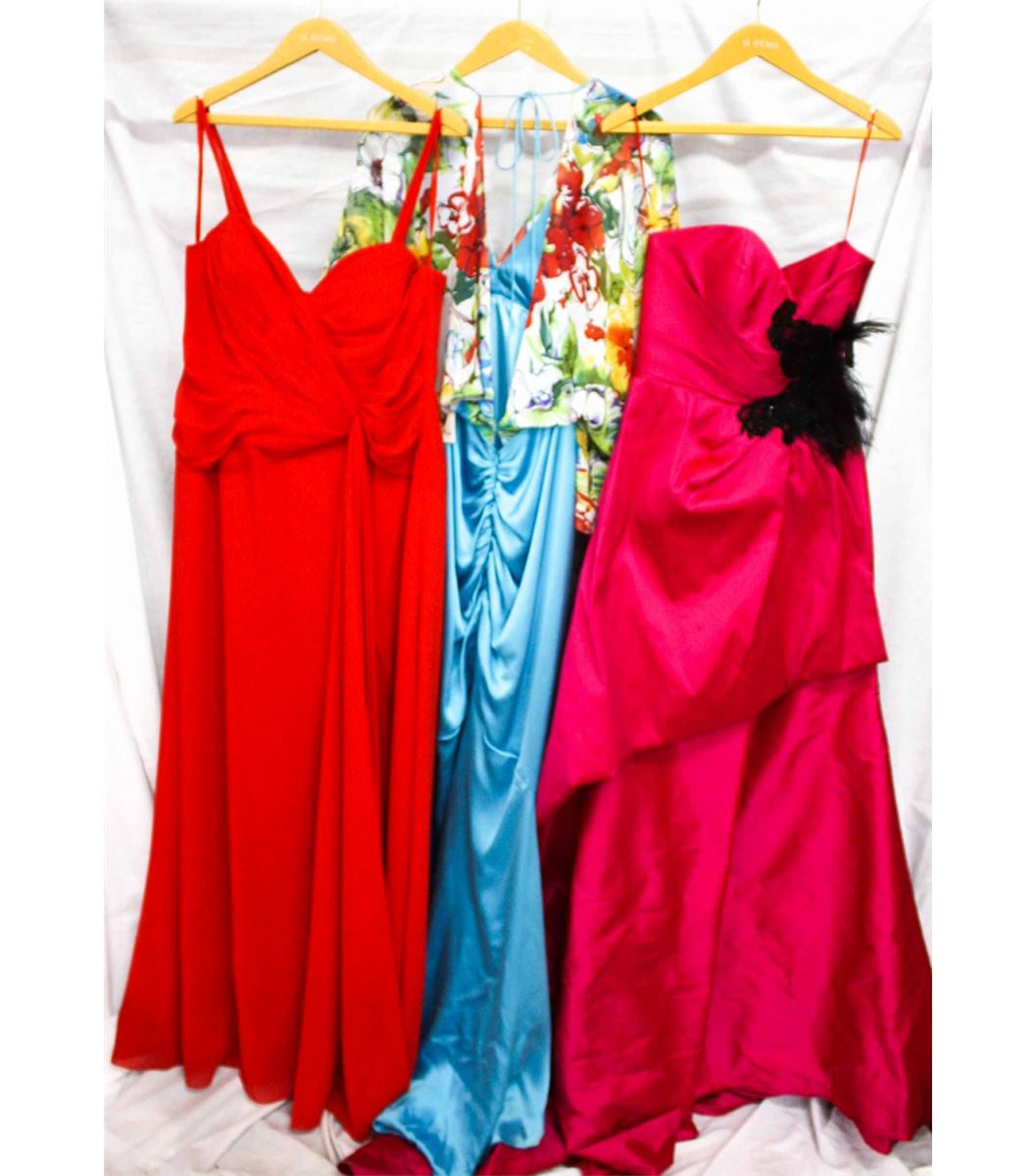 Lot [3] DRESSES: [1] Faviana red gown, size 12W, [1] Yolanda Arce turquoise dress, size Small and [1] Juan Carlos Pinera strapless dress, size Medium