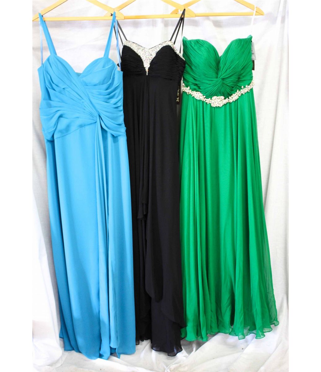Lot [3] DRESSES: [1] Turquoise applique sash gown, size 12w, [1] Black beaded sweetheart gown, size 12, [1] Faviana applique sash gown, size 12w