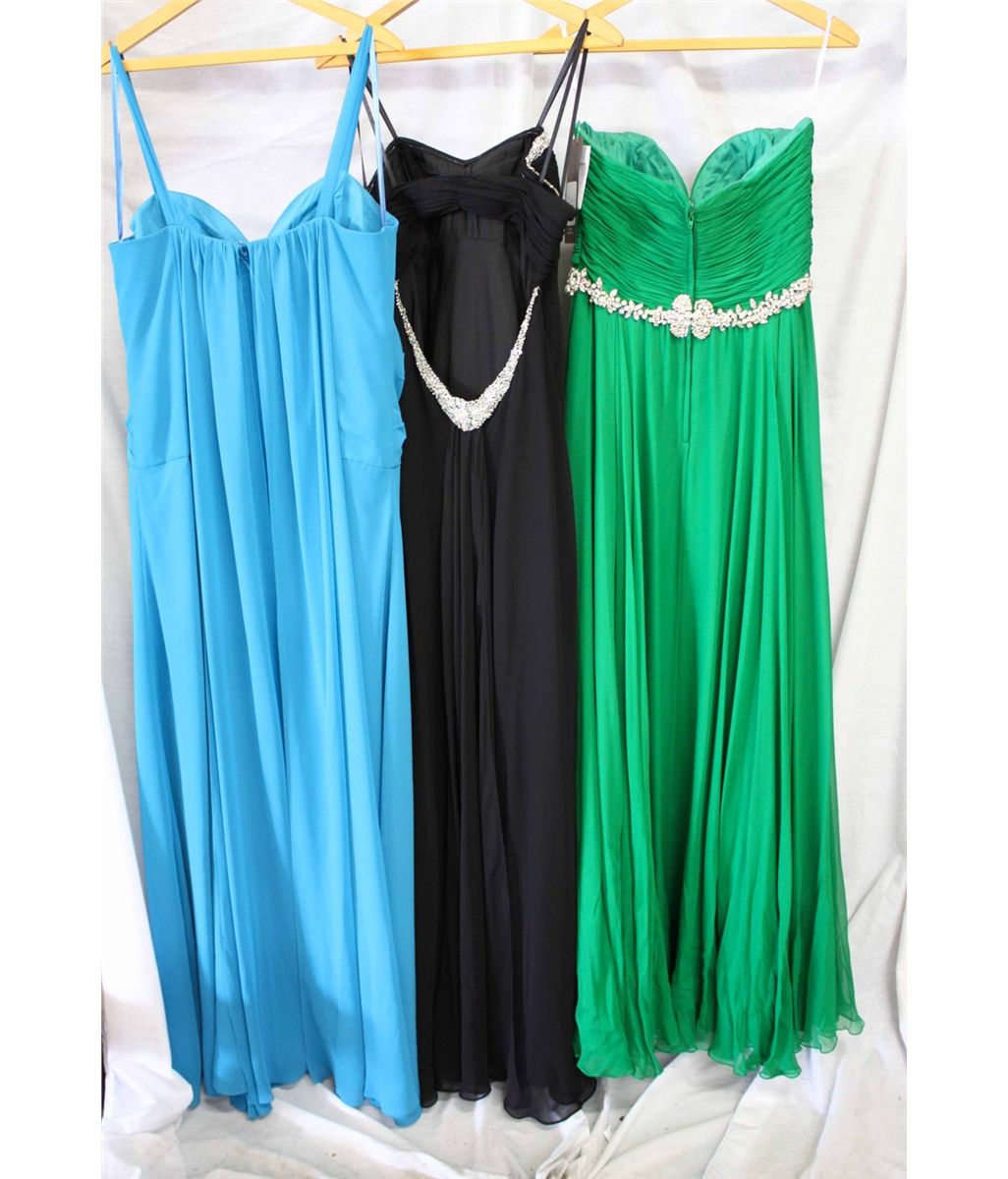 Lot [3] DRESSES: [1] Turquoise applique sash gown, size 12w, [1] Black beaded sweetheart gown, size