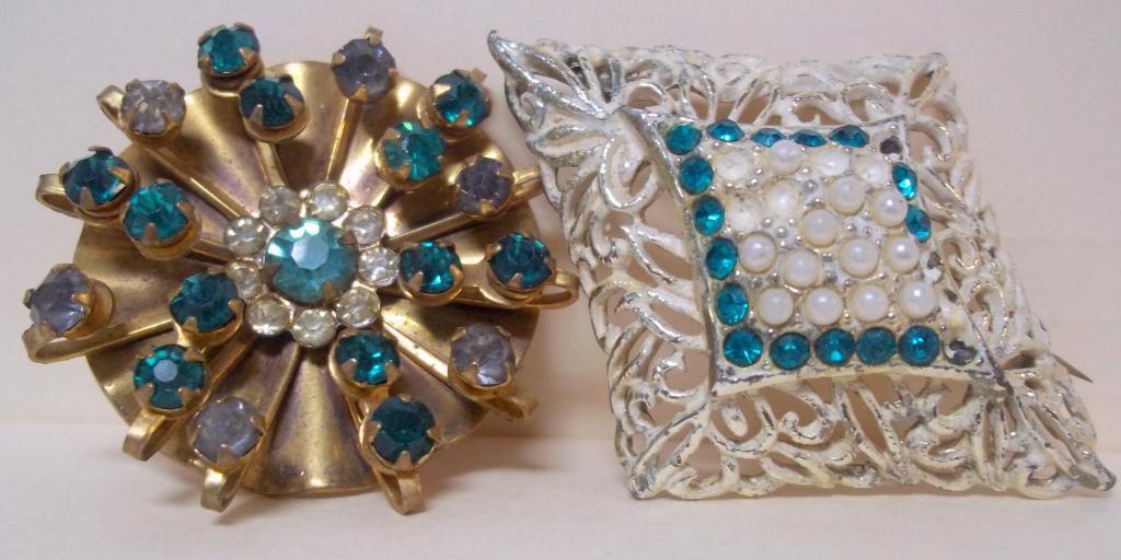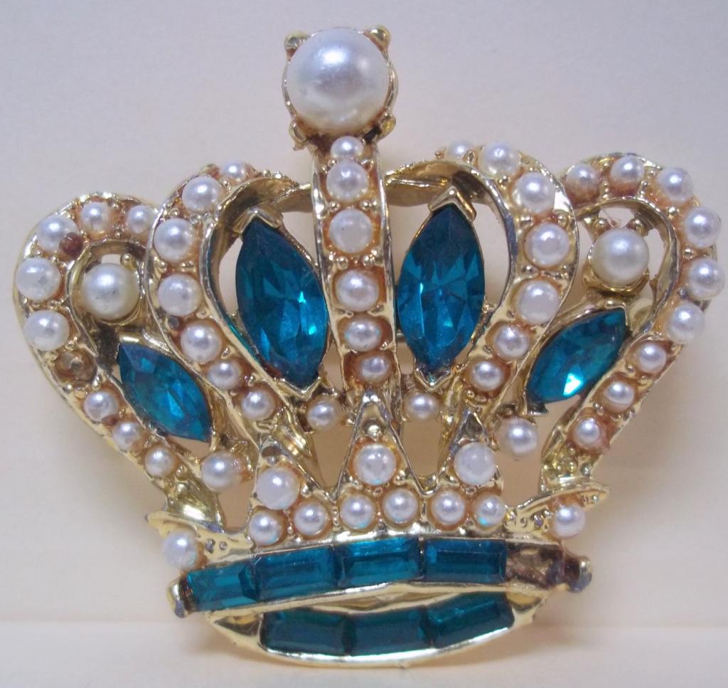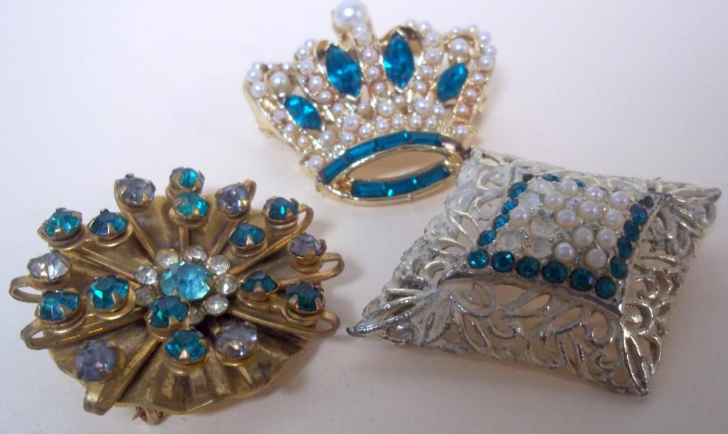 3 Decorative Costume Jewelery Pins embellished with pearls and rhinestones. Including a stylish crown pin.