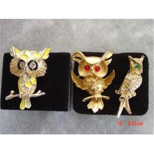 Here is a lot of 3 owl brooches pendants. There is a owl with green emerald rhinestone eyes. there is a red cabachon glass eyed owl, this one also has a pendant hook so if you get tired of wearing it as a brooch you can wear it as a necklace. Then there is a yellow and white enameled brooch with clear rhinestone eyes. If you are a owl collector this is a great lot to have