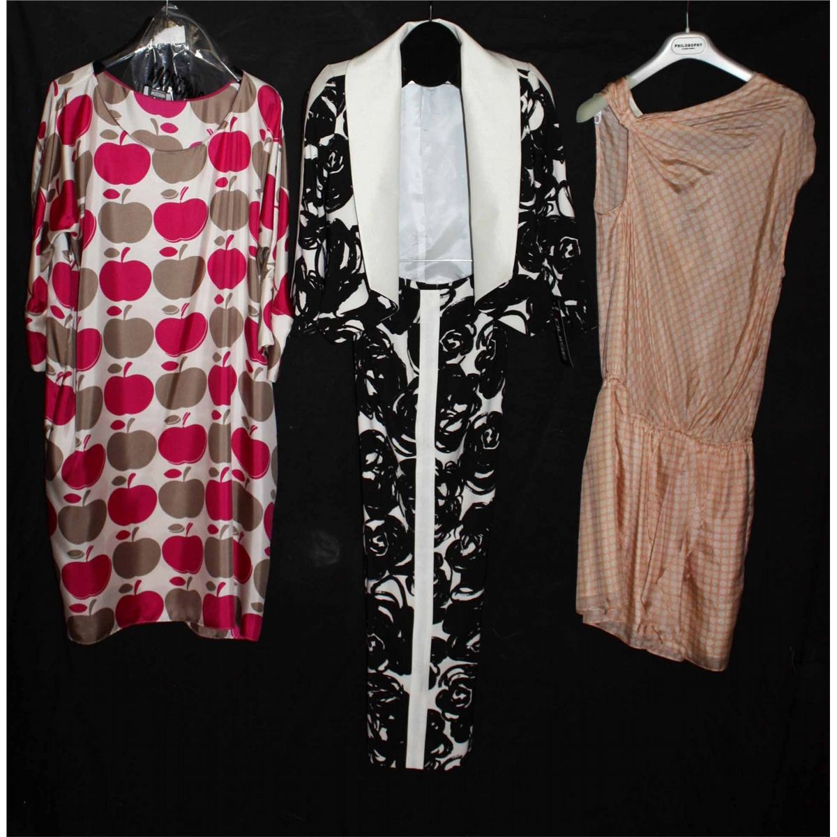 Lot [3] PIECES: [1] Hoss Intropia scoop neck tie side dress, size 8, [1] Floral print pant, size 8 and [1] Moschino apple print dress, size 8