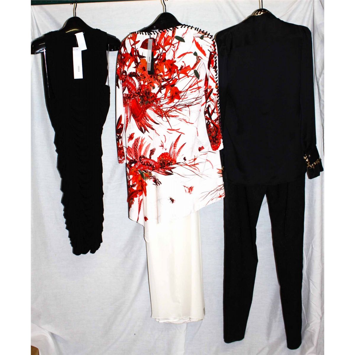 Lot [3] PIECES: [1] JustCavalli black blouse, size 6, [1] JustCavalli print tunic , size 6 and [1] Plein Stud Jeanius black dress, size 6,