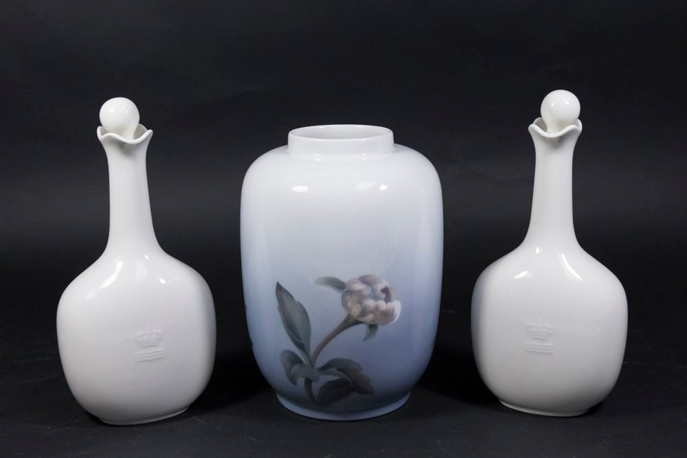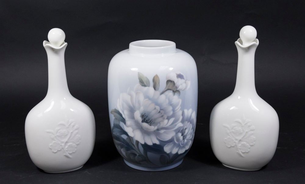 Including covered jar with flowers, approx. 9 1/2" H; and pair of bottles.