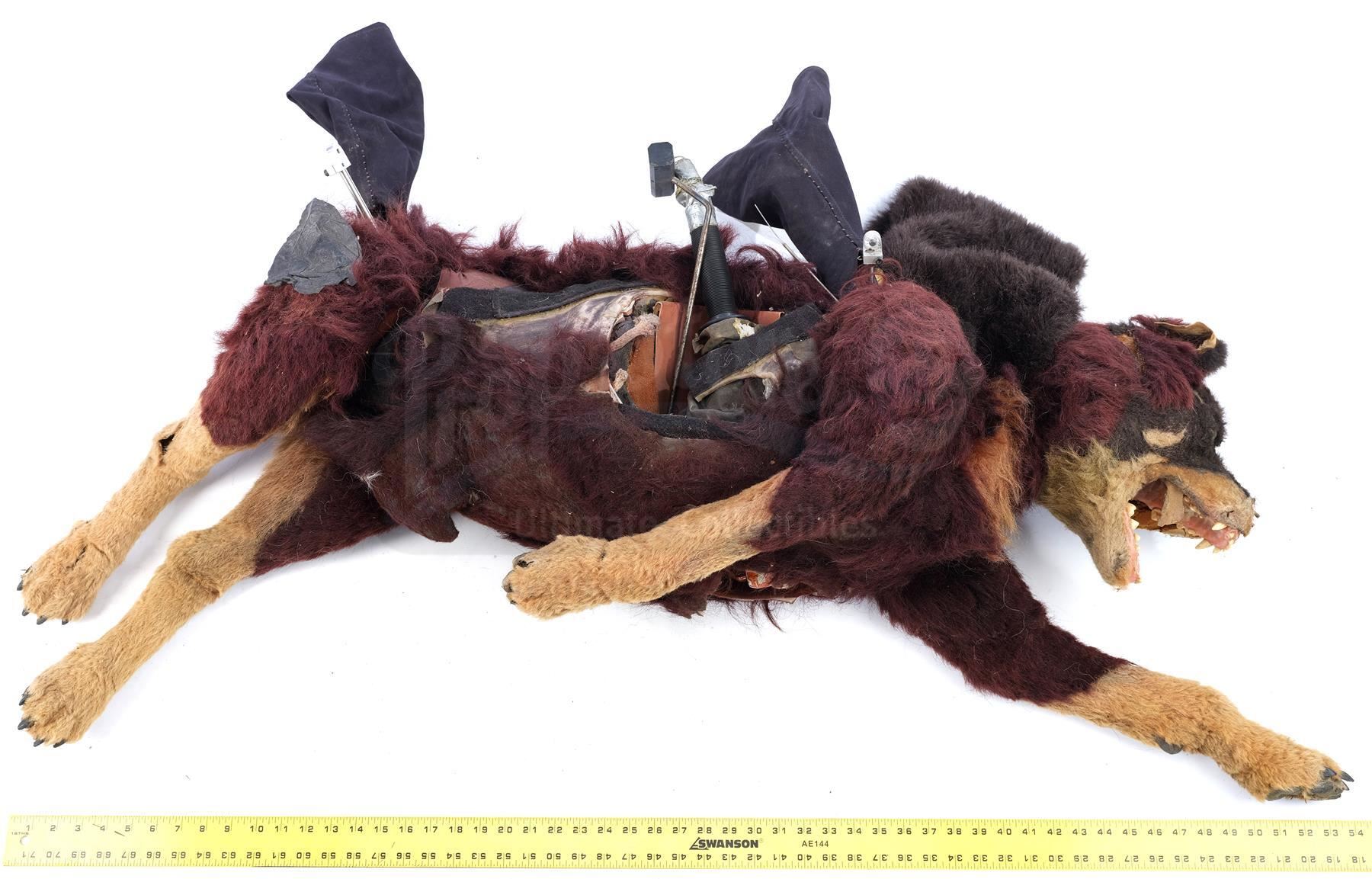 Designed and fabricated by the Academy Award-winning special effects group Amalgamated Dynamics, Inc. (ADI), this animatronic Rottweiler dog puppet contains a metal armature, servo motor, rubber and foam padding interior surrounded by an exterior of faux fur features including a hard plastic mouth. On one side of the ribcage is an opening with rods and a handle used to control a hard resin "Chestburster" element which is visible inside an opening in the chest. This puppet is in good overall condition with some wear from production throughout all elements. Dimensions: 48" x 34" x 13" (122 cm x 90 cm x 33 cm)