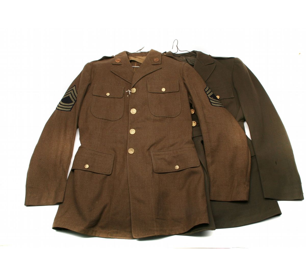 OD Army officer's uniform jacket - brass Army buttons - scattered moth damage & 0.5" hole in back - no patches - one OD Army Sgt's uniform jacket with shoulder patches - brass Army buttons - US & HQ brass collar buttons - some moth holes - both unmarked size (possibly Small/Med) - non-ffl - 25XXJCKS009