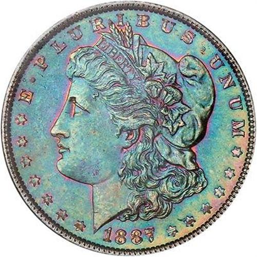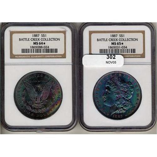 Lot of Two Toned Battle Creek Morgans.. Obverse toned 1887 NGC MS65* & Reverse toned 1887 NGC MS64*.<p><i>from The Battle Creek Collection, Part III</i>