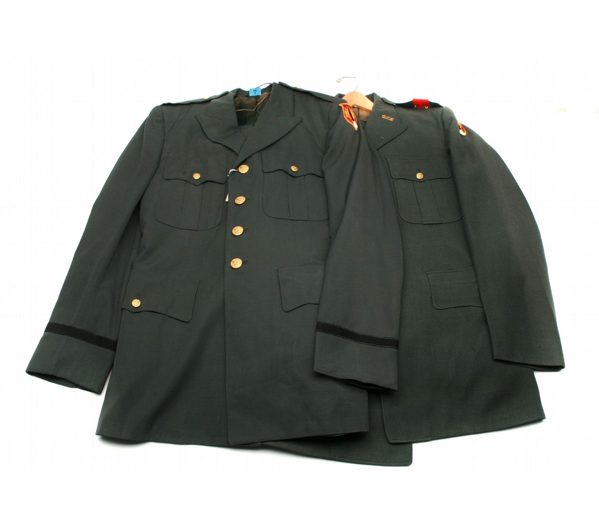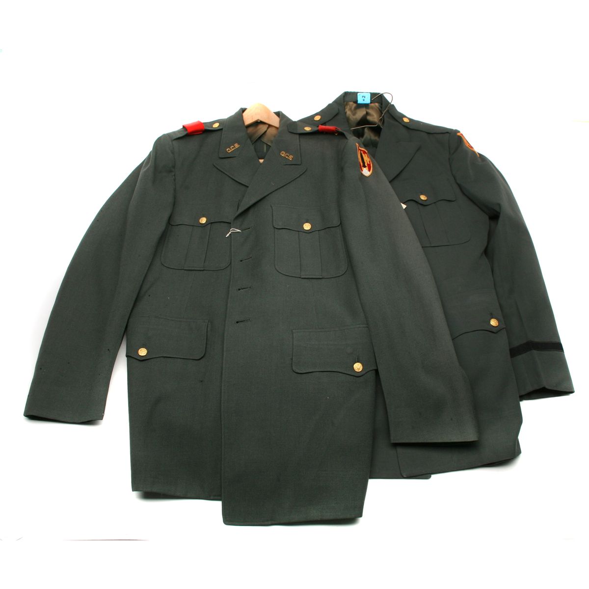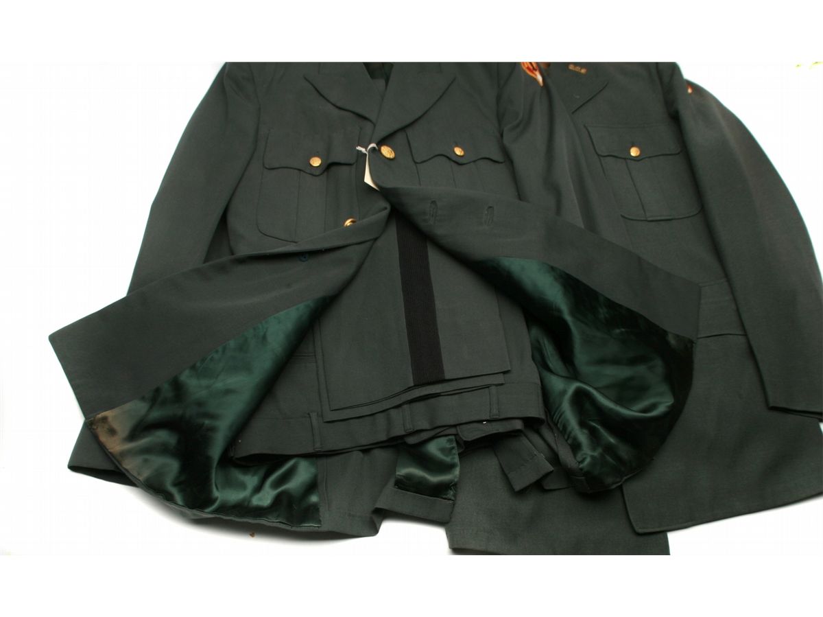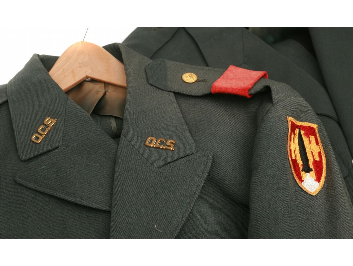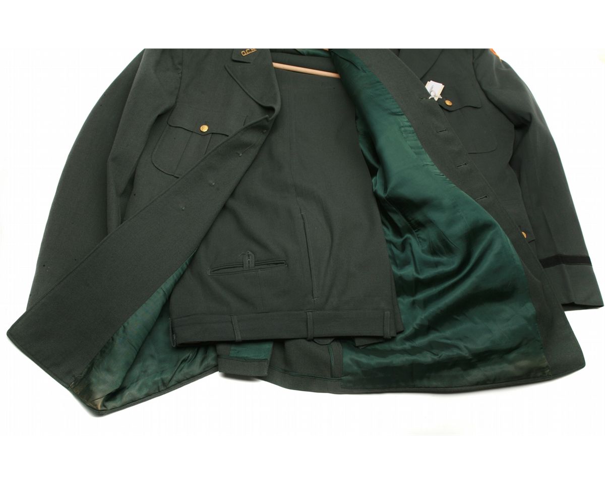 2 pair uniforms (jacket/trousers) with US Army Artillery Missile School patches - one with red epulets and brass Officer Candidate School insignias - both with brass buttons - one jacket size 41L & pants size W35/L34 - one set unmarked size - both sets in used condition with a few moth holes - non-ffl - 25XXJCKS011