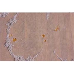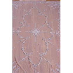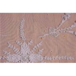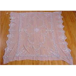 Bed spread with hand rolled edges, machine made lace netting with applied three dimensional crocheted flowers. 7 1/2' x 8'. Est. $200 - $300.