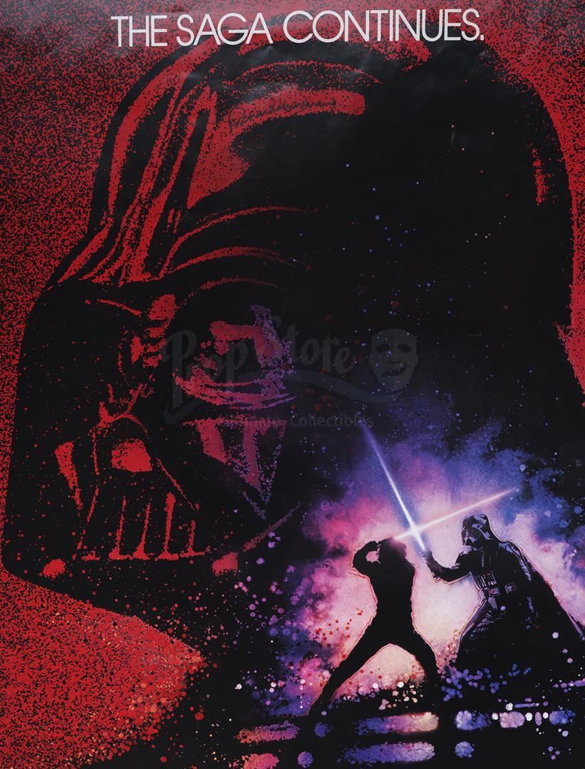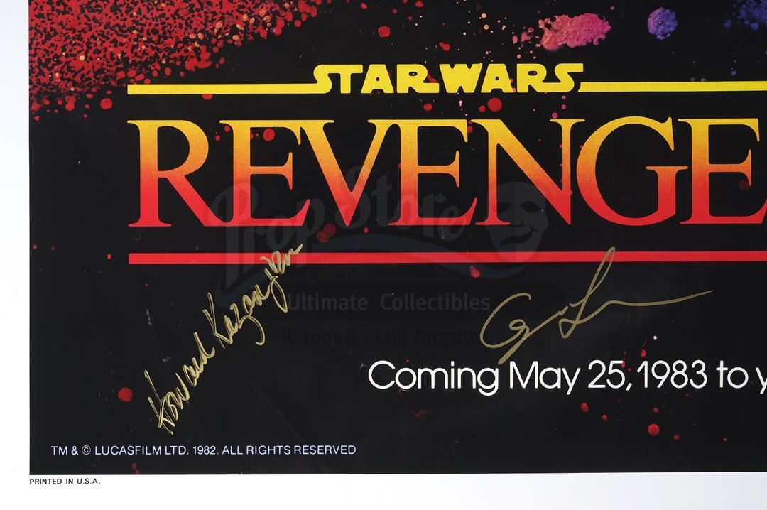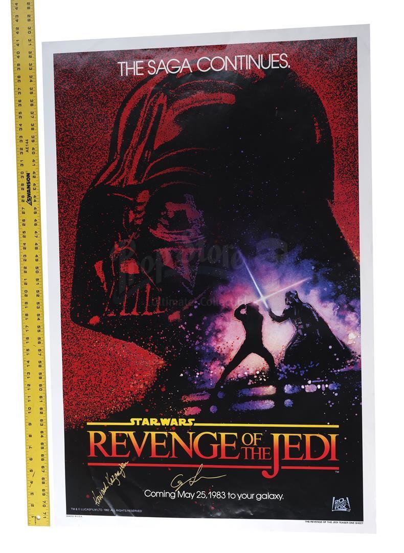 This lot will be auctioned on Tuesday, June 29th. The auction will begin at 9:00am PDT and lots are sold sequentially via live auctioneer; tune in to the live streaming broadcast on auction day to follow the pace. Note other lots in the auction may close on June 30th or July 1st. A "Revenge of the Jedi" teaser one-sheet from the promotion of Richard Marquand's Star Wars: Return of the Jedi signed by Marquand, George Lucas, and producer Howard Kazanjian. Early teaser posters illustrated by artist Drew Struzan featured the film's title, "Revenge of the Jedi," before it was replaced with the final title. This glossy, full-color one-sheet featuring Luke Skywalker (Mark Hamill) and Darth Vader (David Prowse) dueling comes from the collection of Howard Kazanjian. It is signed in black ink over Vader's brow by Marquand and in gold-color ink under the title by Lucas and Kazanjian. Marquand's signature is especially rare as the director passed away in 1987. These signatures are original to the period of the film's release. The poster is in excellent overall condition with only light creasing and edge wear from being rolled for storage. Dimensions: 41" x 27" (104.25 cm x 68.75 cm) Estimate: $3,000 - 5,000