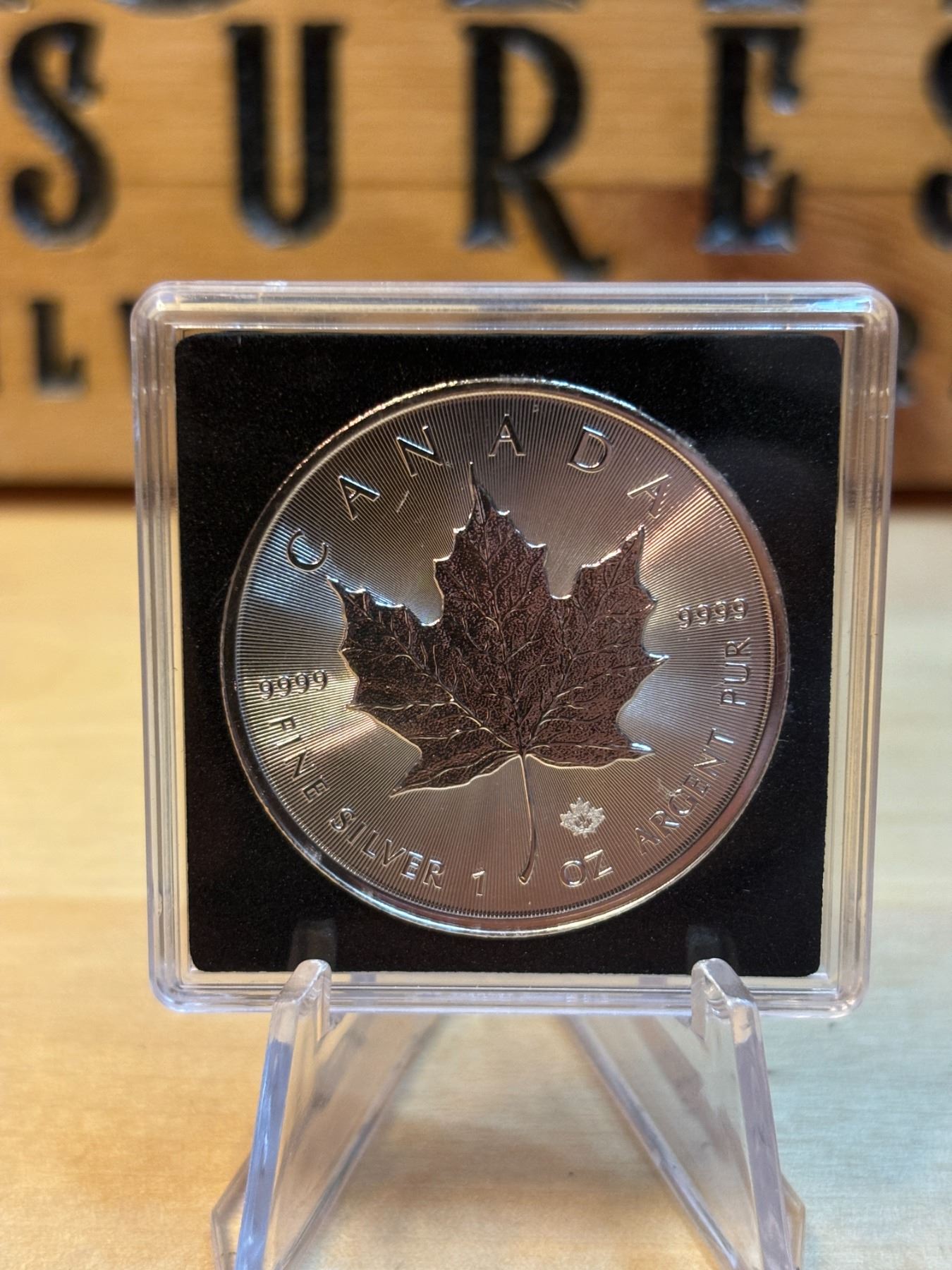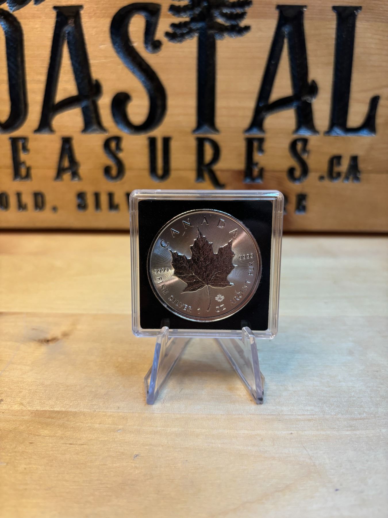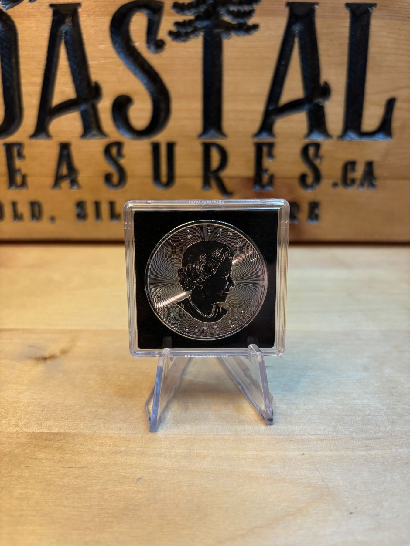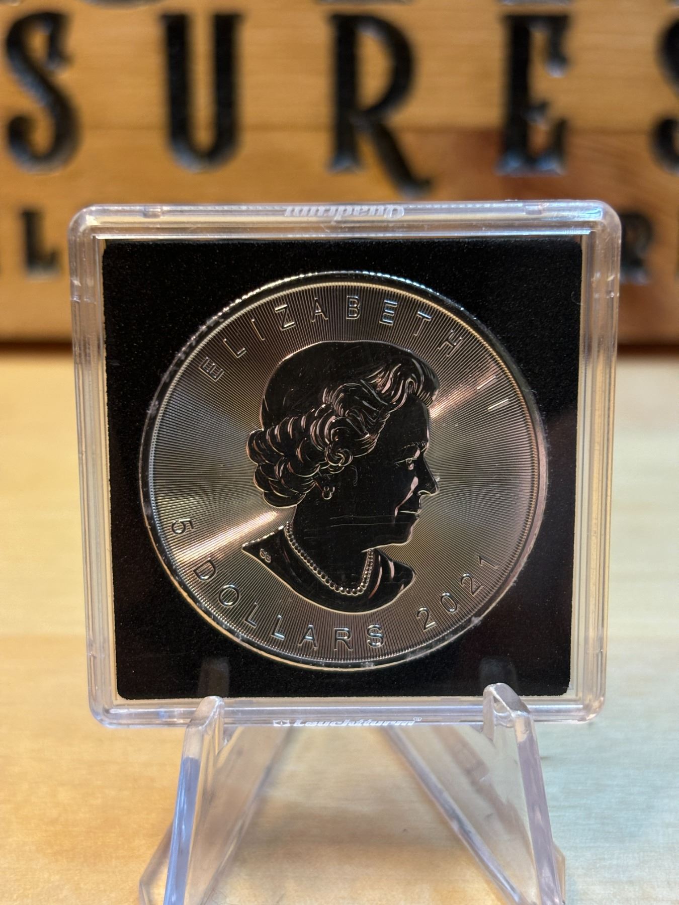 The 1 oz Canadian Maple 2021 Silver Coin is a 1-ounce bullion coin made from 99.99% pure silver and issued by the Royal Canadian Mint. The design features the iconic Maple Leaf, which is Canada's national symbol, and is known for its intricate detailing and high-quality minting. The 2021 version of the coin continues this tradition, with the reverse showcasing a single maple leaf along with the year of issue. The obverse typically features the effigy of Queen Elizabeth II, as is customary on Canadian coins. This coin is highly sought after by collectors and investors for its intrinsic silver value and the reputation of the Royal Canadian Mint for producing top-tier silver bullion coins. The Canadian Maple Leaf is one of the most recognized silver coins globally, making it a popular choice for those seeking to invest in silver or expand their collection.