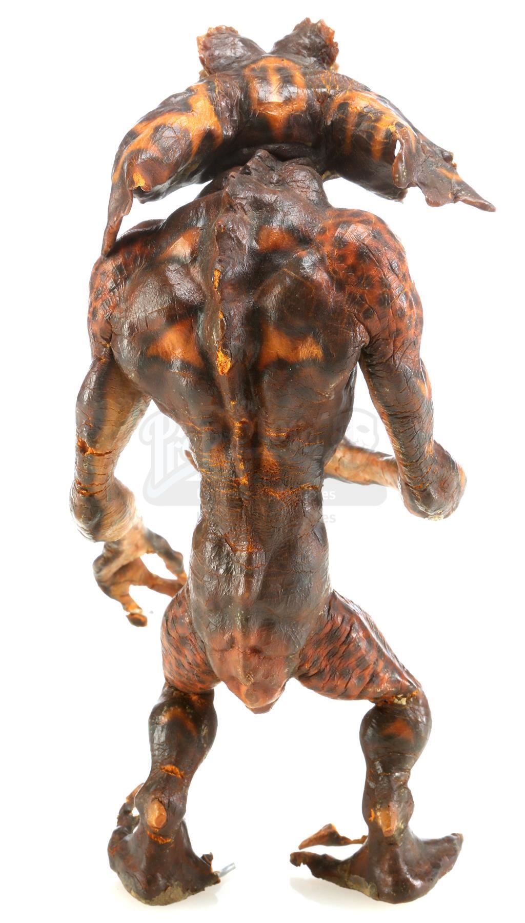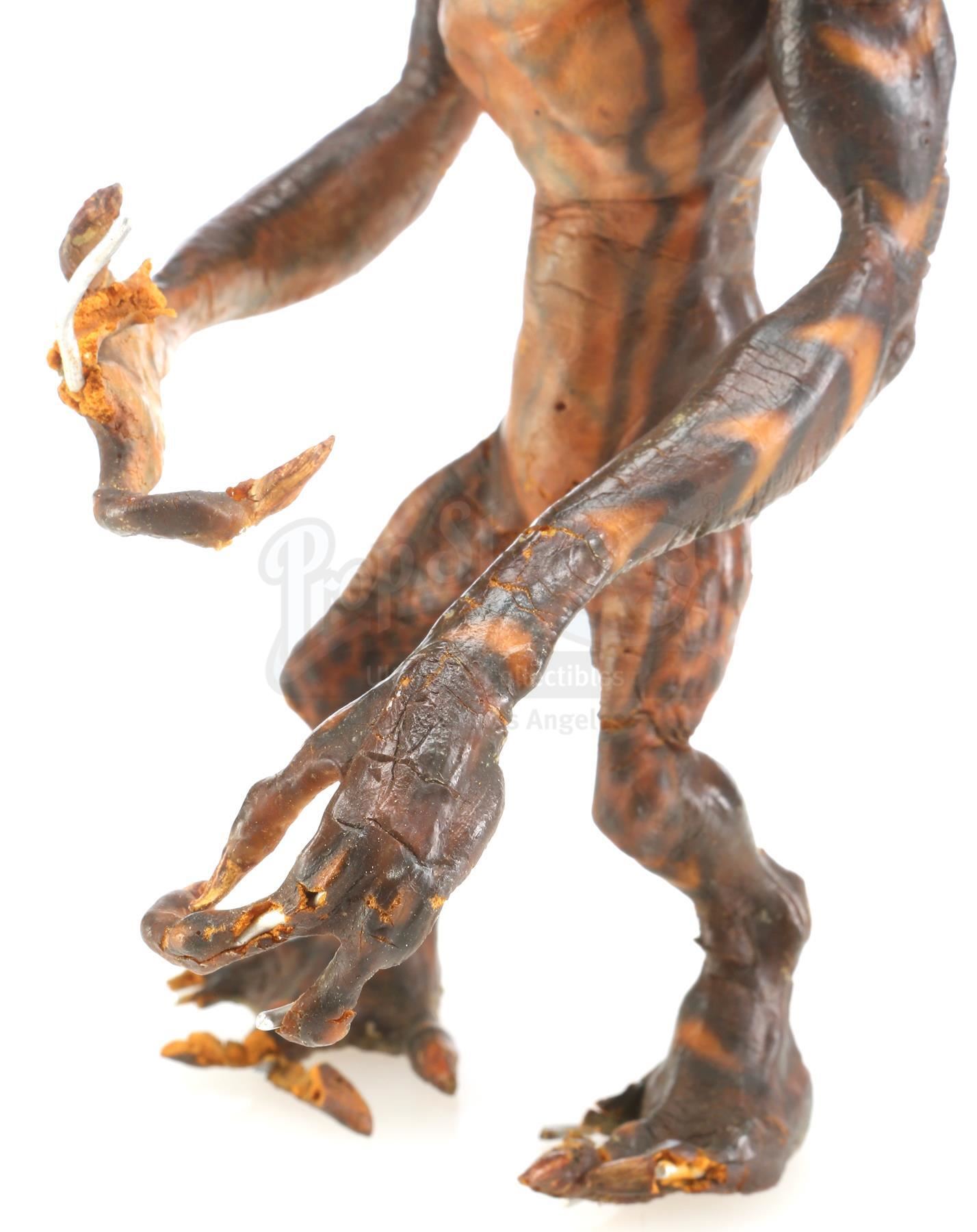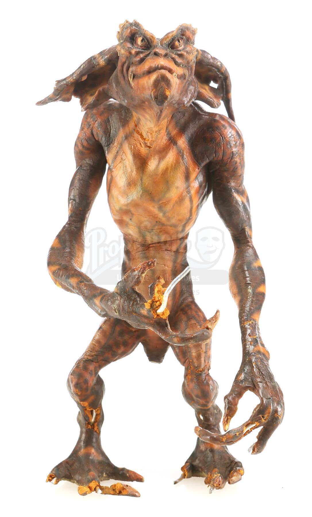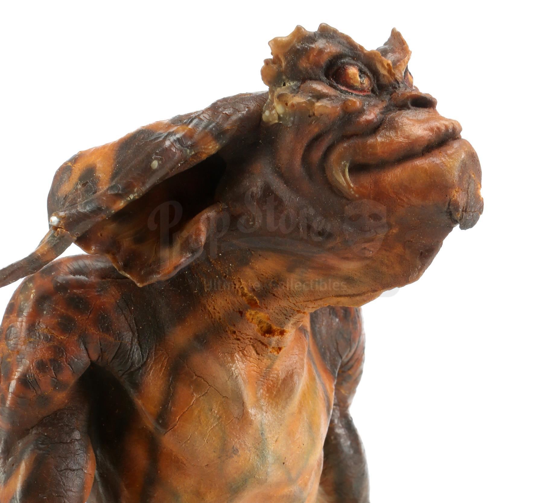 This original hand-painted, spotted brown foam Latex puppet is molded around a metal wire armature and comes with a foam plaque labeled "Gremlins 2: The New Batch Original Stop Motion Puppet" affixed to a black acrylic stand. The foam Latex is brittle from age with the armature exposed in several places, and the puppet remains in fragile but fair overall condition. Dimensions: 4 1/2" x 3" x 8" (11.5 cm x 7.75 cm x 20.5 cm)