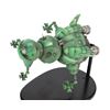 This model miniature is made of resin hand-painted green with additional detailing and intentional distress applied to make the craft look well used. The craft resembles an insect, with three bulbous sections, four landing legs, and rocket thrusters on the rear. Decals reading "Starbug 1" are applied to the front and rear sections on each side of the ship, and "1" transfers are applied to the top of the ship's central compartment and on its fins.