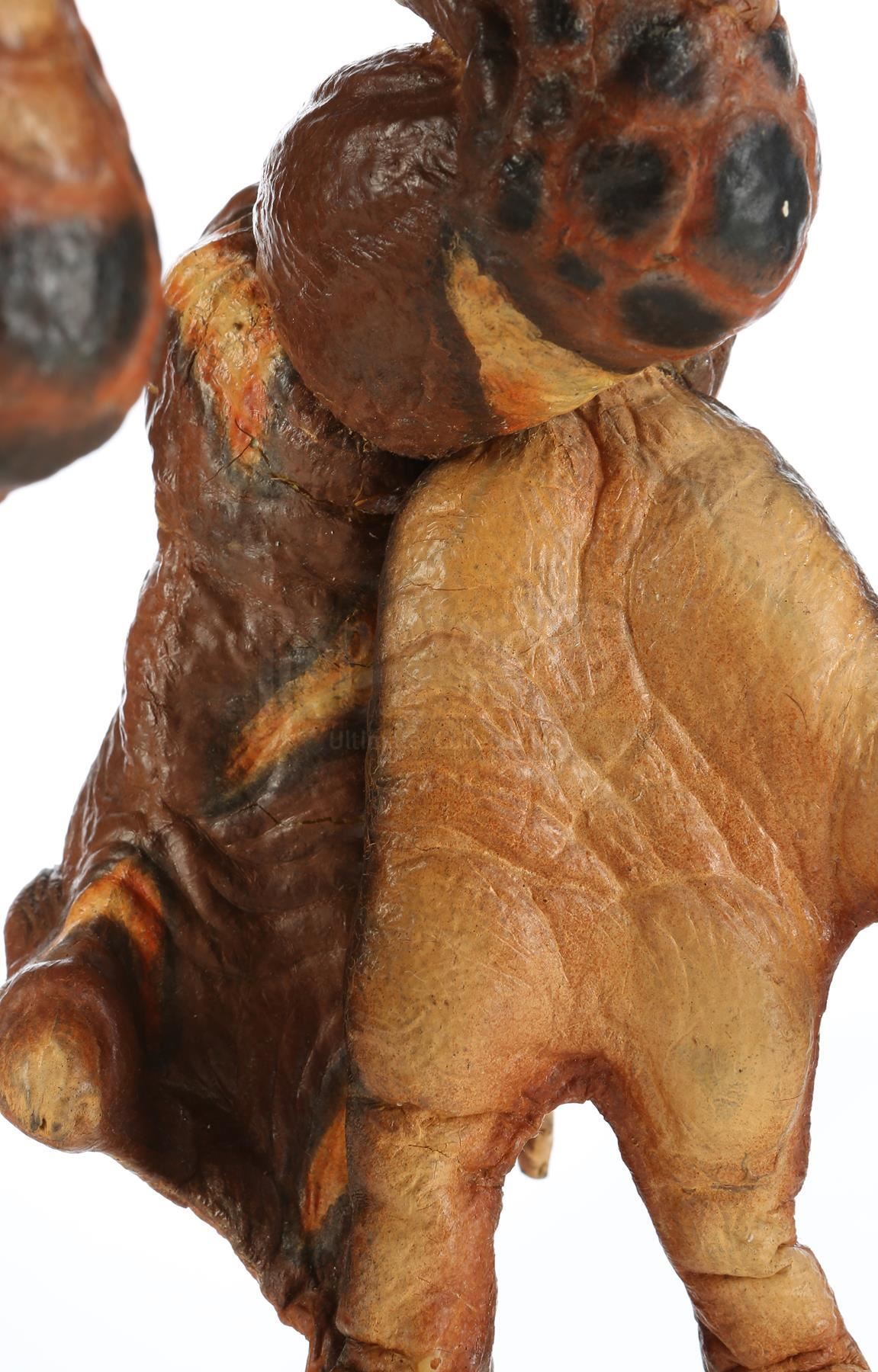 This gremlin is made of latex and polyfoam. It is painted reddish-brown with orange and yellow stripes. Its resin eyes are orange, with red veins and black painted pupils. The puppet's rear is cut open for puppeteering with a flap that covers the hole when not in use. The left arm is tied with fishing line to the left leg. It is in good overall condition with some wear from production and age, including the fragile latex skin cracking and flaking throughout, especially around the right hip, and the aforementioned fishing line digging into the latex.