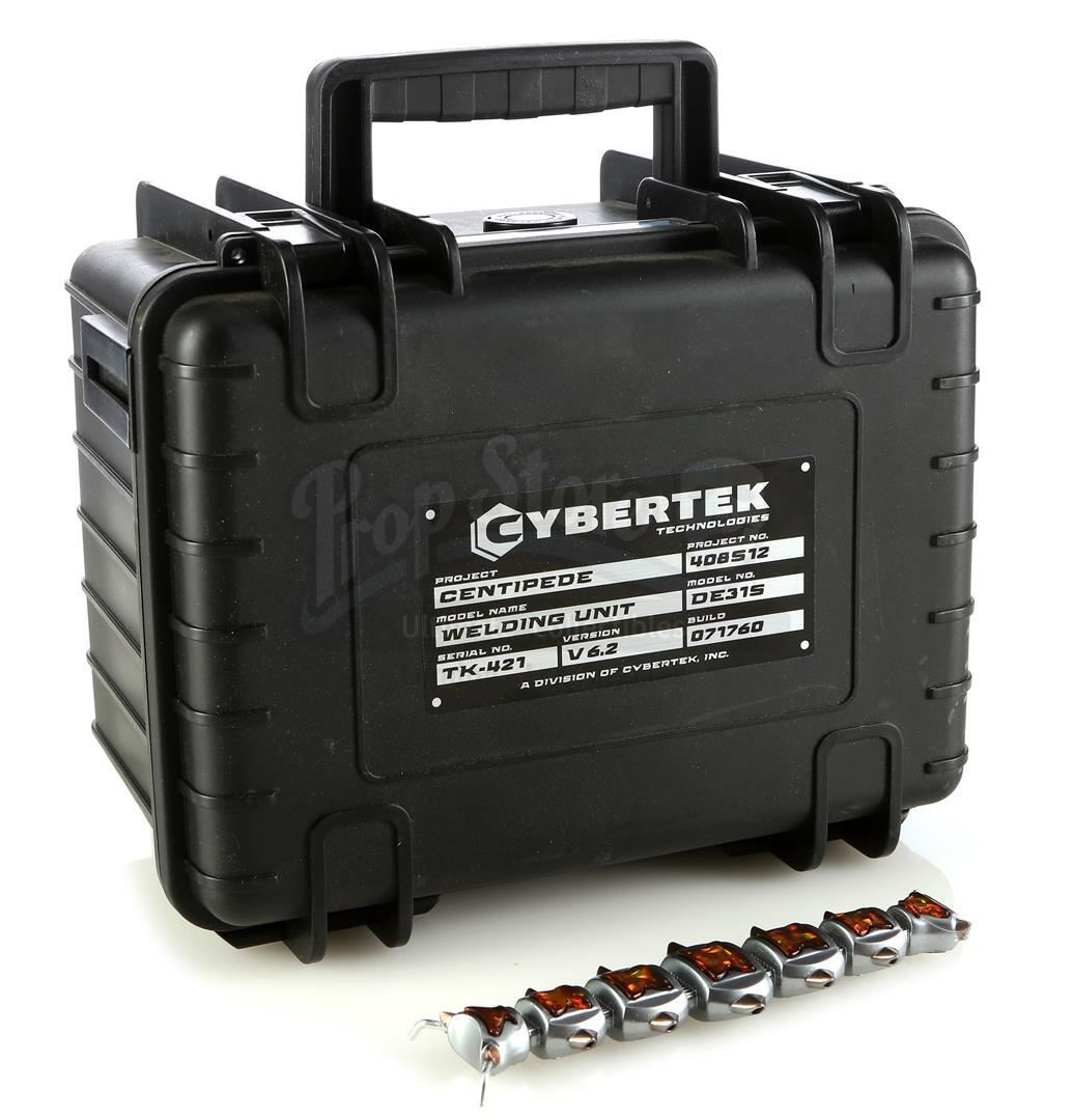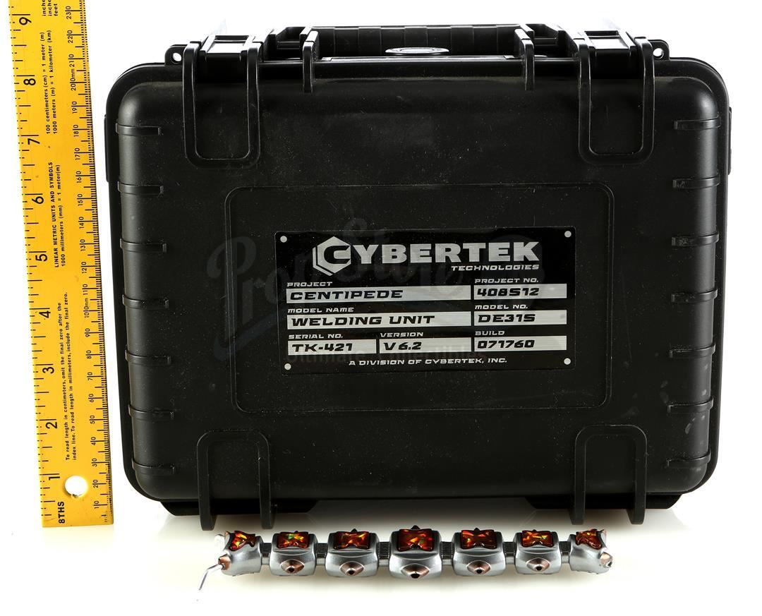 A Centipede and a Cybertek case from Seasons 1 and 5 of Marvel's Agents of S.H.I.E.L.D. Cybertek Technologies, a shadow company for Hydra projects, appears throughout Season 1, while Centipedes containing Cybertek's super soldier serum appear throughout both seasons. This lot consists of a resin and steel Centipede device with pronged antennae at both ends and seven holographic orange faux gemstones inset, as well as a black dense polymer locking case labeled 'Cybertek Technologies'. The lot is in good overall condition with its longer prongs removed or missing, as well as some scuffing to the case from production.