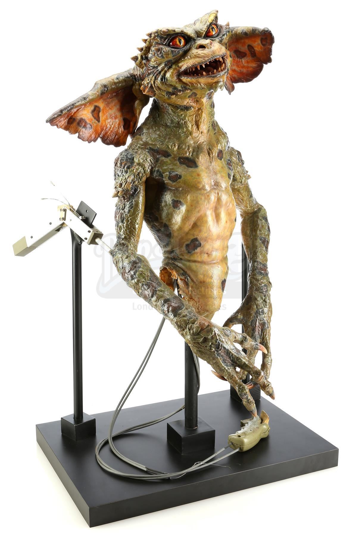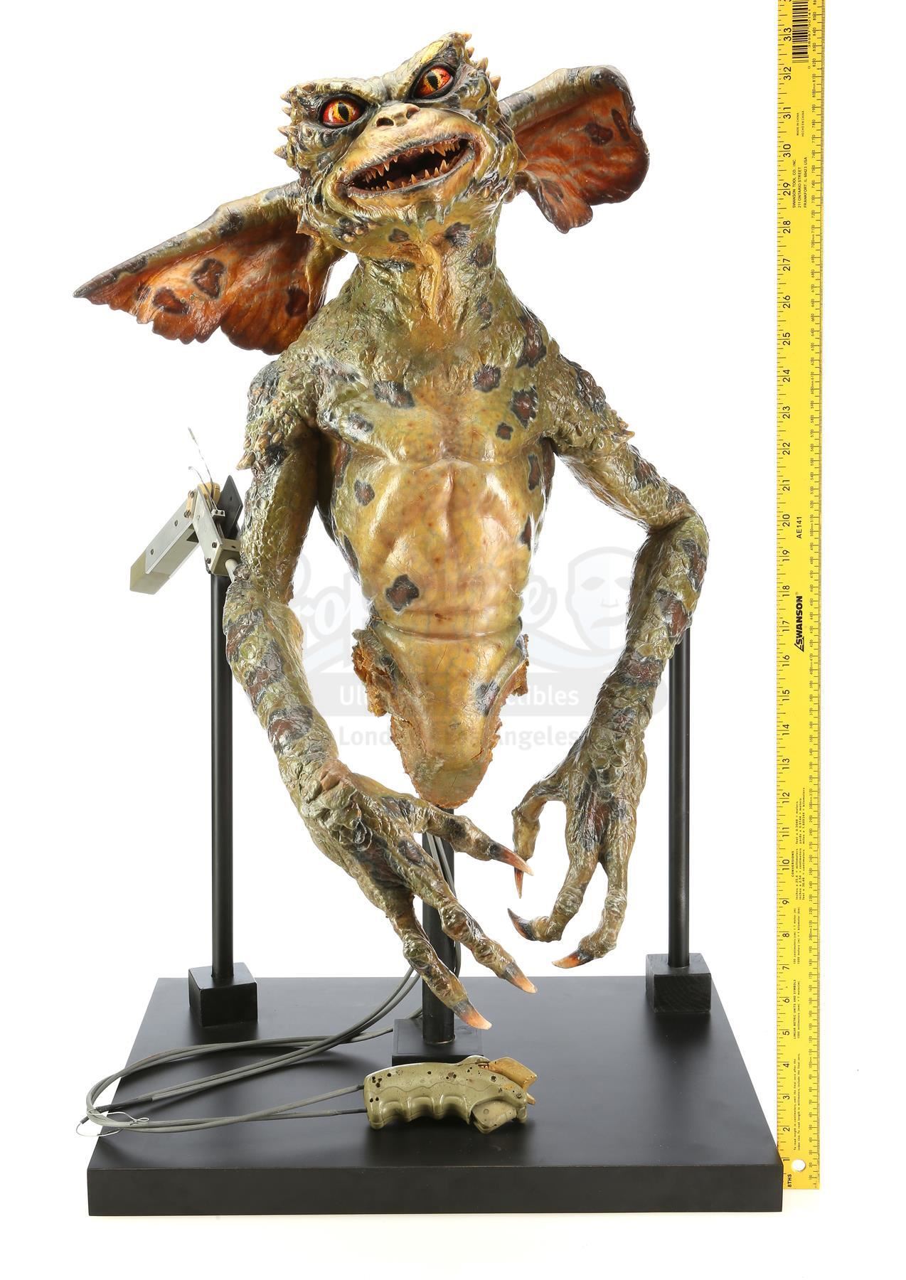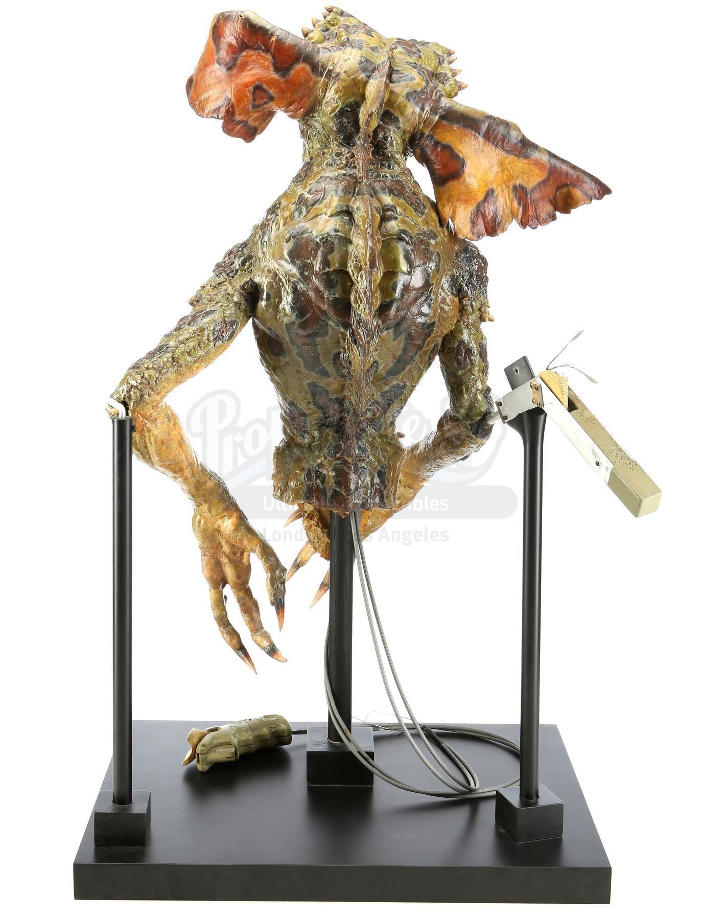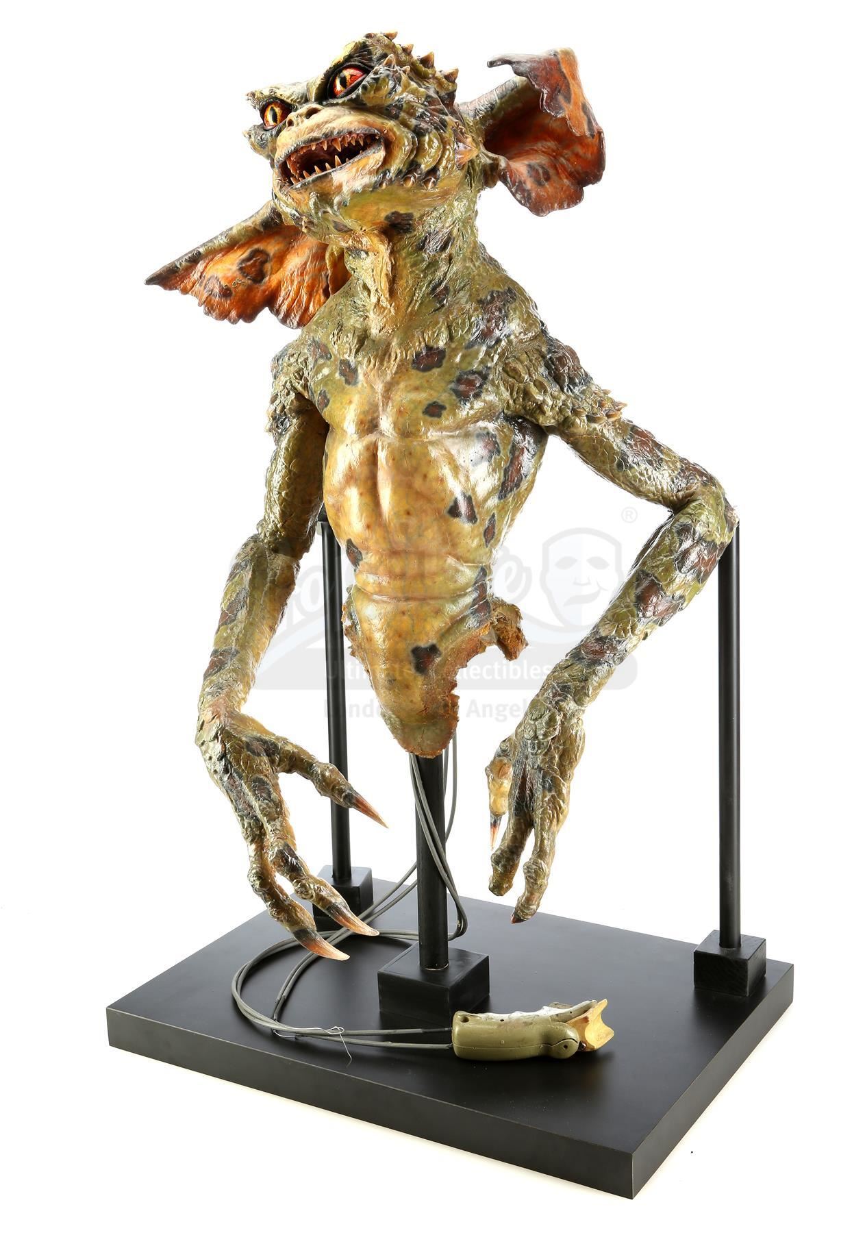 This green and brown-spotted puppet is constructed of foam latex and polyfoam with veiny orange, red, and black resin eyes and animatronic mechanisms implemented throughout, including cables leading from the torso to two toggles which control the eyes, eyelids, and ears. Protruding from the Gremlin's right elbow is a cable mechanism which controls hand and finger movement. The puppet is mounted onto a black display stand. The lot is in excellent overall condition with minimal wear from production and age, including minor deterioration to the foam latex. Dimensions: 20" x 23" x 34" (51 cm x 58.5 cm x 86.5 cm)
