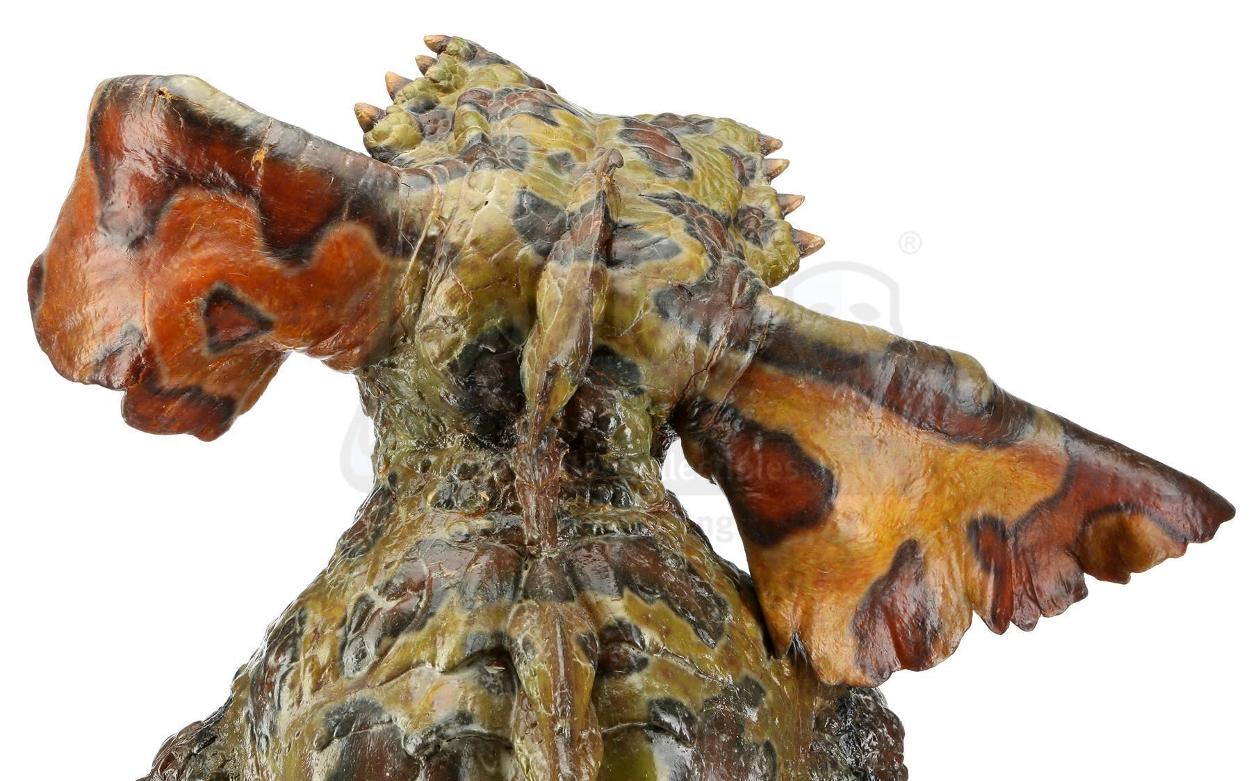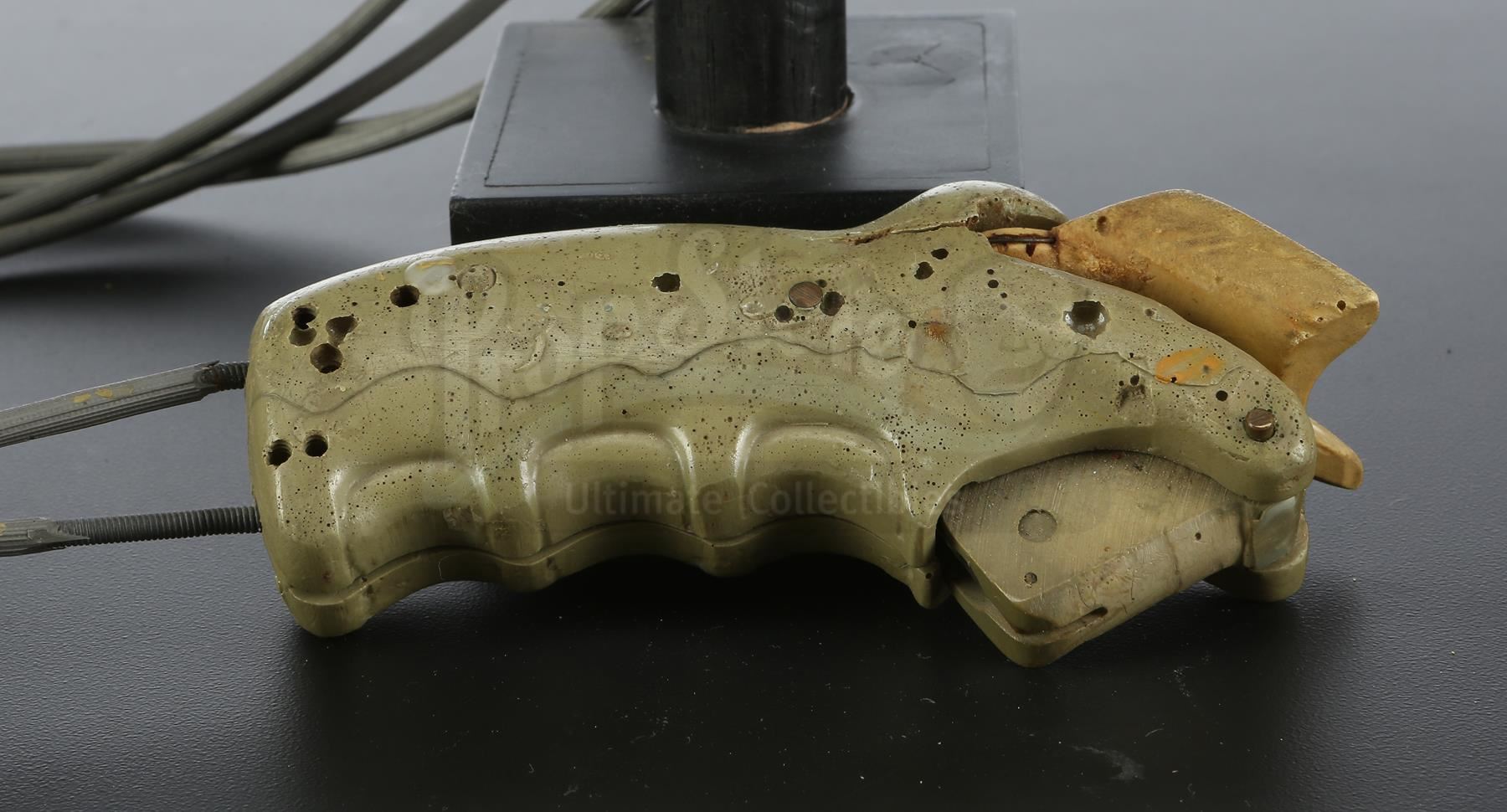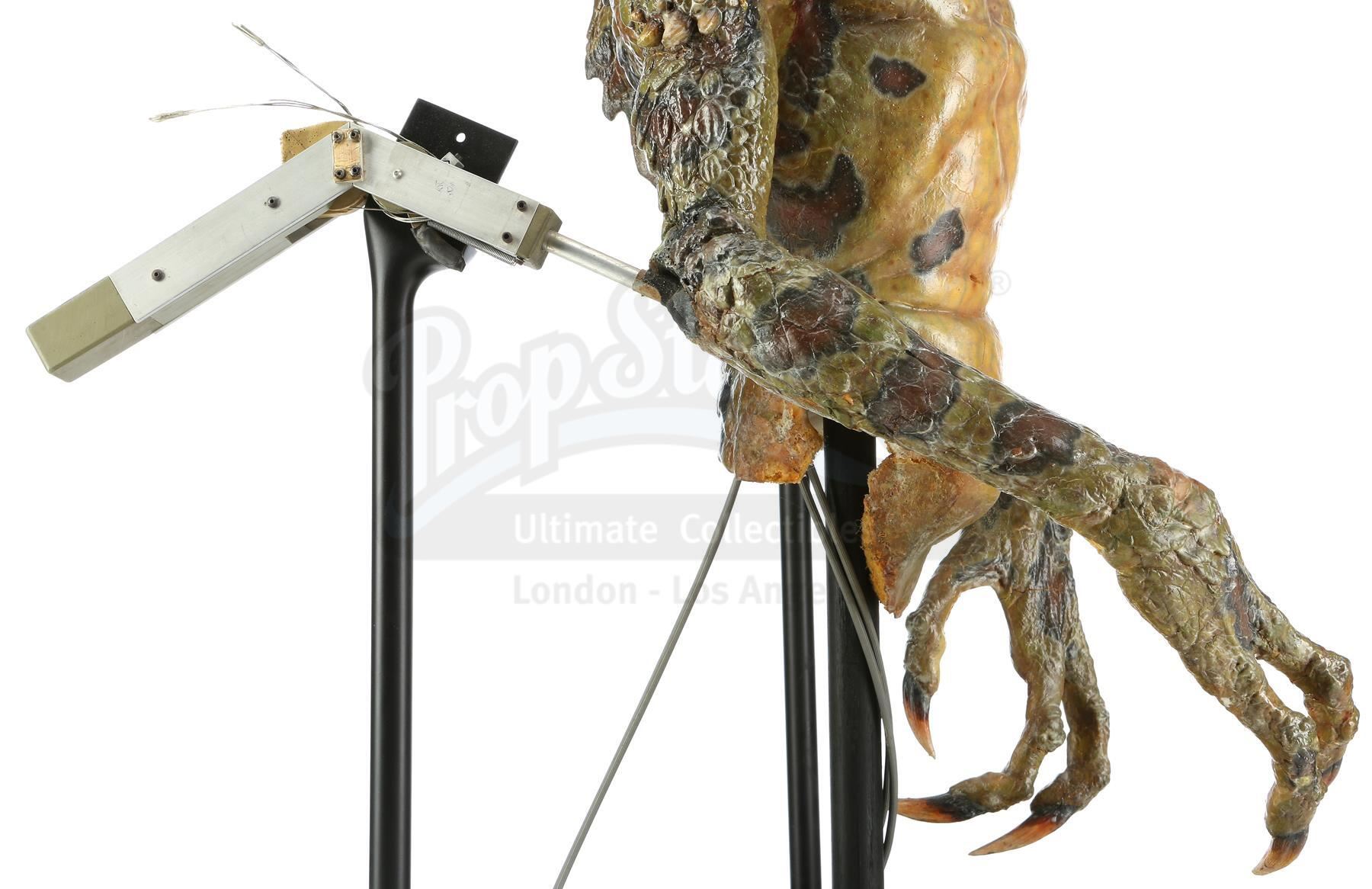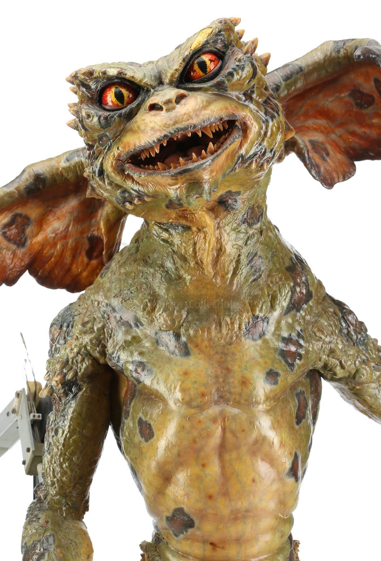 This green and brown-spotted puppet is constructed of foam latex and polyfoam with veiny orange, red, and black resin eyes and animatronic mechanisms implemented throughout, including cables leading from the torso to two toggles which control the eyes, eyelids, and ears. Protruding from the Gremlin's right elbow is a cable mechanism which controls hand and finger movement. The puppet is mounted onto a black display stand. The lot is in excellent overall condition with minimal wear from production and age, including minor deterioration to the foam latex. Dimensions: 20" x 23" x 34" (51 cm x 58.5 cm x 86.5 cm)