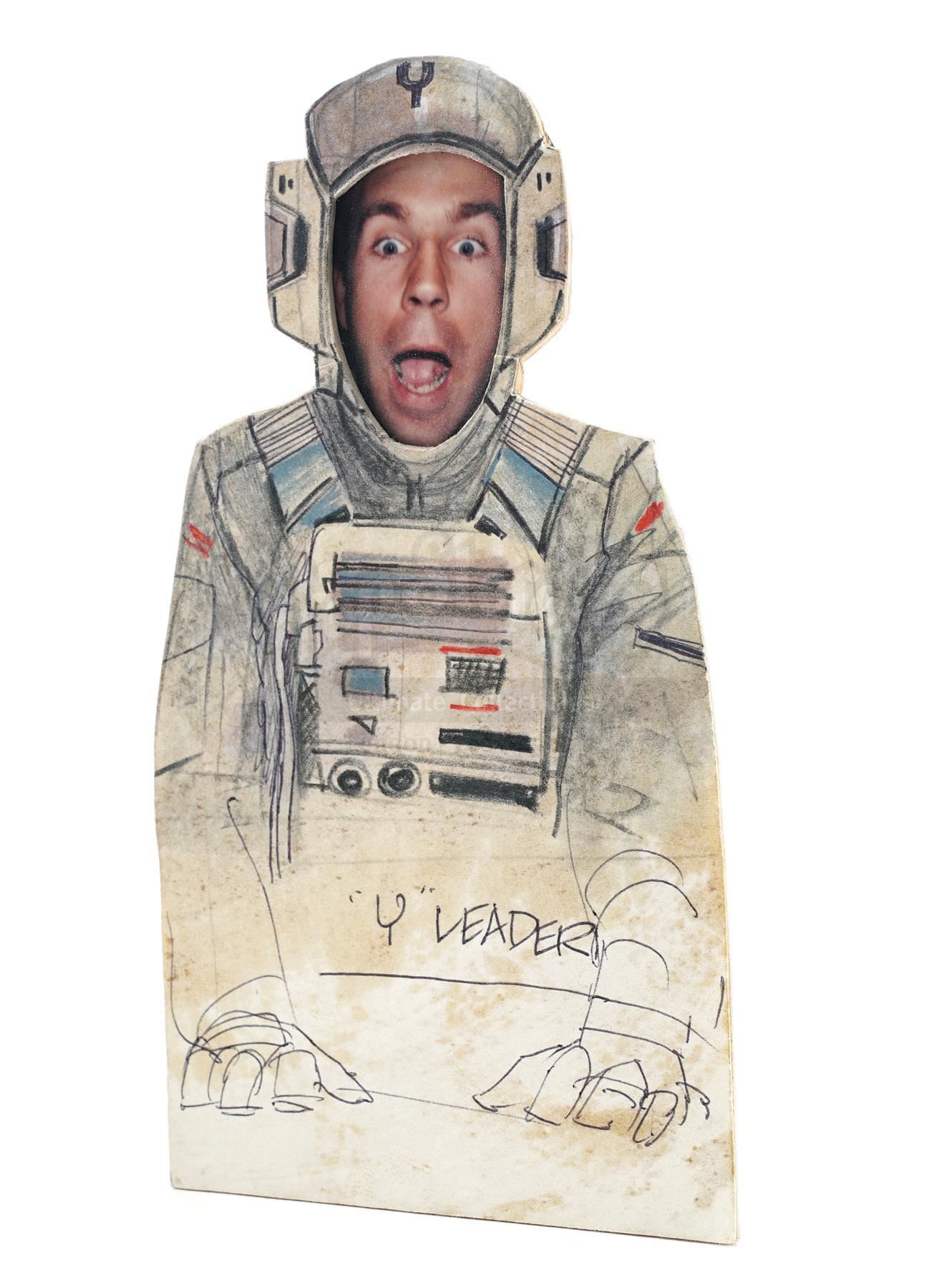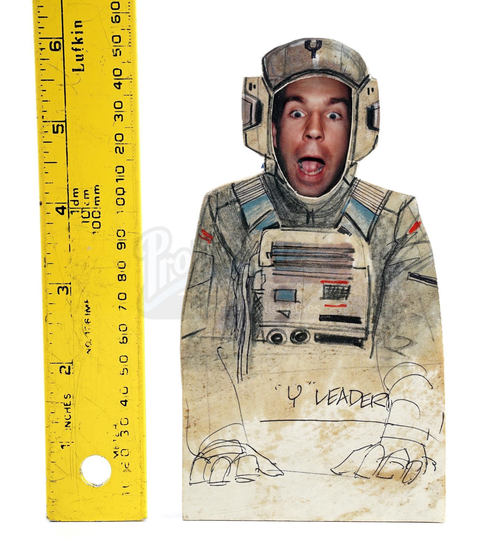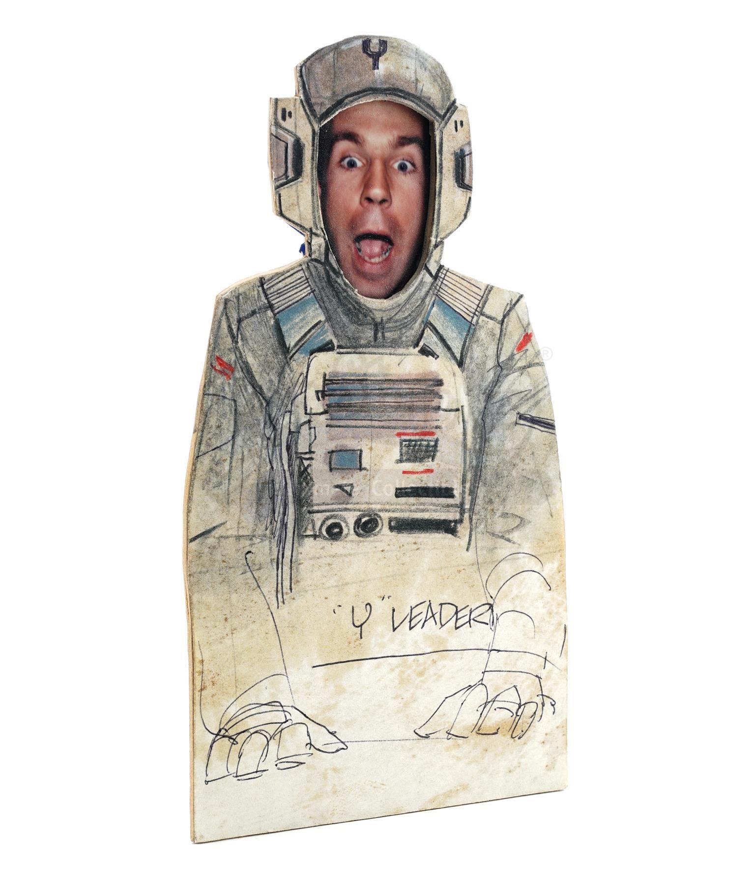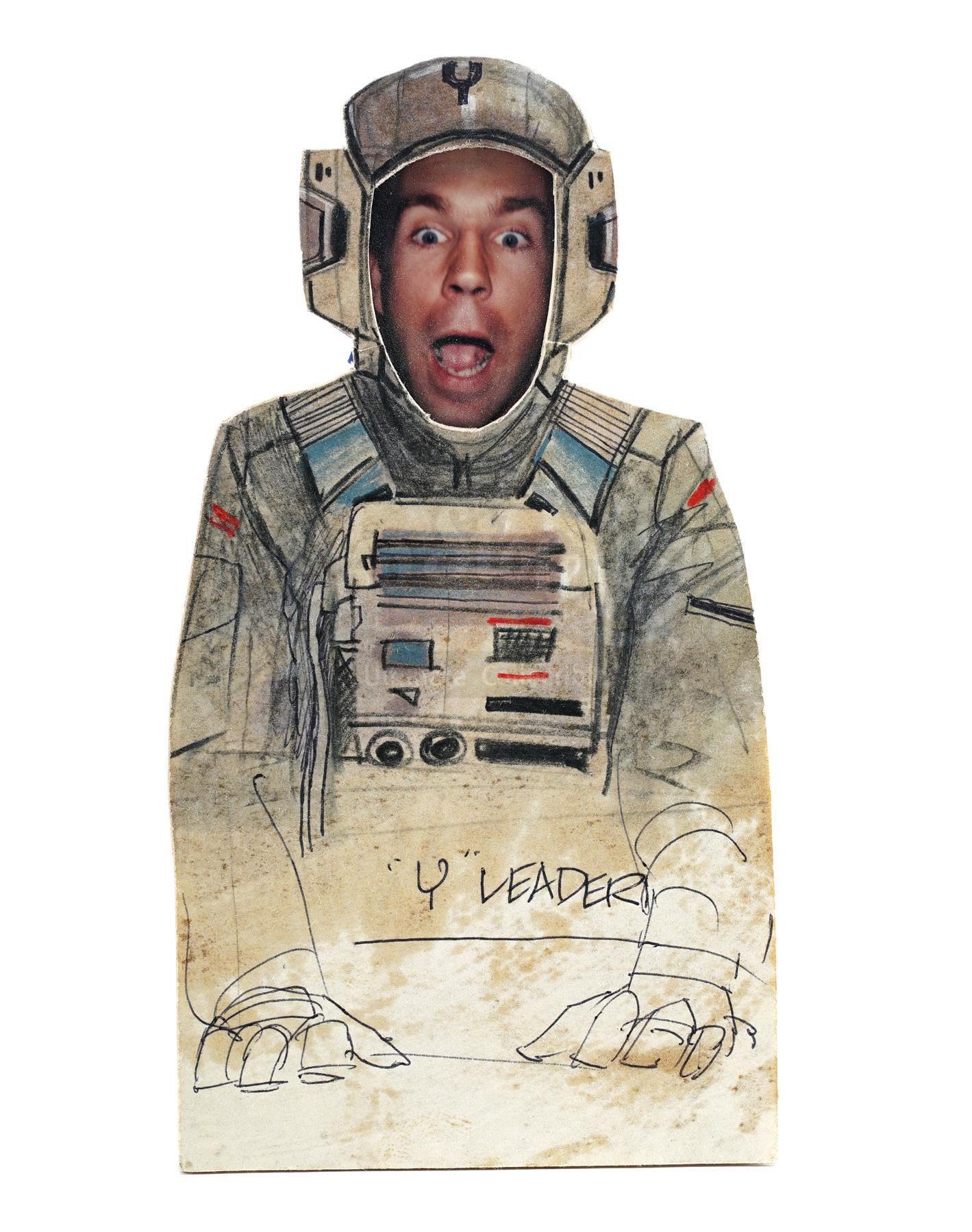 This lot will be auctioned on Tuesday, June 29th. The auction will begin at 9:00am PDT and lots are sold sequentially via live auctioneer; tune in to the live streaming broadcast on auction day to follow the pace. Note other lots in the auction may close on June 30th or July 1st. A Y-Wing pilot video animatics character cut-out hand-drawn by Nilo Rodis-Jamero from Richard Marquand's Star Wars: Return of the Jedi. Costume designer and visual effects illustrator Rodis-Jamero created this cut-out character for use in filming pre-visualization video animatics created by Industrial Light & Magic (ILM). Pilots were needed for insert shots within the animatics, and several characters were created. The illustration is rendered in ink, graphite, and colored pencil and labeled ""Y" Leader" with a photograph of ILM cameraman Peter Romano taped to the back as an in-joke. It is in good overall condition with some stains to the front and wear throughout from handling. Dimensions: 6" x 4" x 0.5" (15.25 cm x 10.25 cm x 1.5 cm) Sold without copyright; see notice in Buyer's Guide. Estimate: $2,000 - 3,000