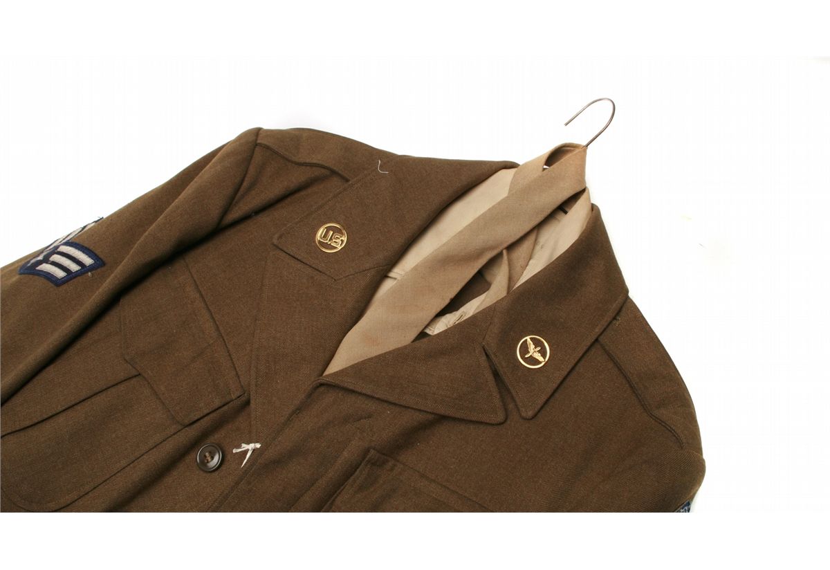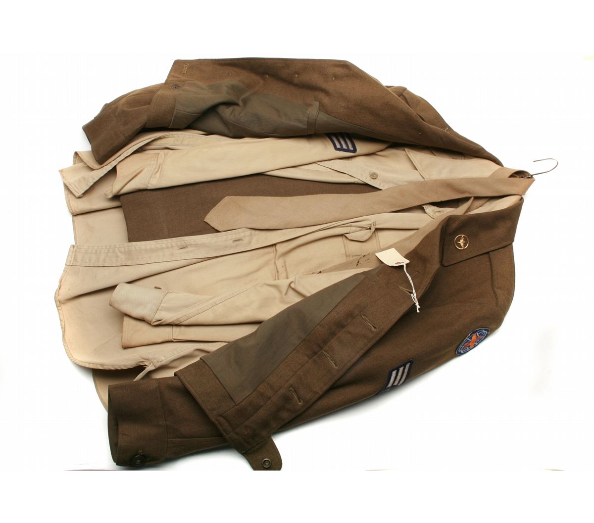 OD wool field jacket size 38R in good/used condition - Military Airlift Transport Command patch - brass US and Aviator collar insignia - khaki shirt with some staining - unmarked size - wool trousers size W43/L33 with some staining/holes - khaki tie with some staining - Sr Airman patches - non-ffl - 25CRRMA075