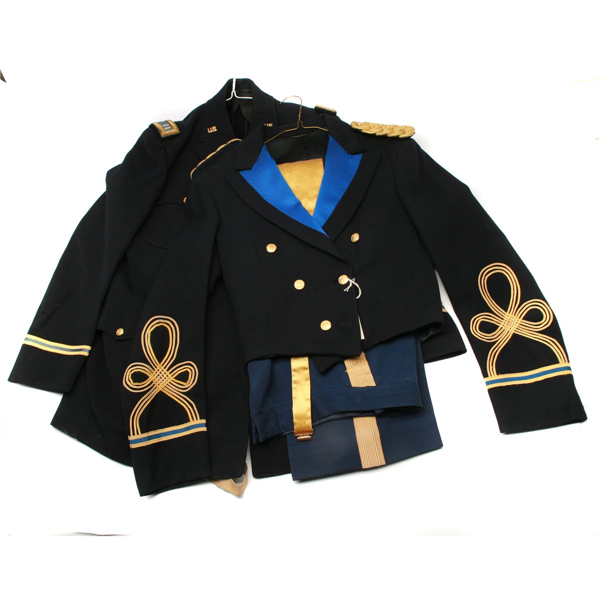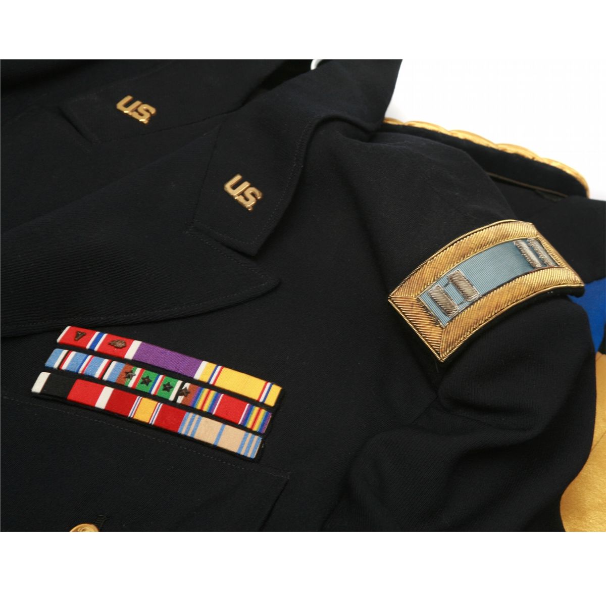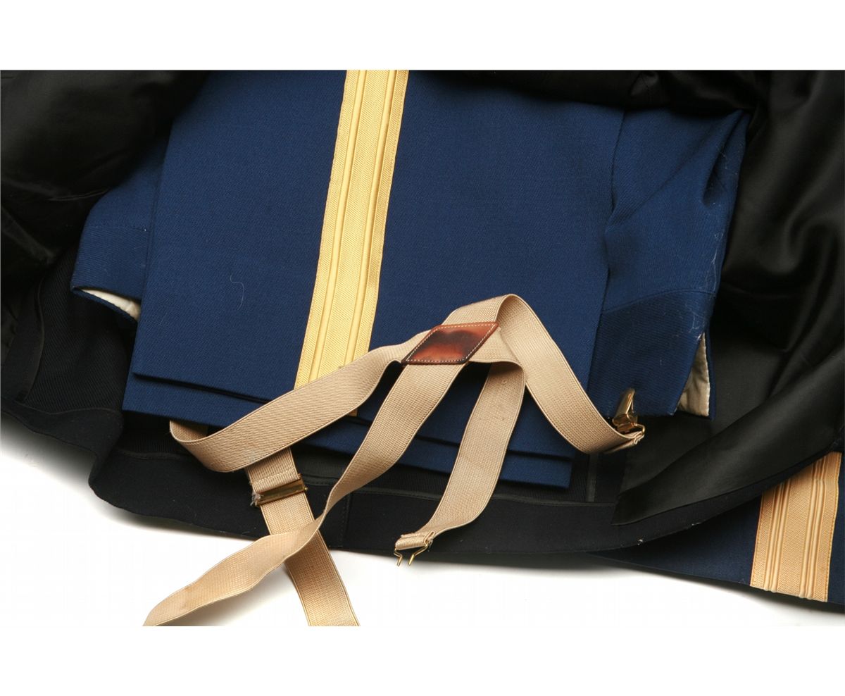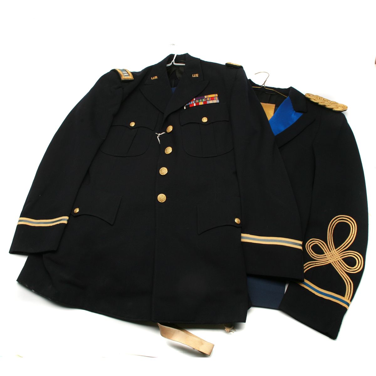 formal dress uniform with US Army brass buttons - unmarked size with matching size 9 1/2x33 trousers & cumberbund - WW2 US Army Capt's dress blues set - brass US insignia on collars - brass US Army buttons - medal ribbons including Bronze Star with combat V and oak leaf, Purple Heart, American Defense, American Campaign, European Theater with 4 battle stars, WW2 Victory, WW2 Army of Occupation, National Defense Service, Armed Forces Reserve medal - unmarked size - suspenders - all in good/used condition - non-ffl - 25CRRMA076