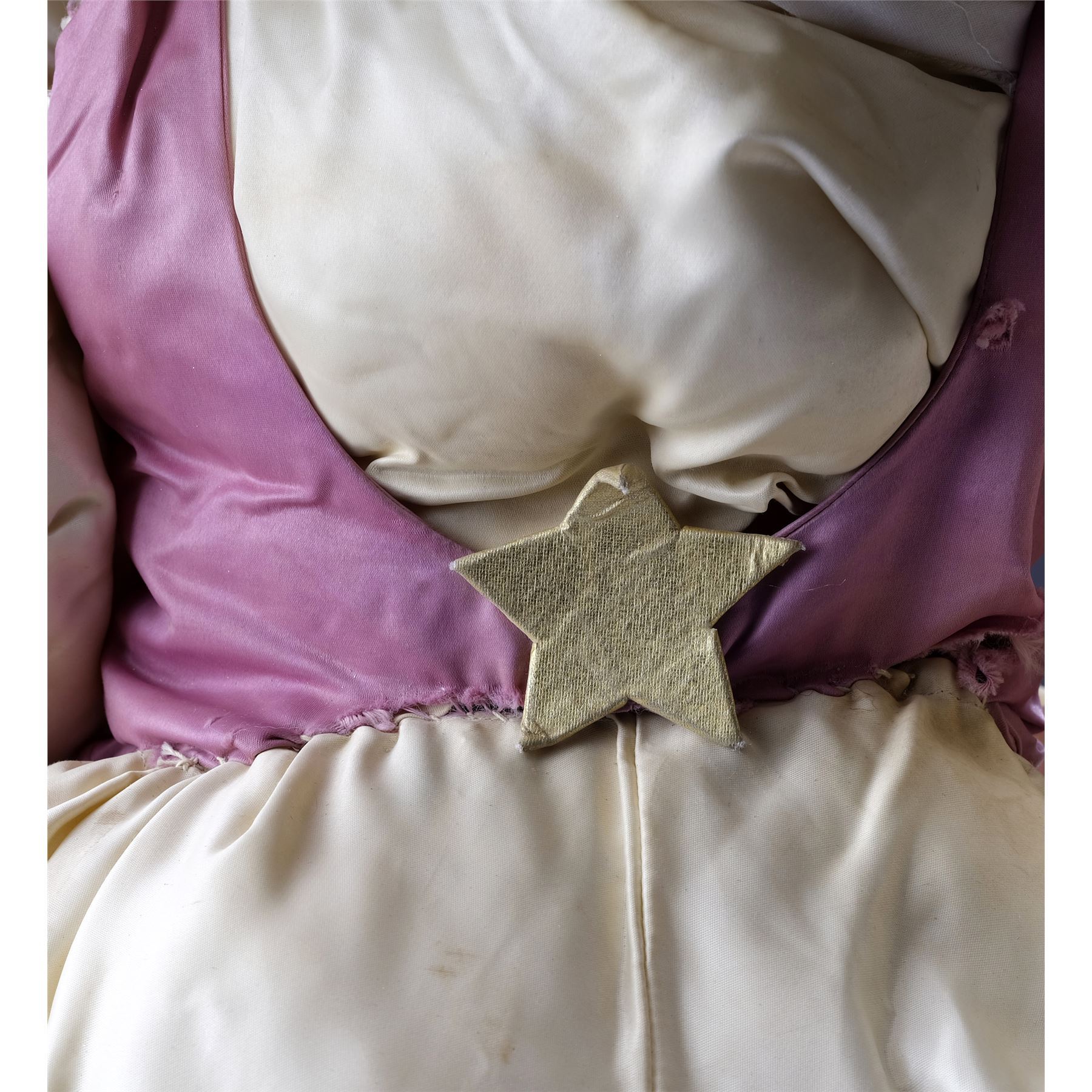 This clown doll features a plaster head with a hand-painted face and synthetic orange hair. It is hand-sewed onto the body by holes along the neckline. The hat and body are made of a poly-blend sateen fabric with decorative stars and moons adhered directly to the fabric. The hat and body have an internal wire armature and are filled out with polyfill. The design of this particular doll has exaggerated features such as a rounder body and longer limbs. The seams of the frills and vest still retain their original blue color, while the majority of the fabric on the cuffs and hat has faded over the years from the strong blue to a much softer pink tone. This doll exhibits cracks in the plaster head from filming, notable glue residue from on-set repairs, torn fabric, frayed threads, discoloration, and faded color. Dimensions: 53" x 18" x 7" (134.75 cm x 45.75 cm x 18 cm)