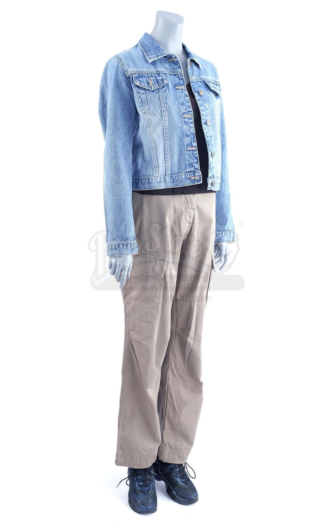 The faded denim jacket is a Euro size 38 and the black V-neck shirt is made of cotton. The dark khaki cargo pants are also made of cotton and the pair of blue tennis shoes are a U.S. size 7. The costume shows minimal signs of wear from production and remains in good overall condition.