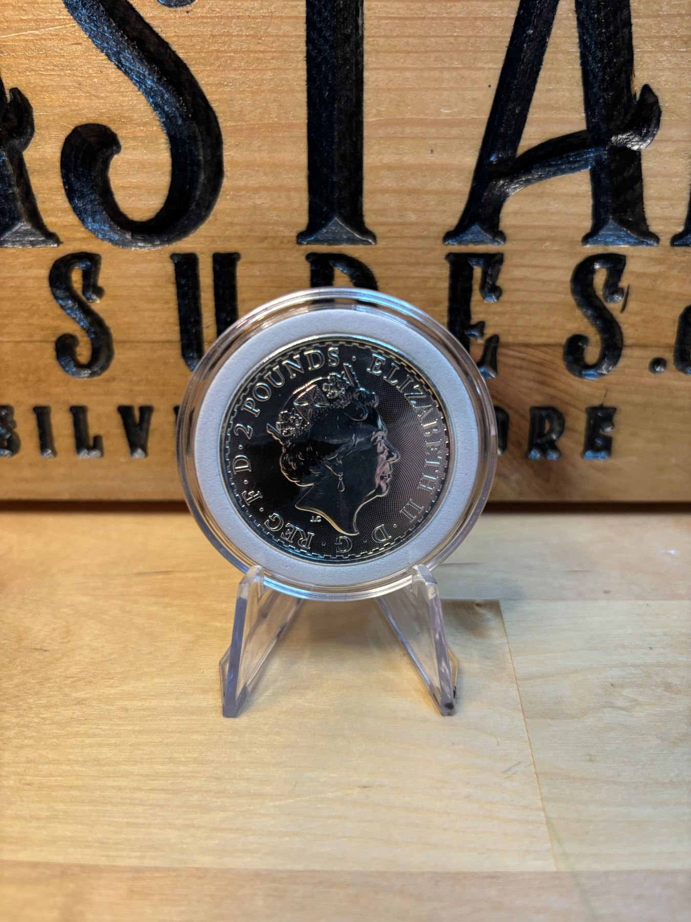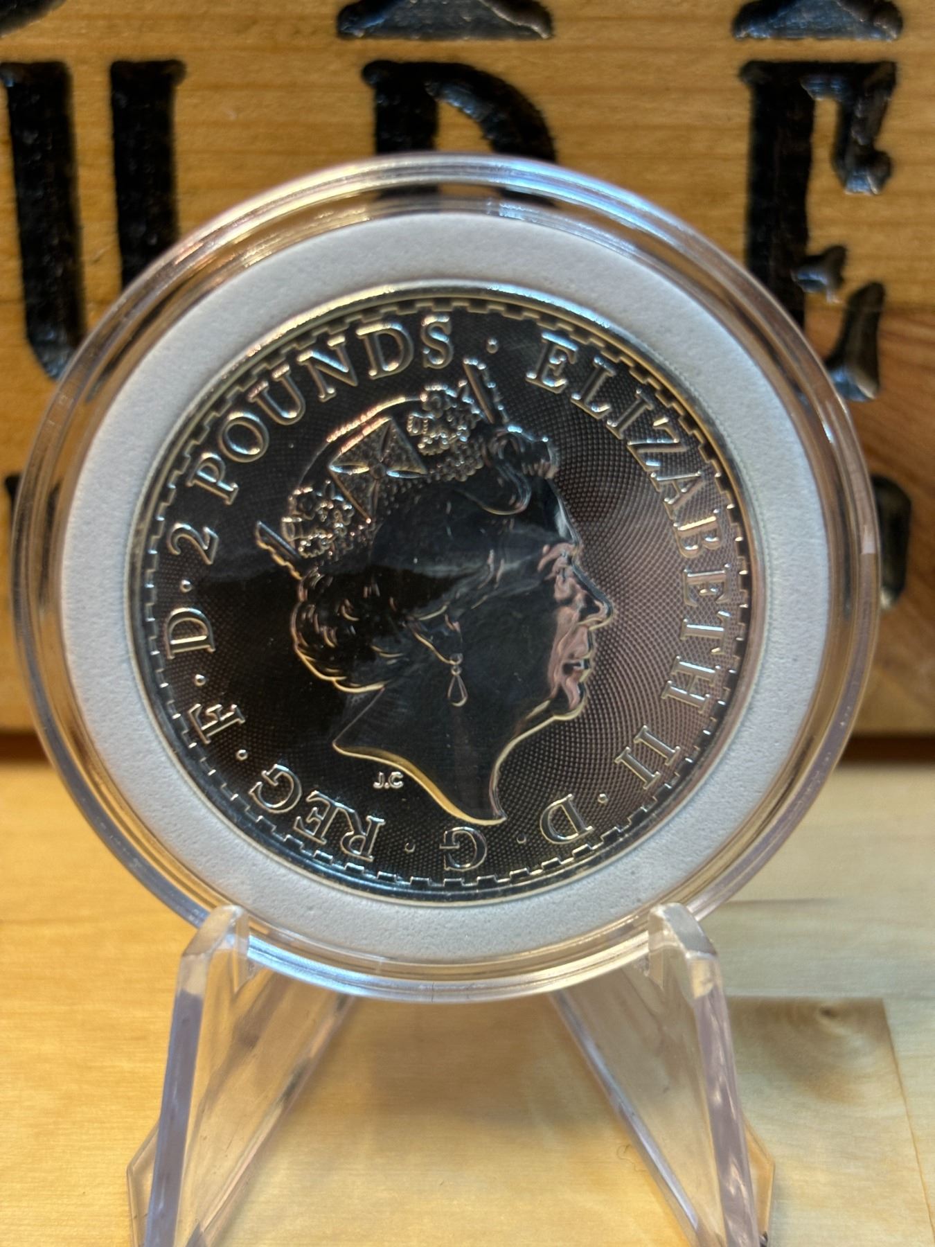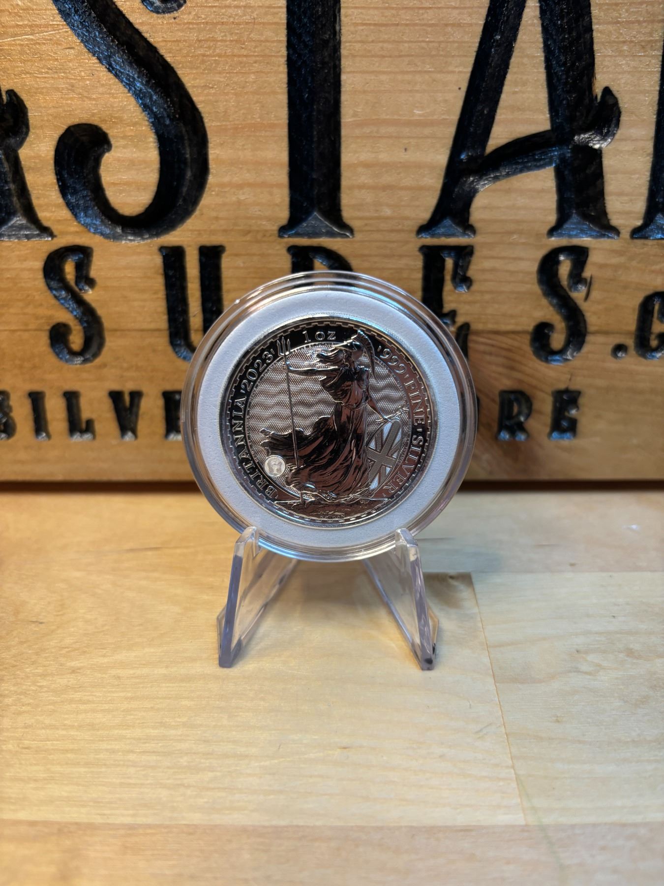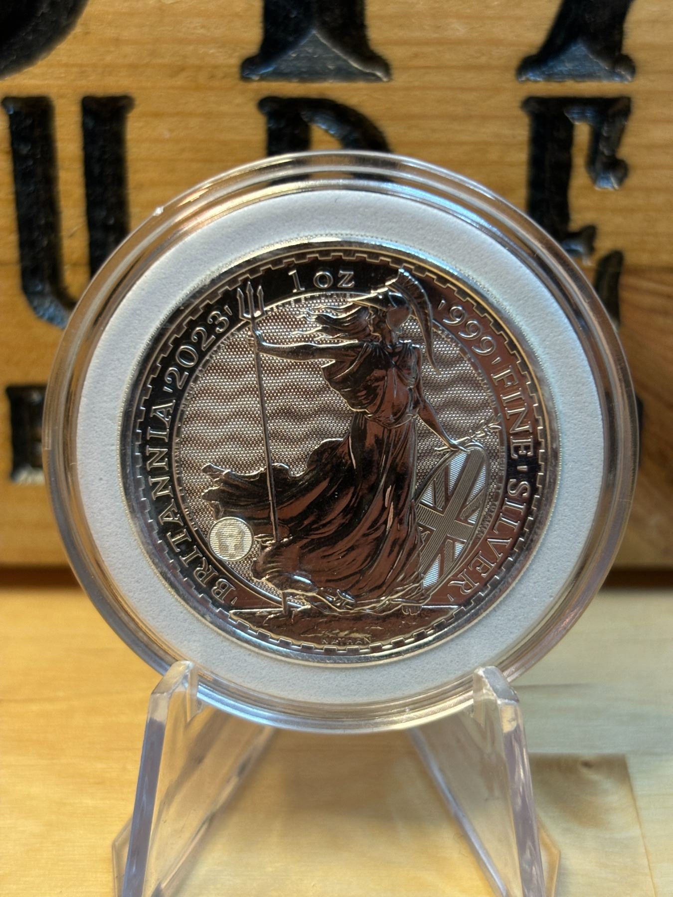 The 1 oz Britannia 2023 Silver Coin is part of the popular Britannia series, produced by the Royal Mint. It contains 1 ounce of .999 fine silver and features the iconic image of Britannia, symbolizing strength and resilience. The 2023 edition features an updated design with enhanced security features, such as a new background wave pattern and a holographic foil that changes in the light, making it more difficult to counterfeit. The coin is widely sought after by collectors and investors alike.
