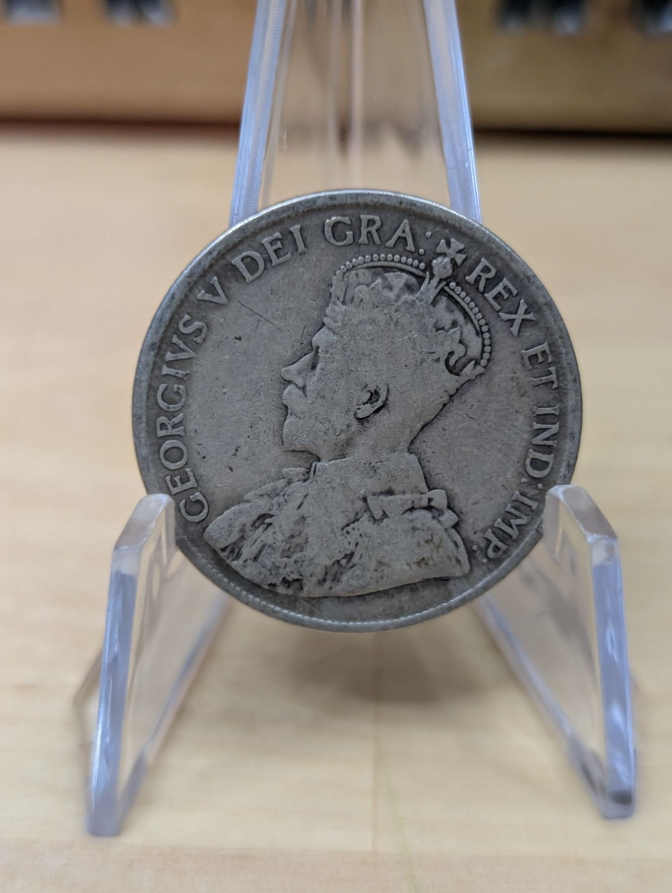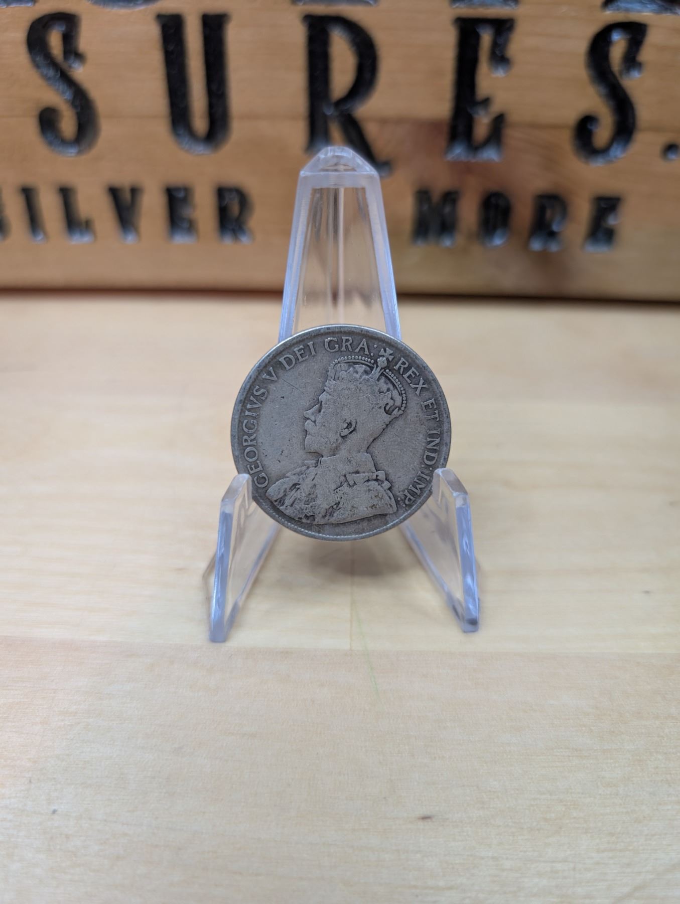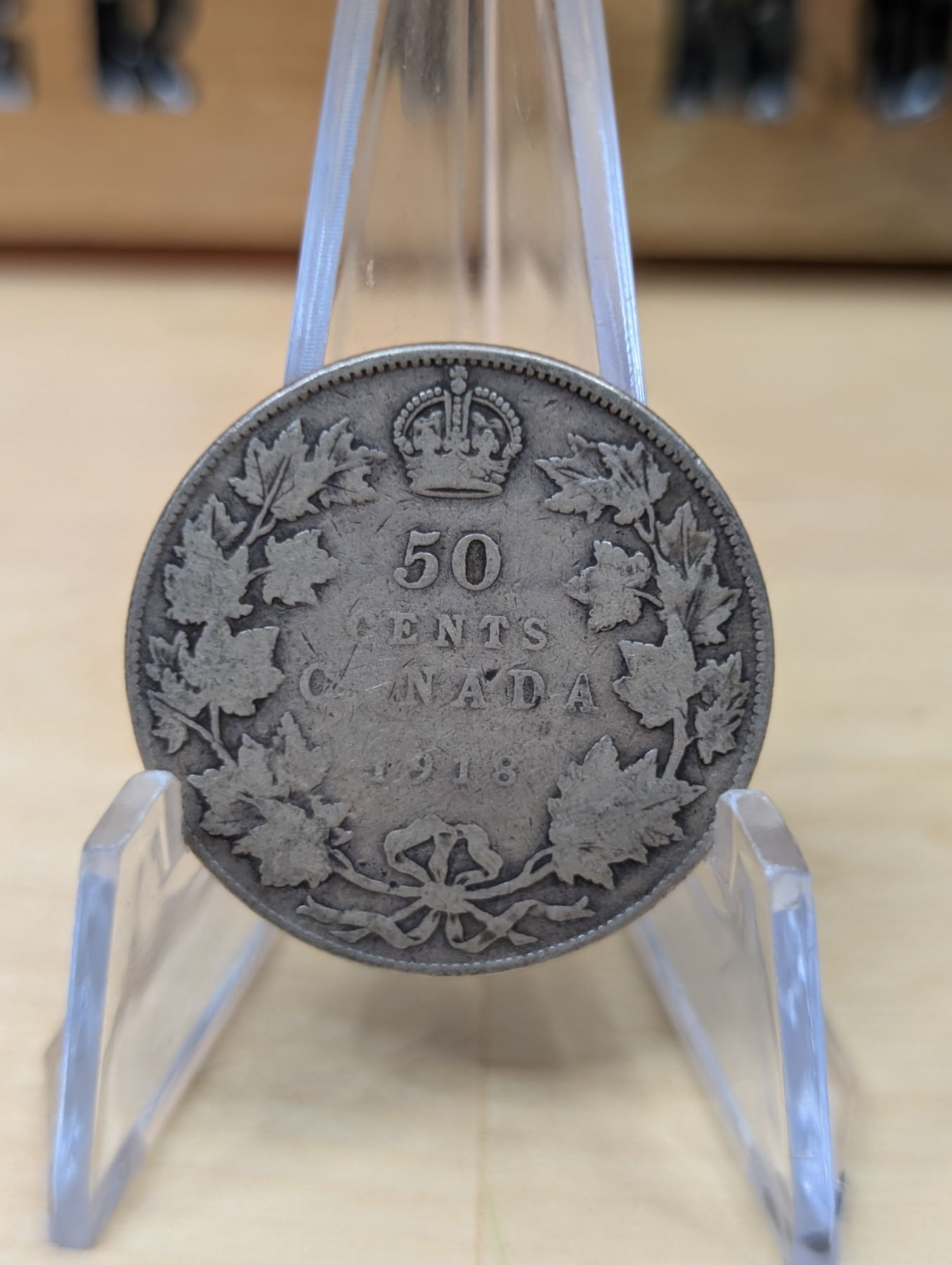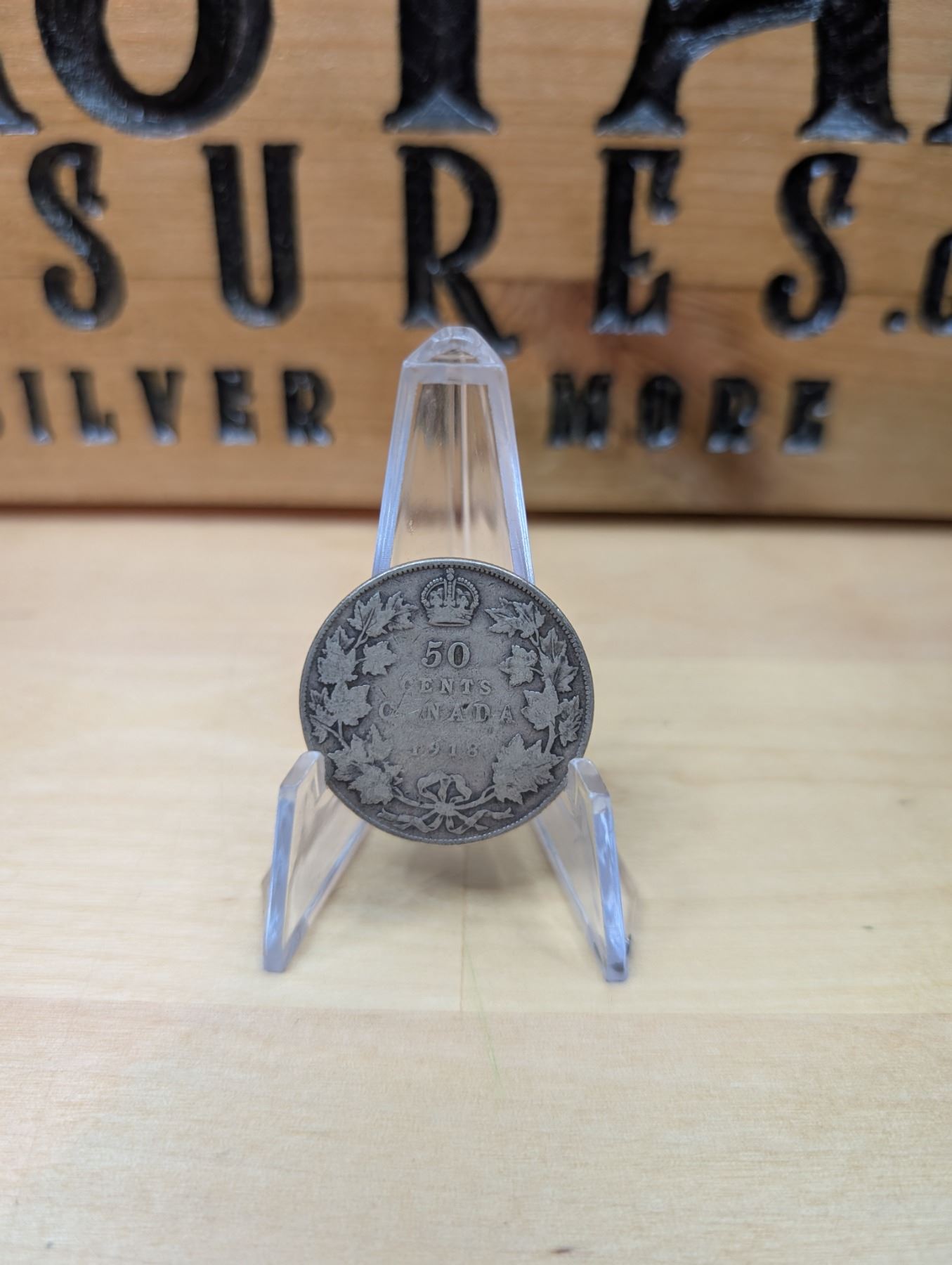 The 1918 Canadian Silver 50-cent coin is made of 92.5% silver and 7.5% copper, with a weight of 11.6 grams. It features the effigy of King George V on the obverse and the Canadian coat of arms on the reverse. This coin was minted during World War I and is part of the Canadian half-dollar series. It is highly valued by collectors due to its age, silver content, and historical significance. The 1918 50-cent coin is relatively scarce in higher grades, making it sought after in the numismatic market.